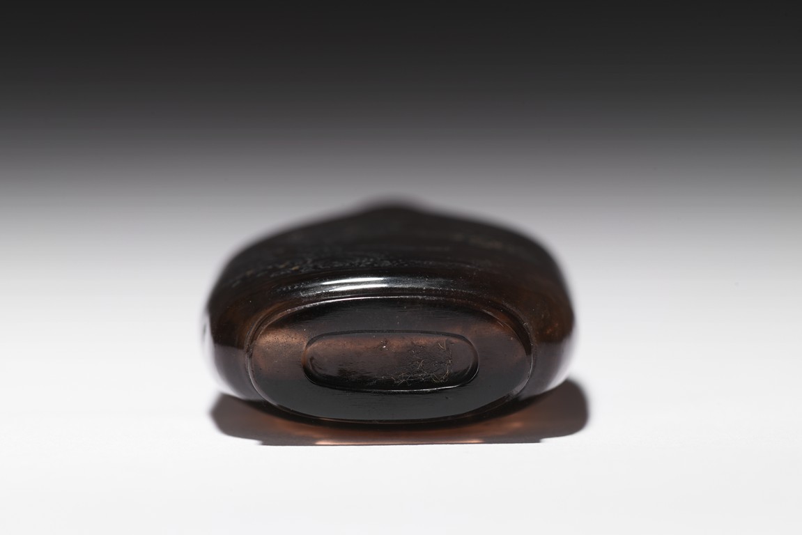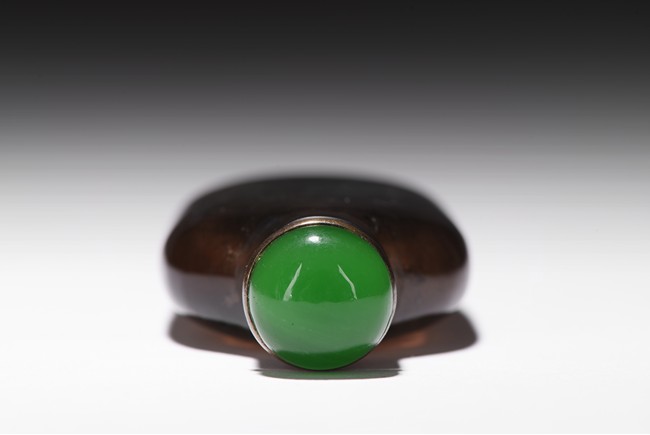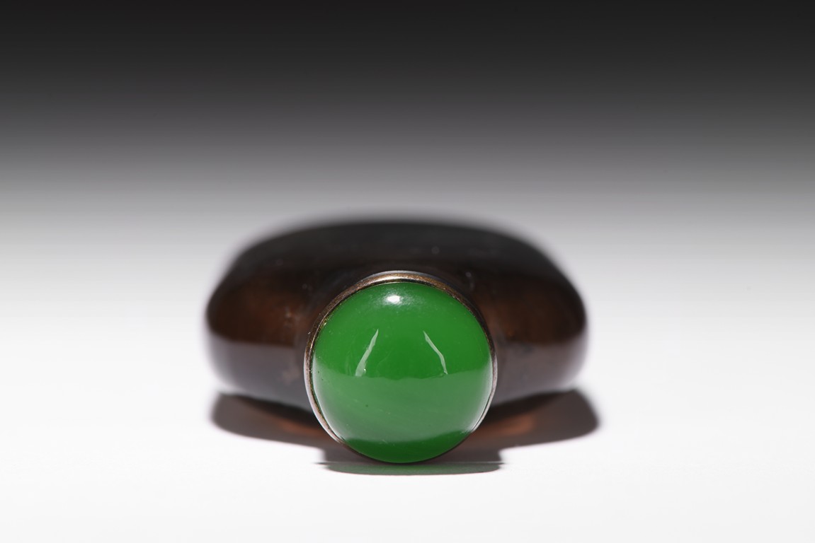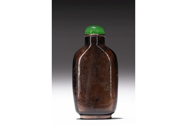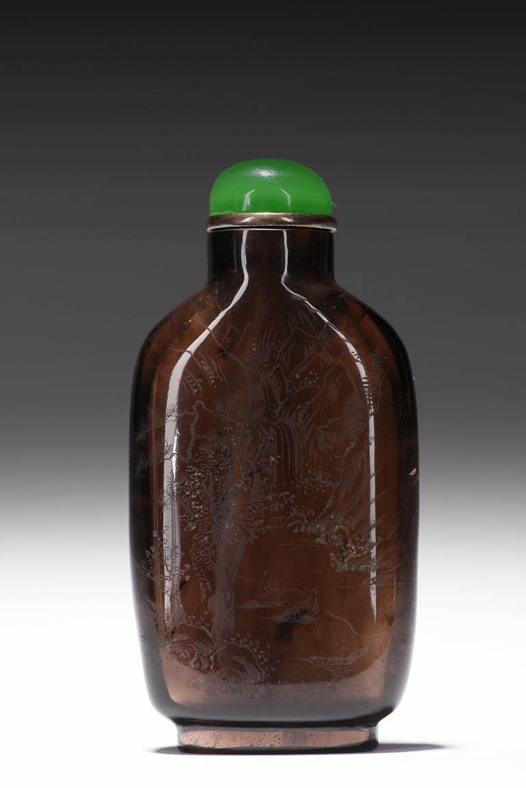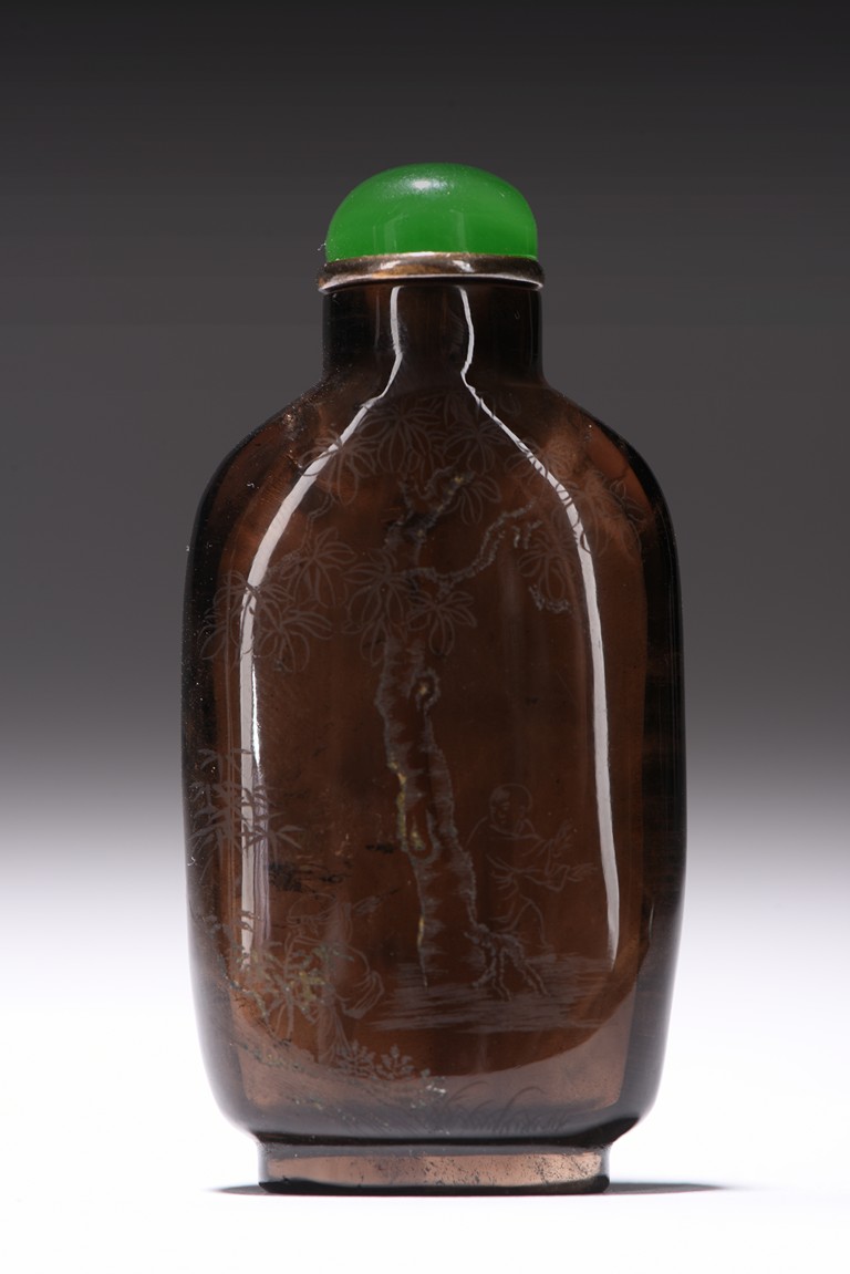 Of flattened rectangular form, finely carved on the front and back with figures under large tall trees, the glass of polished semi-translucent citrine tone, with fitted apple green stopper.