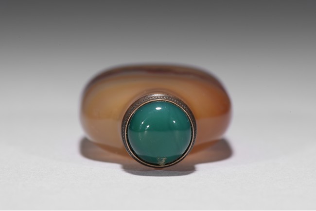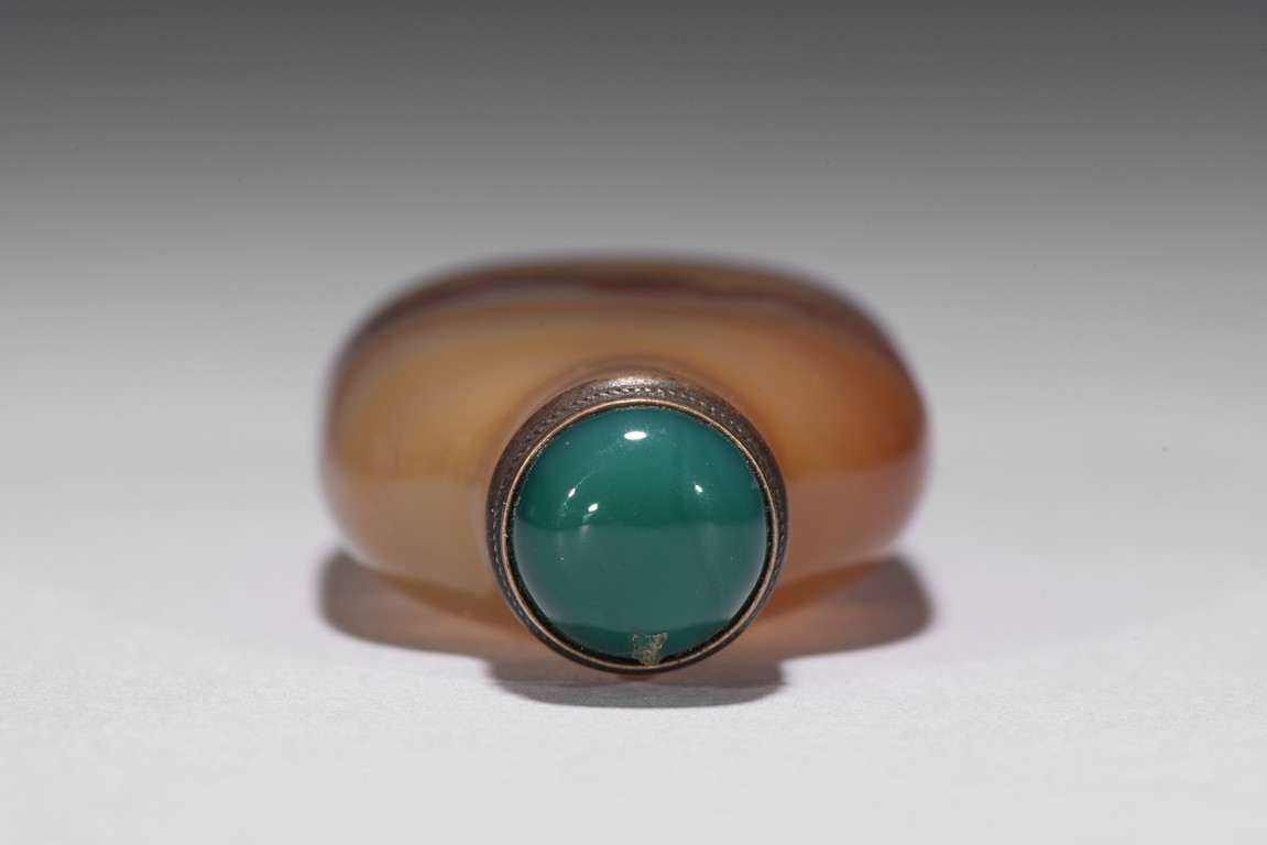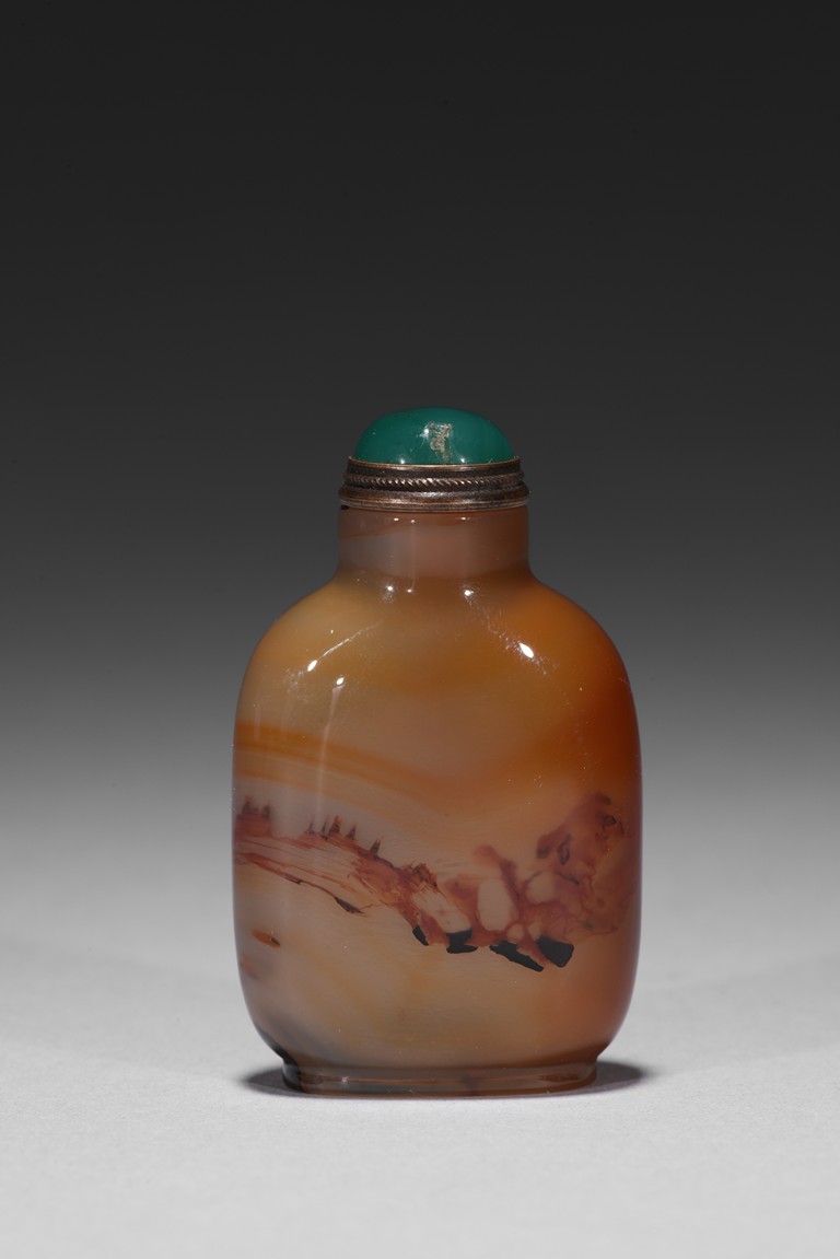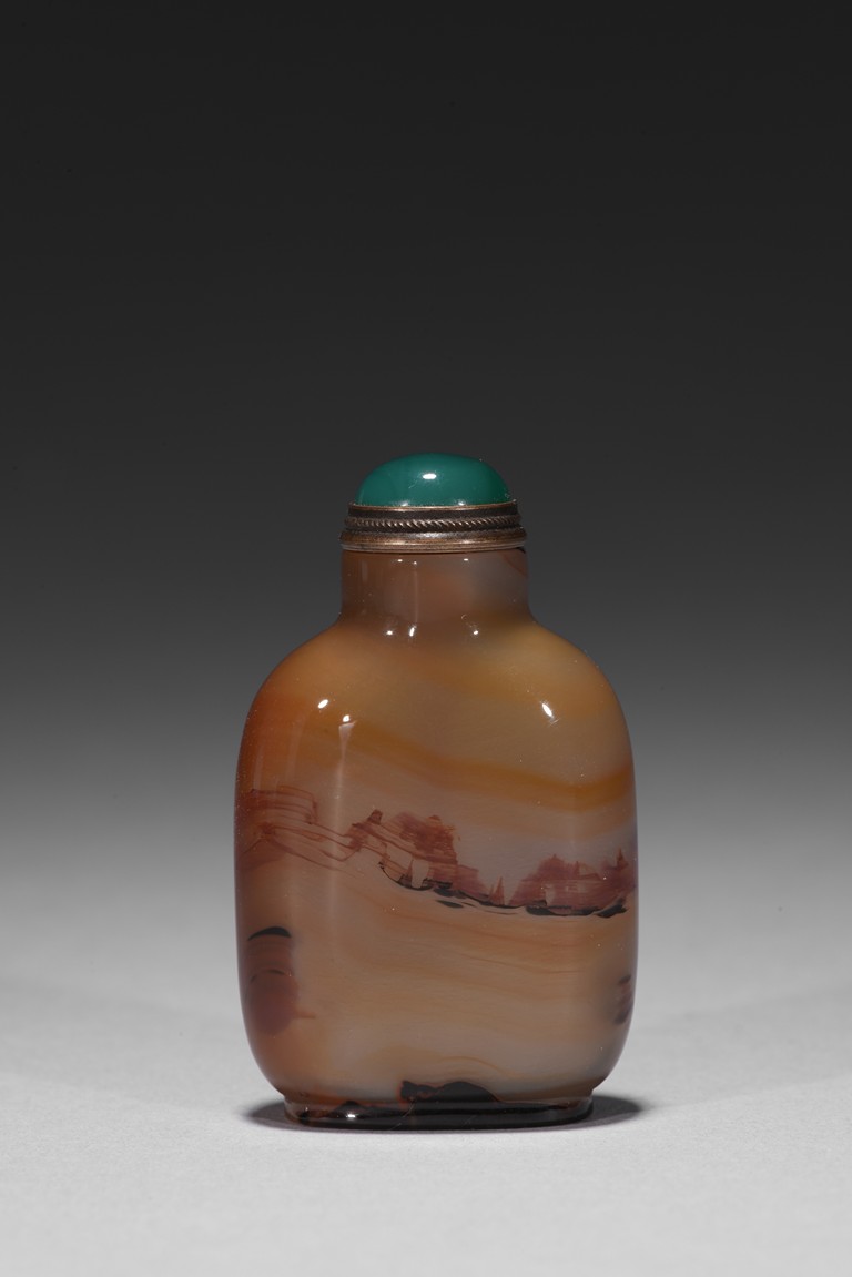 Very well hollowed, of rounded rectangular form sloping to a cylindrical neck, resting on an oval foot, around the foot rim with dark brown inclusion patches, in the middle part with probably landscape shadows in dark-brown and russet tone between light yellow and caramel-brown lines inclusion.