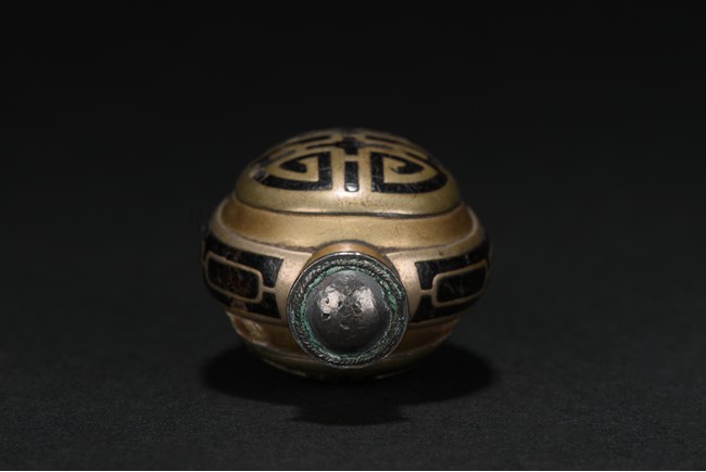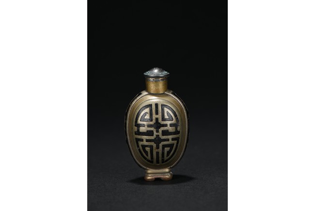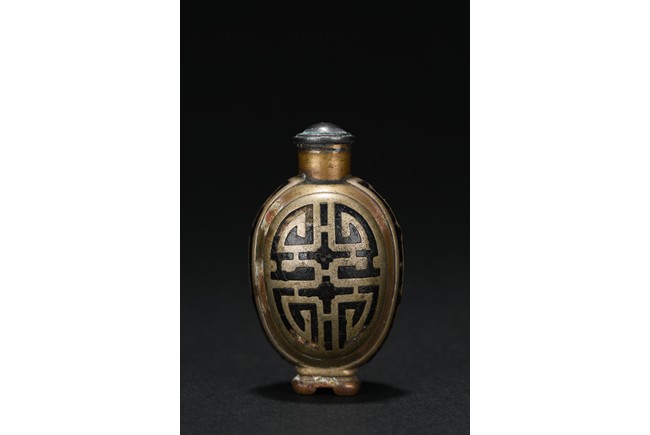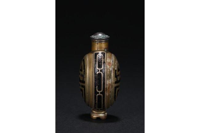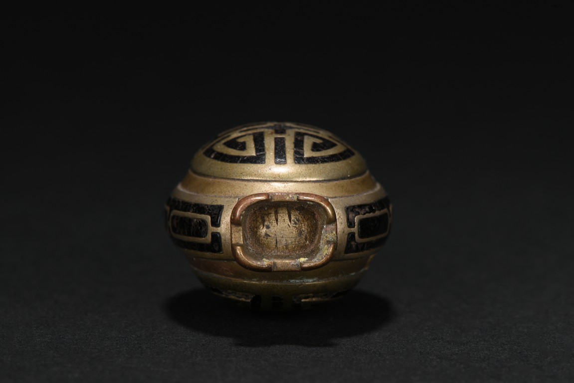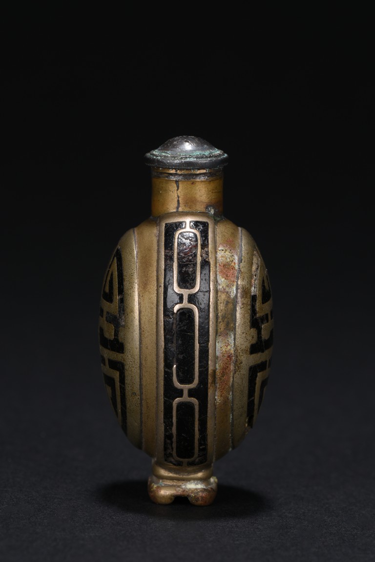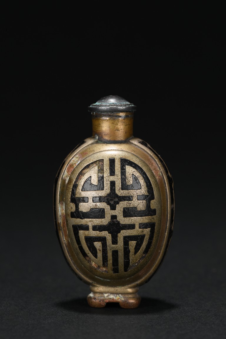 Of slightly rounded ovoid form, with smoothly rounded shoulders rising to a cylindrical neck and lipped mouth rim, each face inlaid with an oval brass border panel enclosed a stylized character in copper reserved on dark backgrounds, the narrow sides decorated with three small rectangular pattern in copper within a background band.