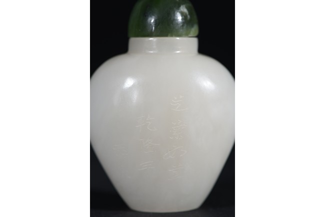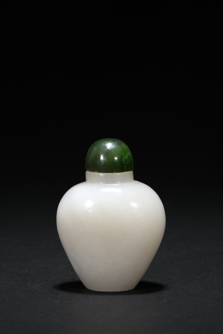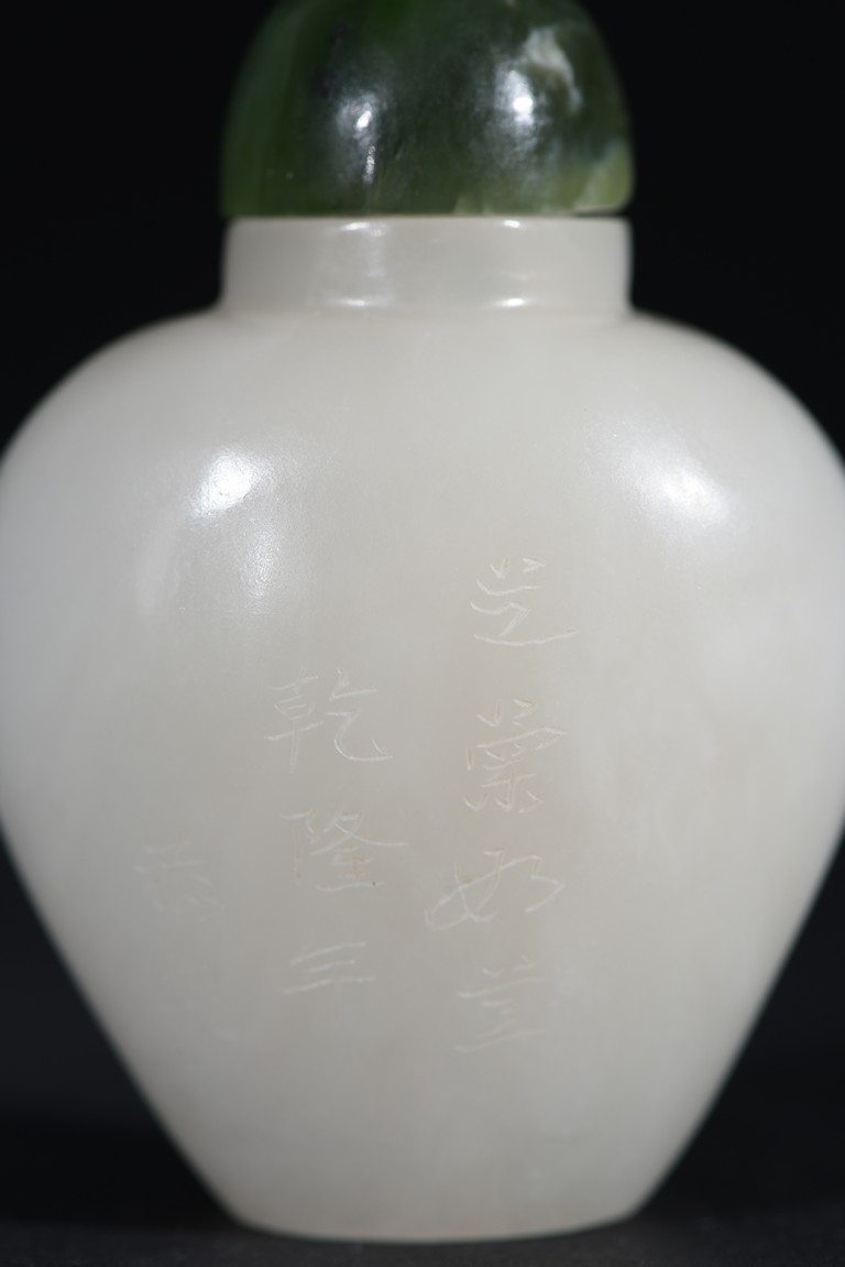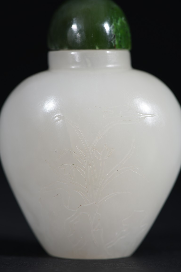 Rising to high shoulders, the snuff bottle is of ovoid form and carved in shallow relief with frondent orchid in front and the back carved with inscriptions of 'Qianlong Nian Zhi'. The body is of polished white tone with a green jadeite stopper. Qing Dynasty period.