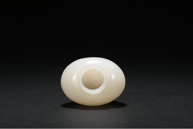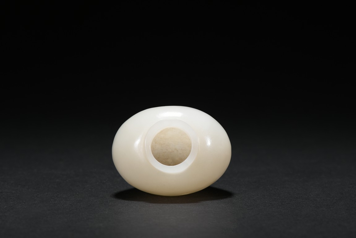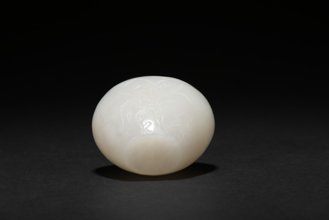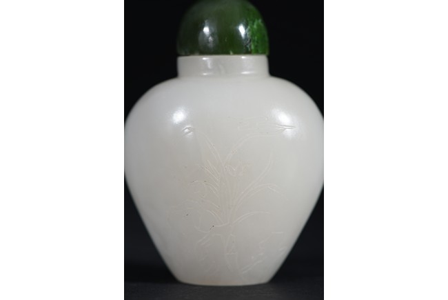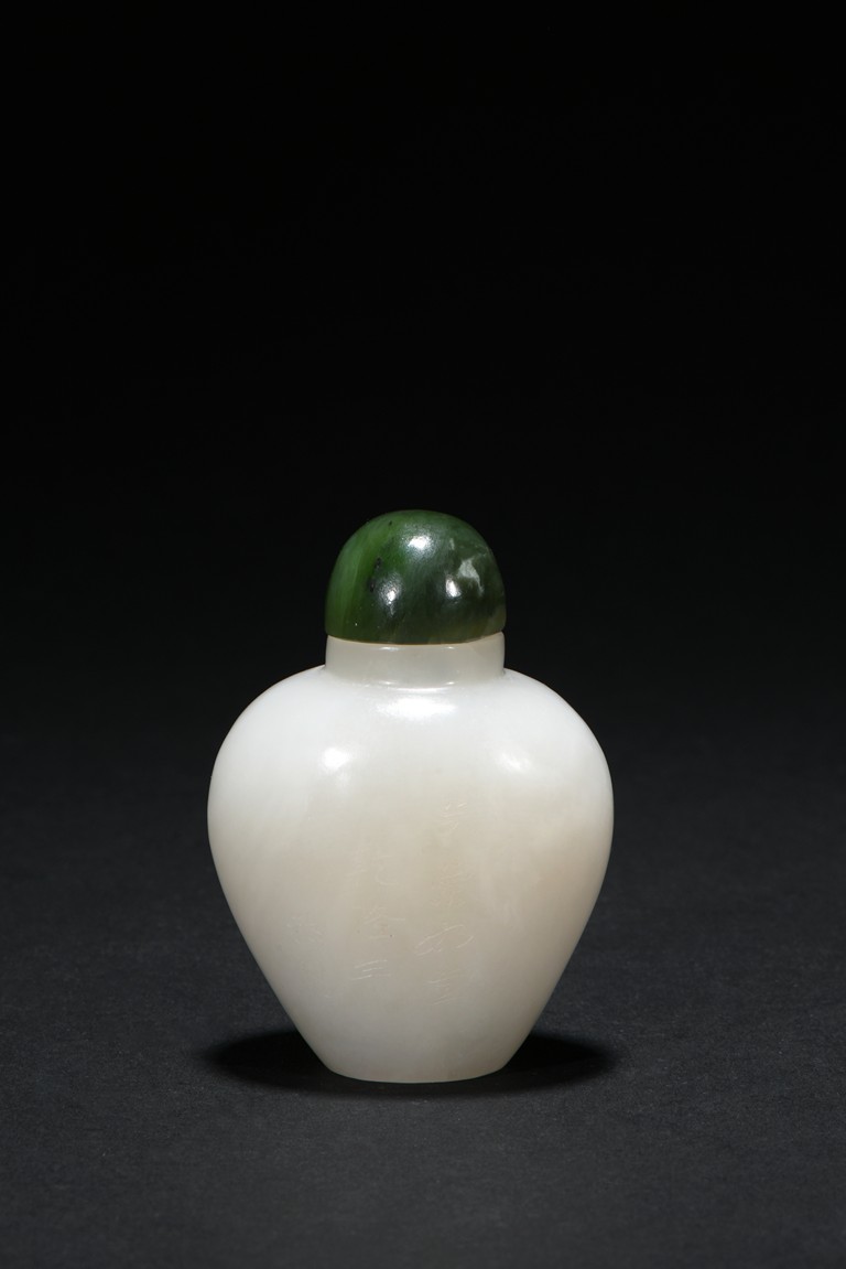 Rising to high shoulders, the snuff bottle is of ovoid form and carved in shallow relief with frondent orchid in front and the back carved with inscriptions of 'Qianlong Nian Zhi'. The body is of polished white tone with a green jadeite stopper. Qing Dynasty period.