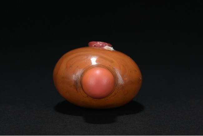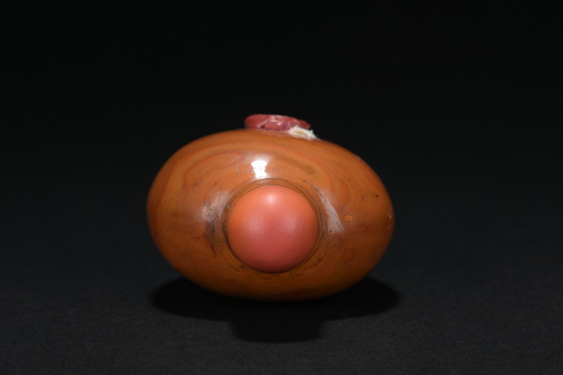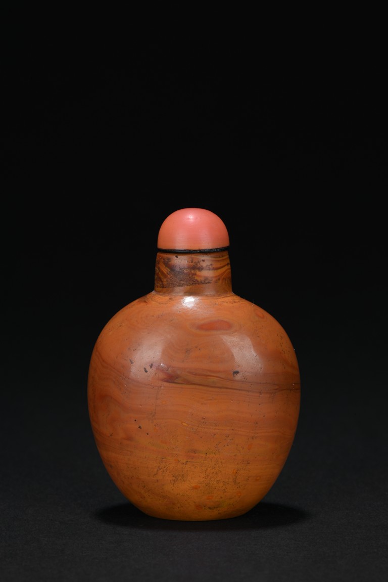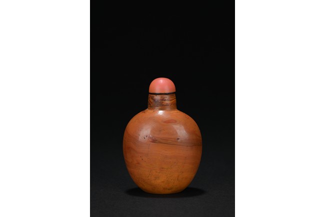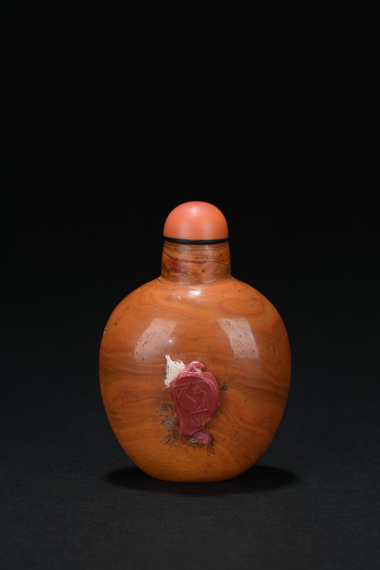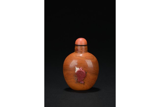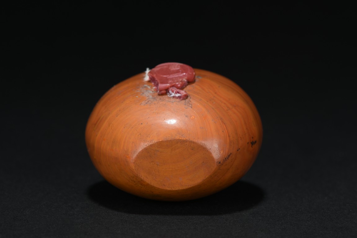 Of ovoid form, the opaque swirled orange glass with a few brighter red and yellow speckles around the body, with a neatly-formed foot and a tinted red and dark-brown straight neck, on one side of the body decorated with a red overlay character mark.