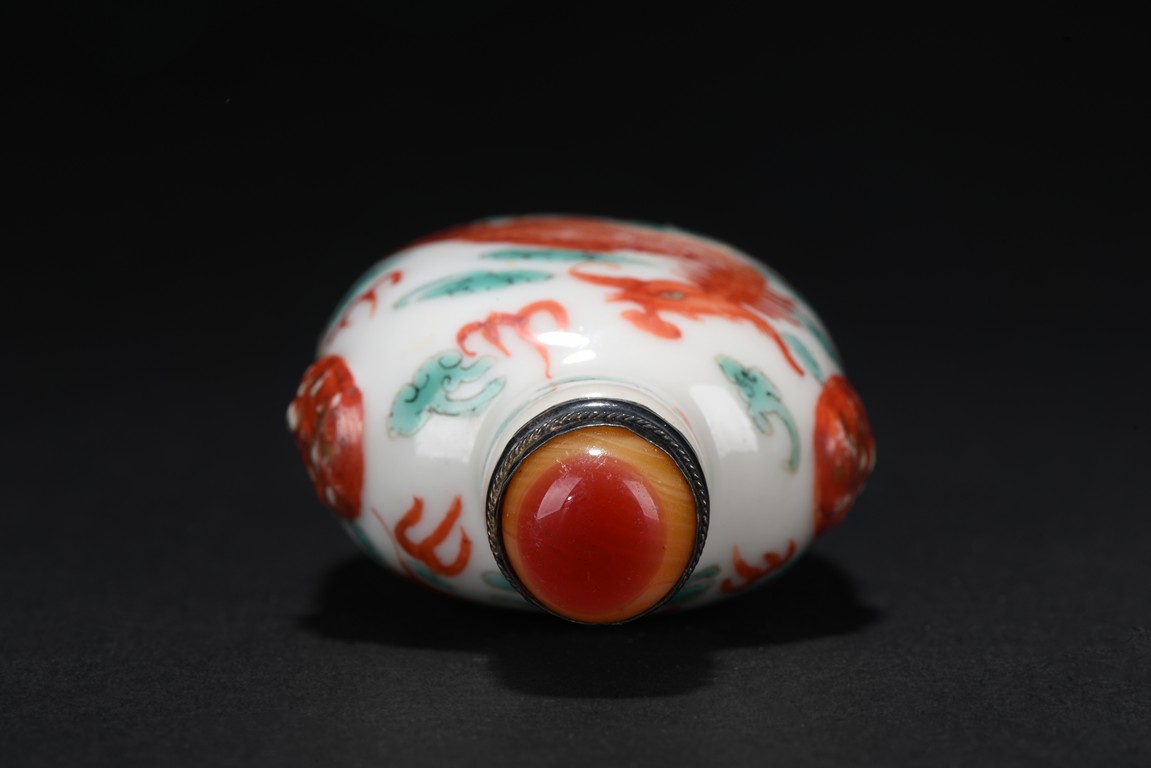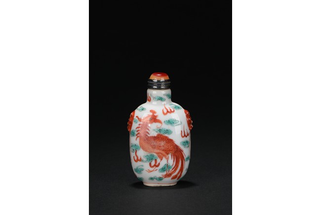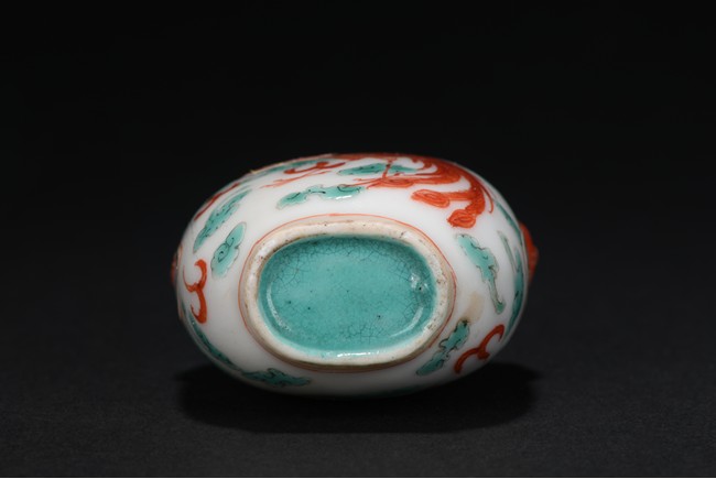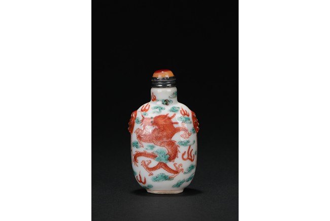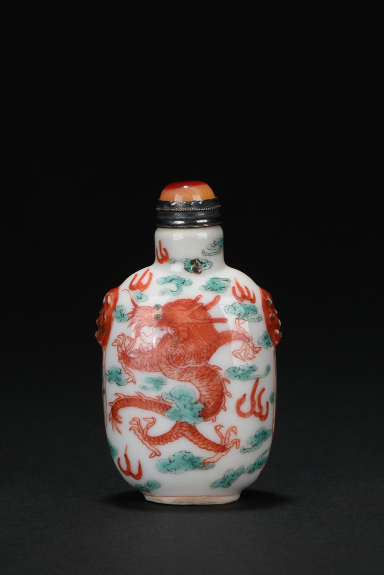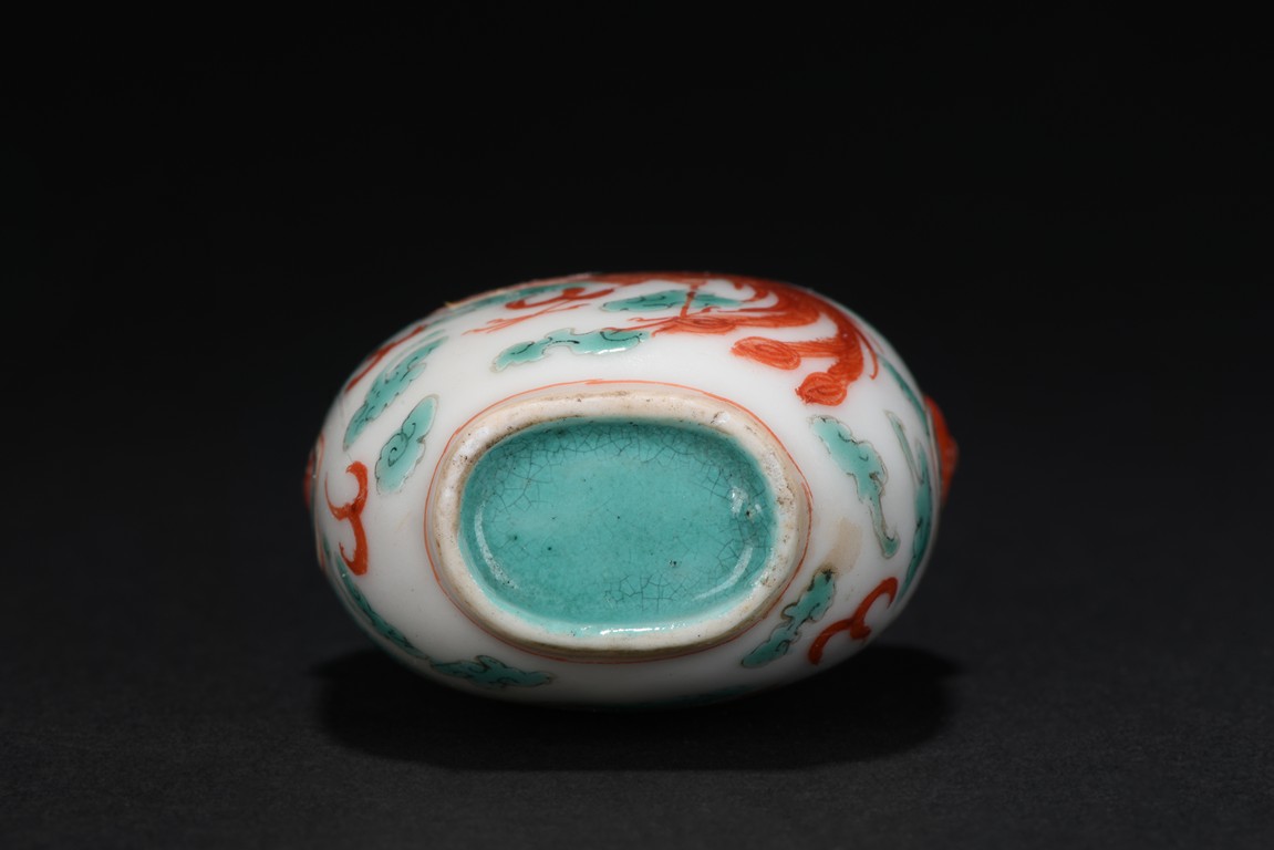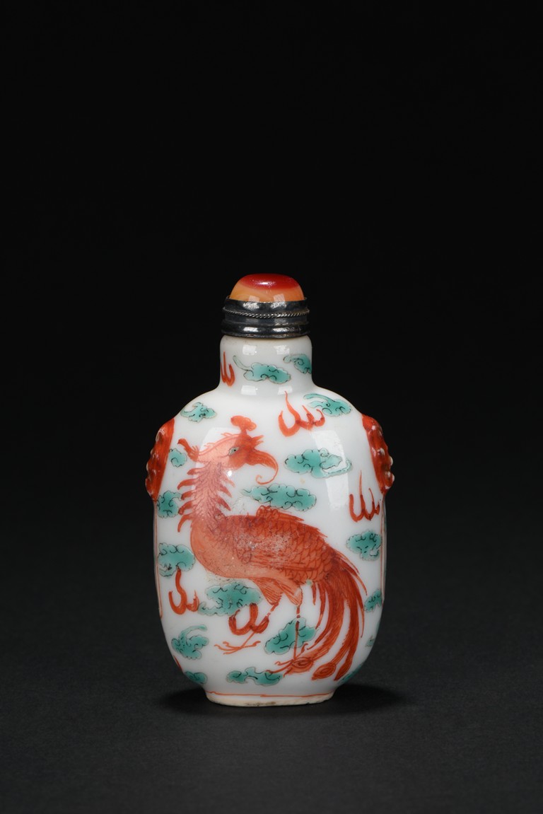 Of flattened rounded rectangular form, painted in a vivid famille rose palette with a large standing phoenix on one side and a large winding dragon on the other side, all reserved on white glaze decorated with light blue glaze cloud scrolls.