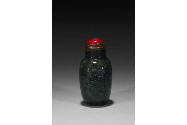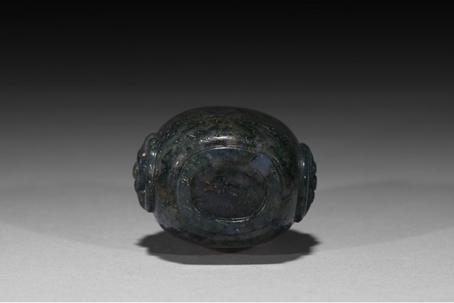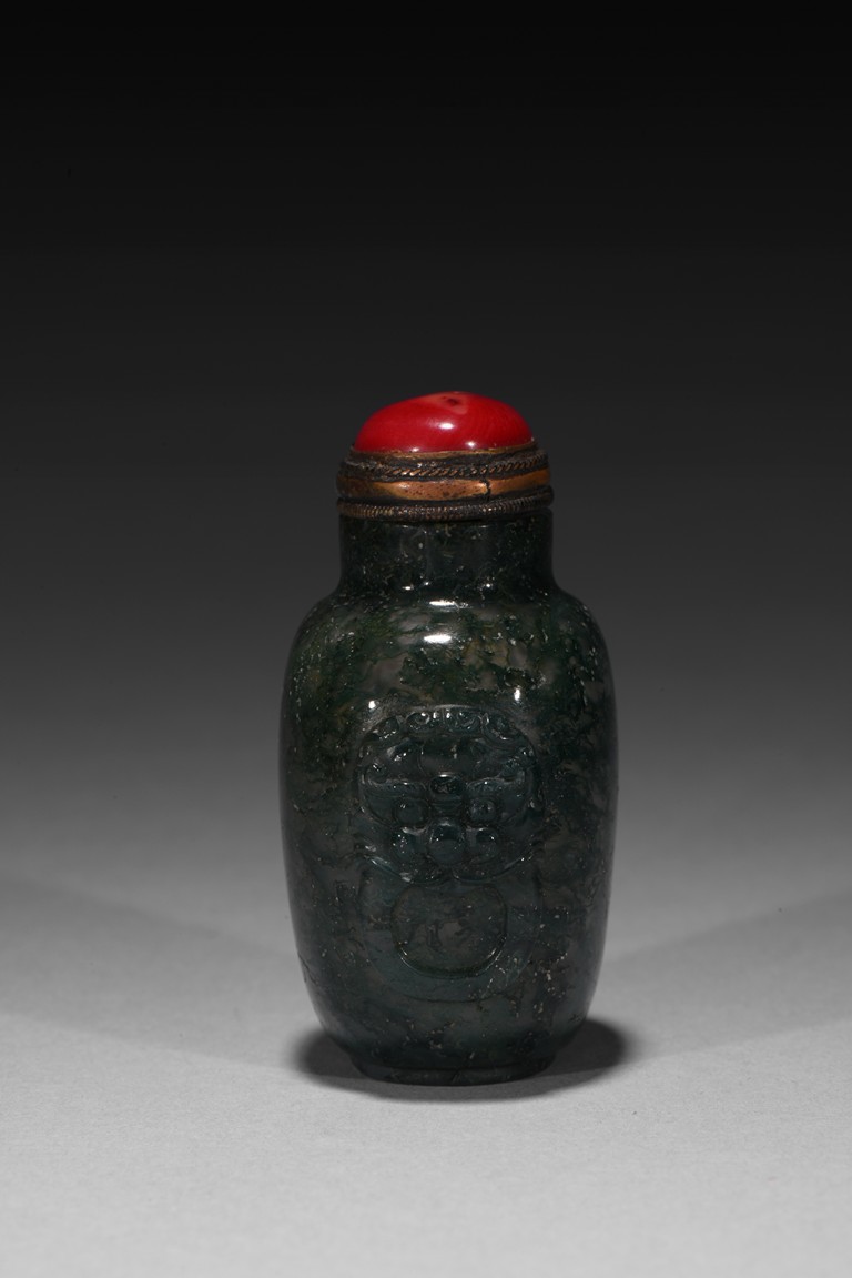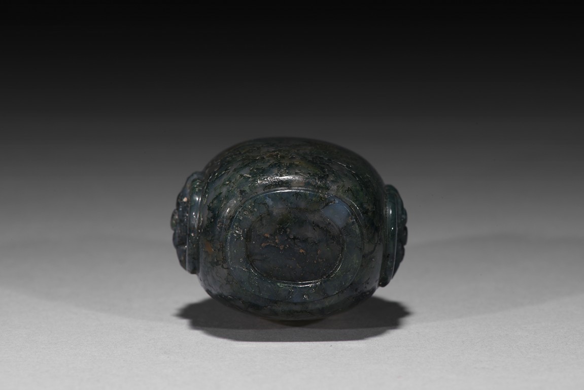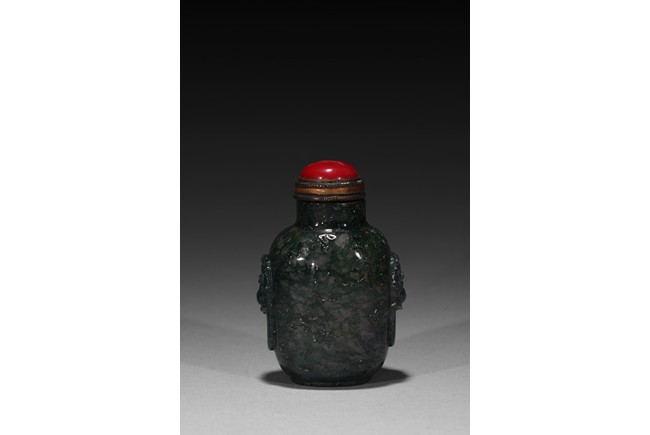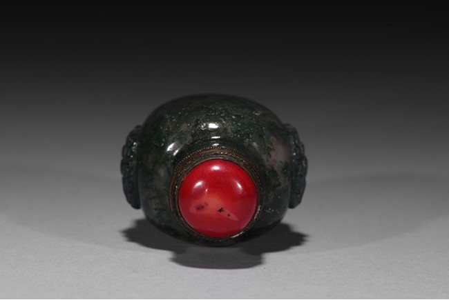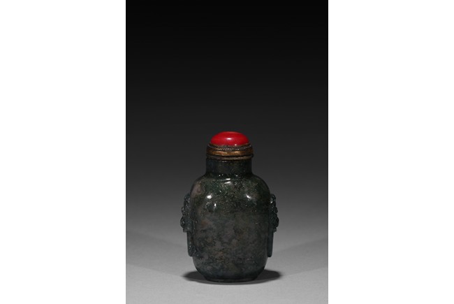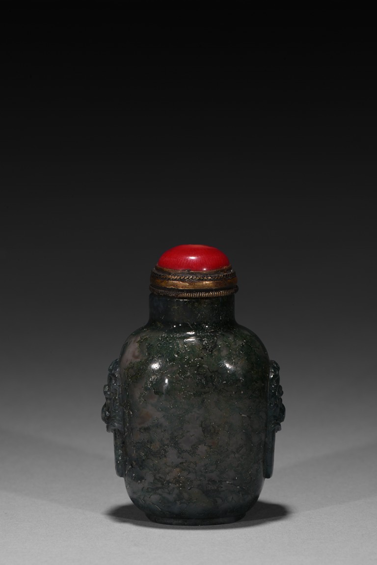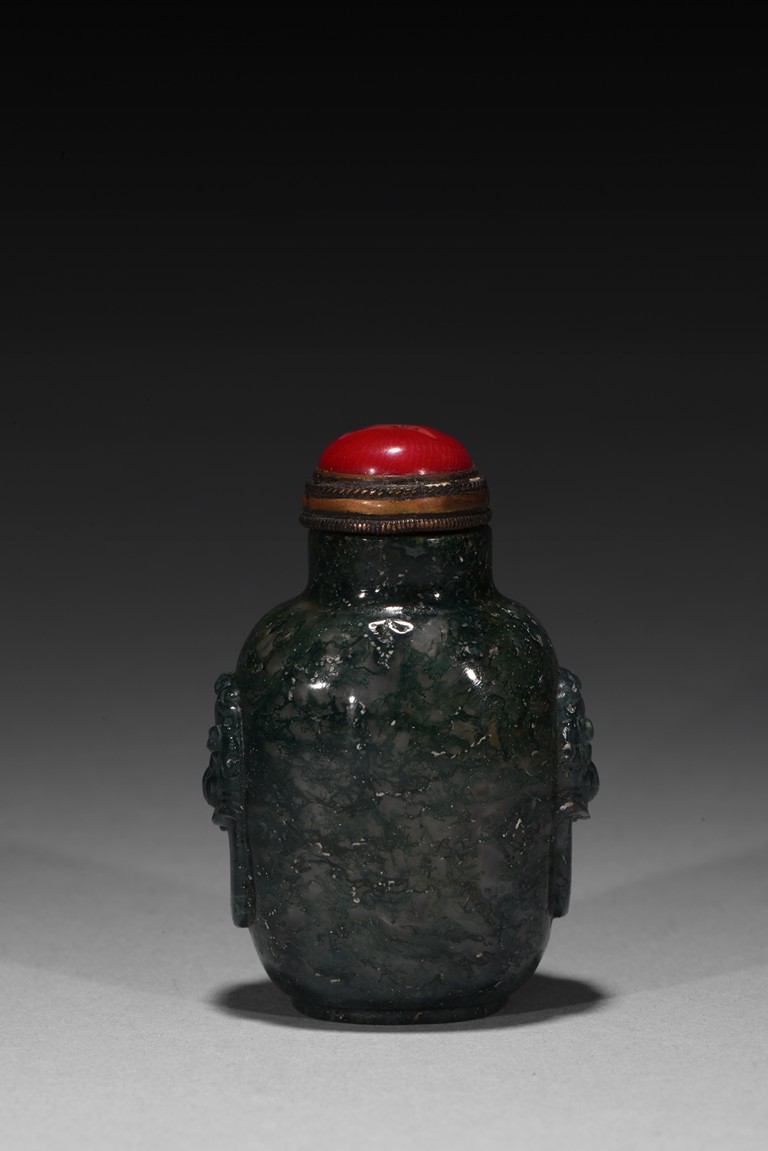 Of small cylindrical form, overall suffused with dense, dark green, moss-like inclusions and combined with irregular spotted white dots, the shoulder flanked by pair of beast masks with rings in relief, with straight neck and red bead stopper.
