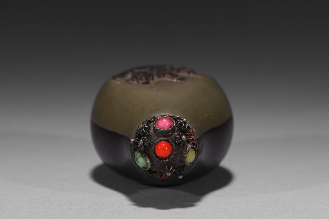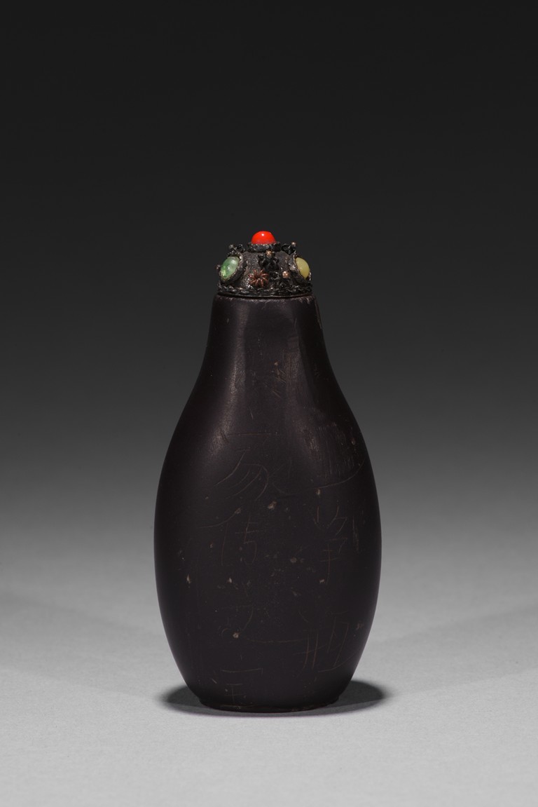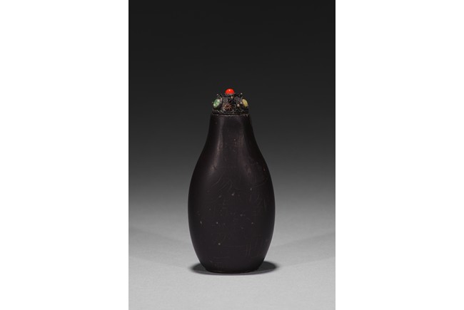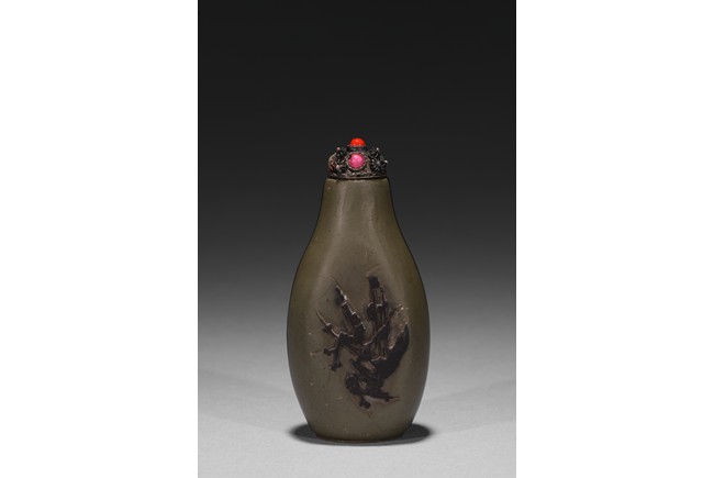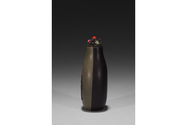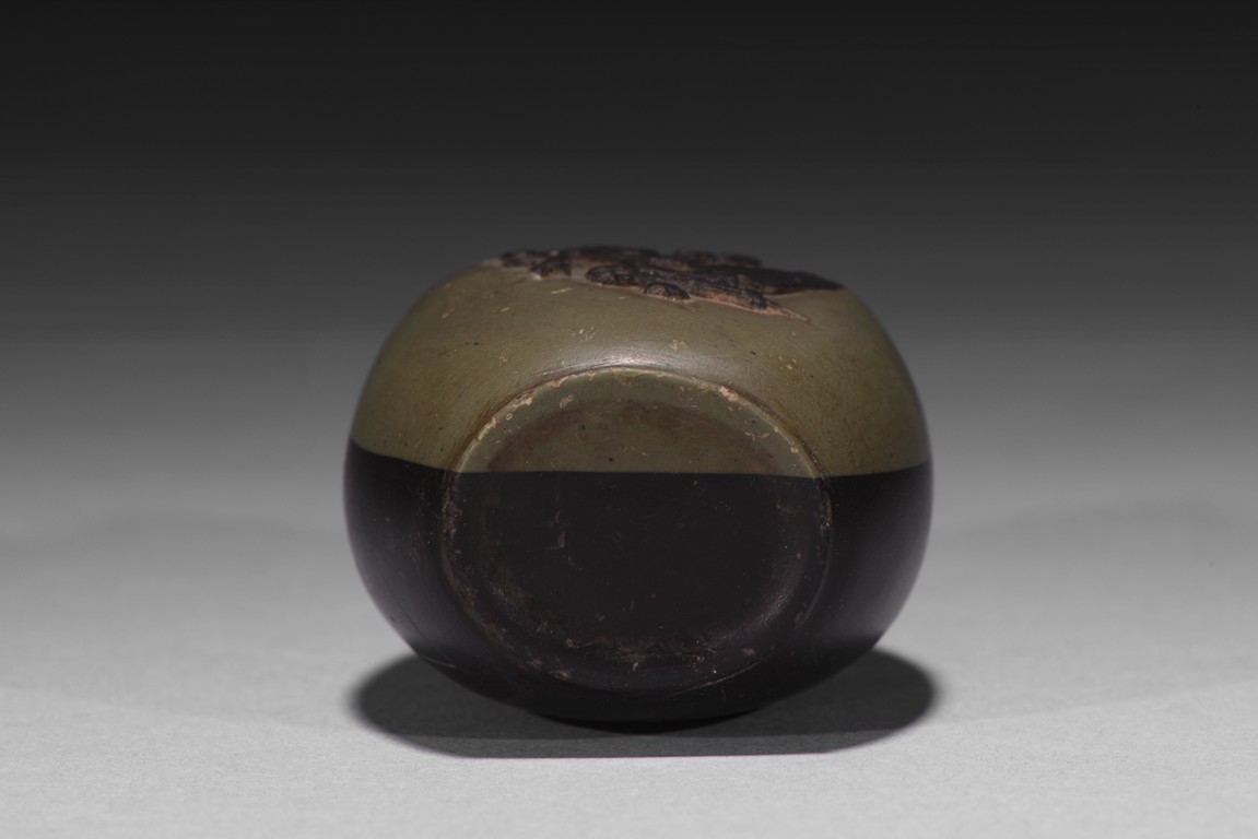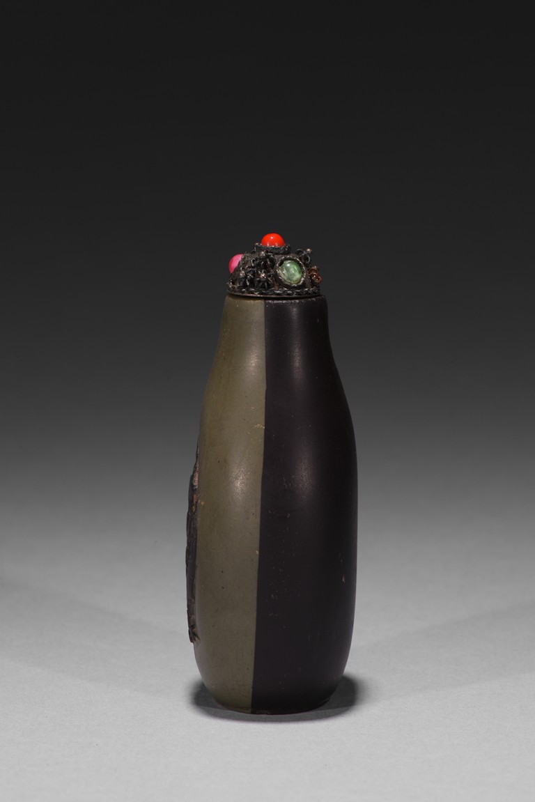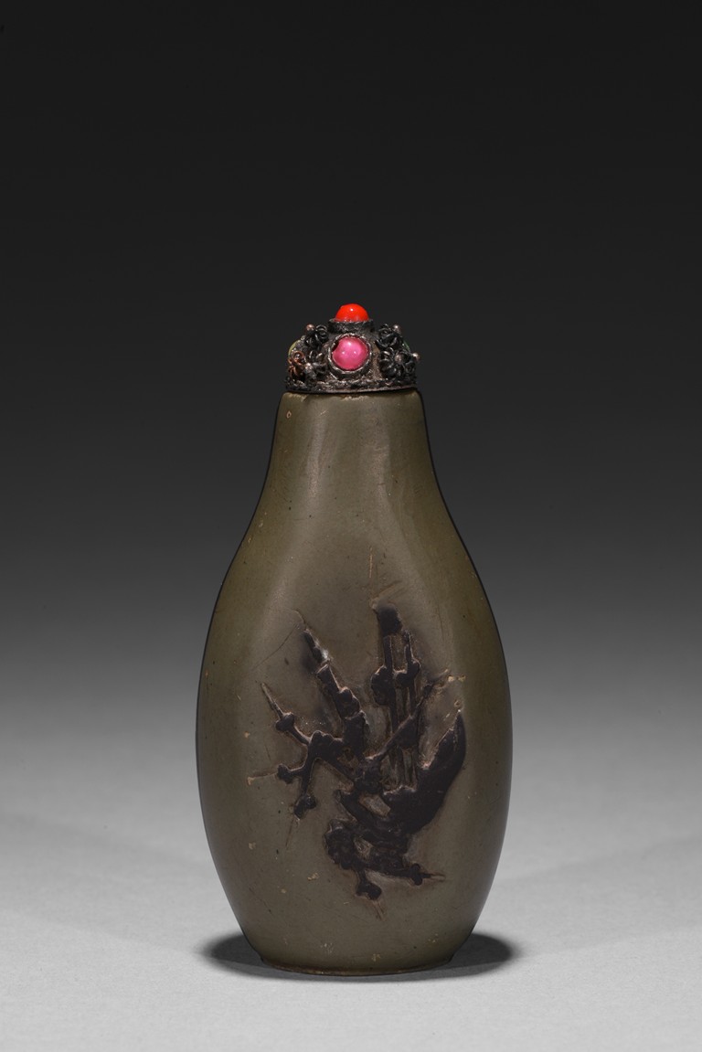 Of slender pear-shape form, carved plum branches issuing from rockwork in black tone in relief reserved on greyish green ground, the back half covered with black tone ground, raised on flat recessed foot.
