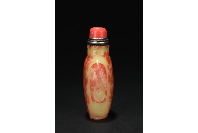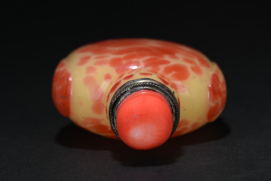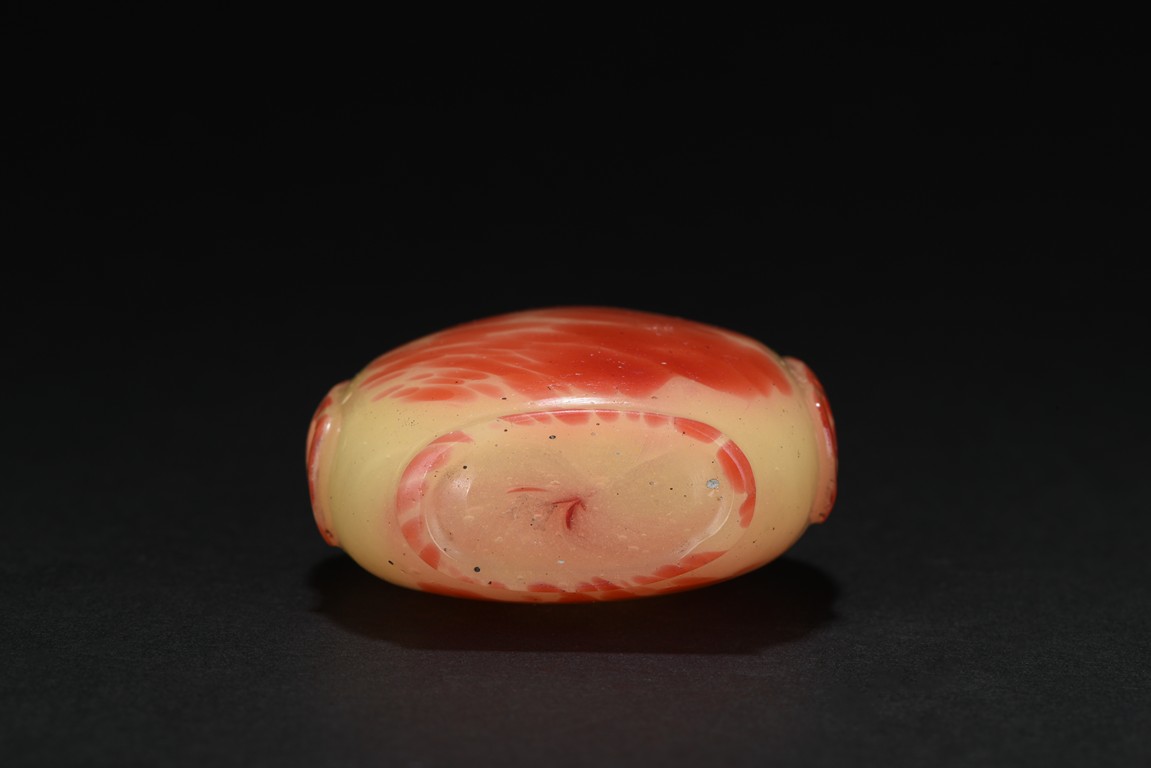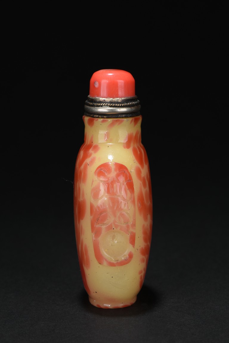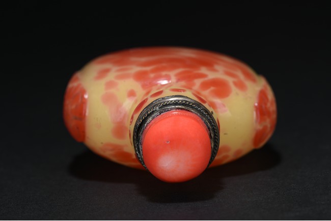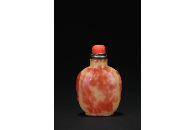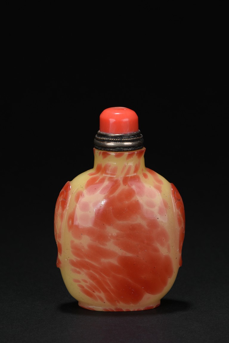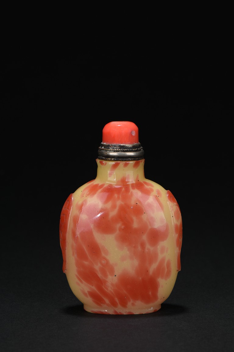 Of rounded rectangular form, the light yellow class body tinted with irregular orangish red patches,the shoulder flanked by pair of large beast-mask in relief, with short straight neck and fitted vermilion tone stopper.