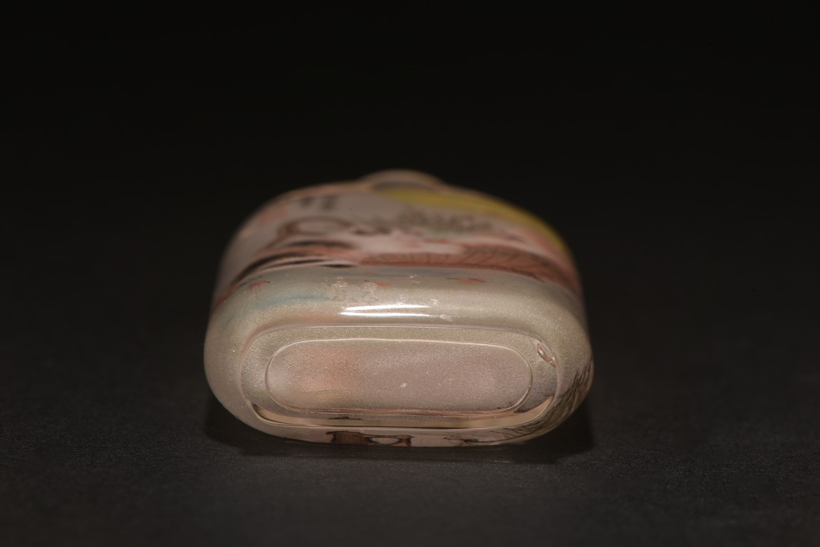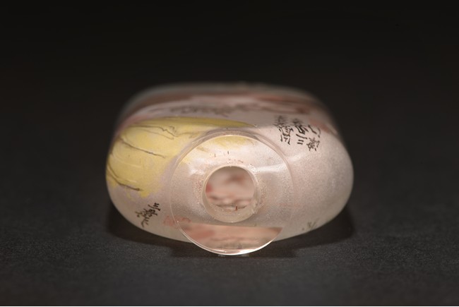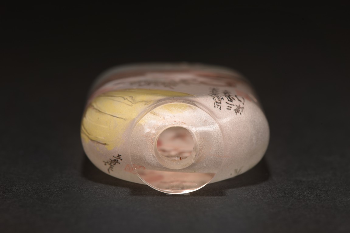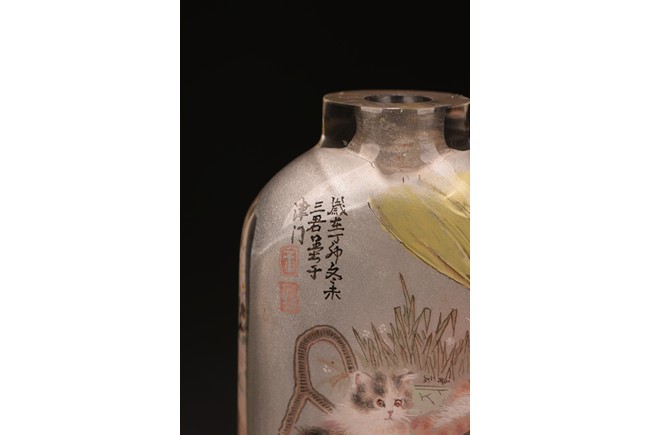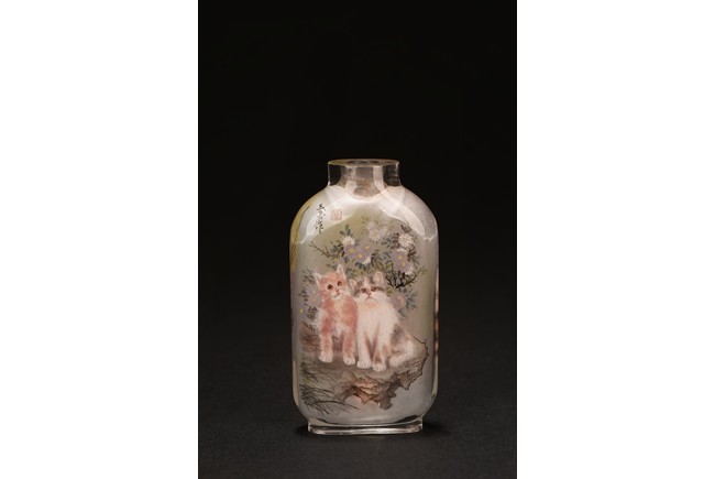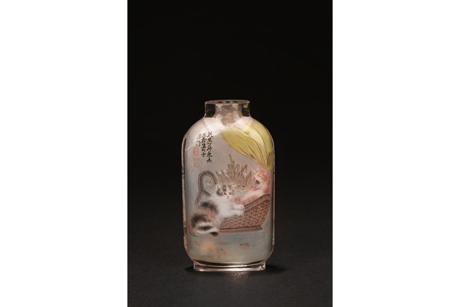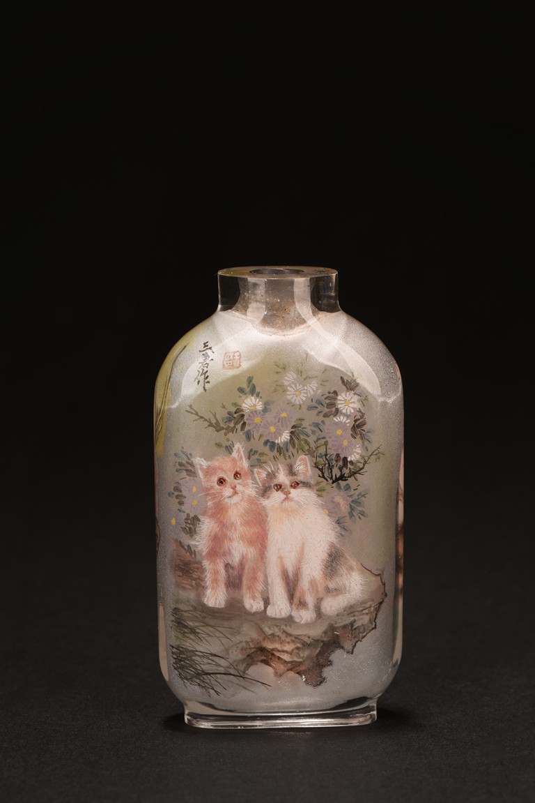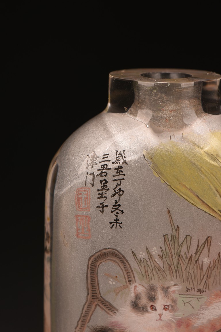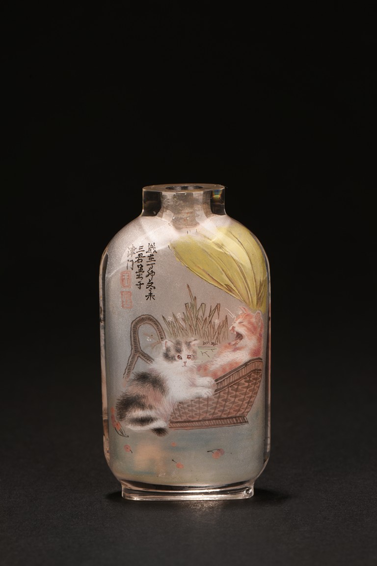 Raised on flat oval foot rim, the front of rounded rectangular body finely painted with two cute cats standing on rockwork amidst flourish bush, the reverse with a lovely white cat with brown and black patches leaning against one side of the basket and a orangish brown tone cat with astonished expression, two sides of the snuff bottle with inscription and seals.