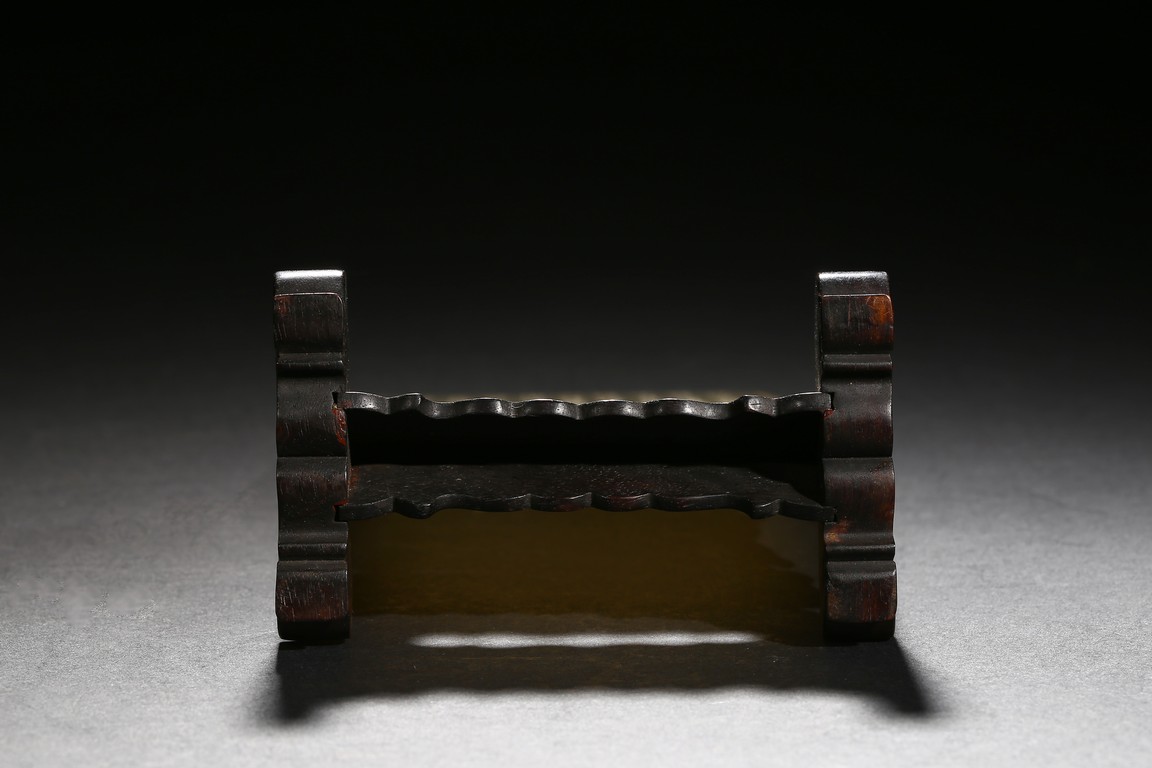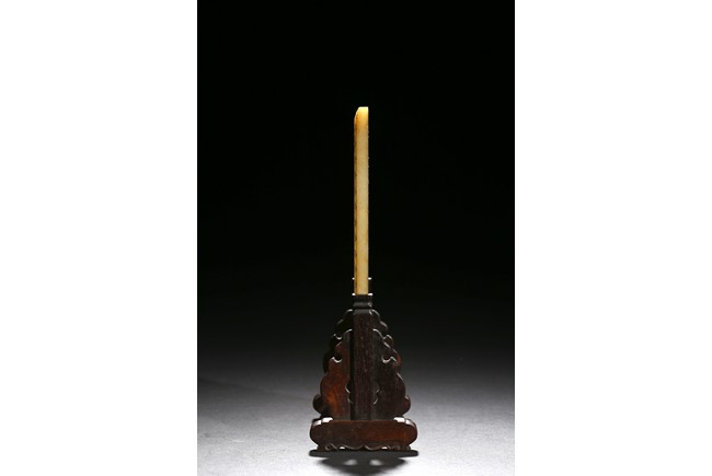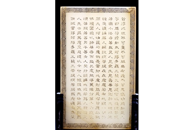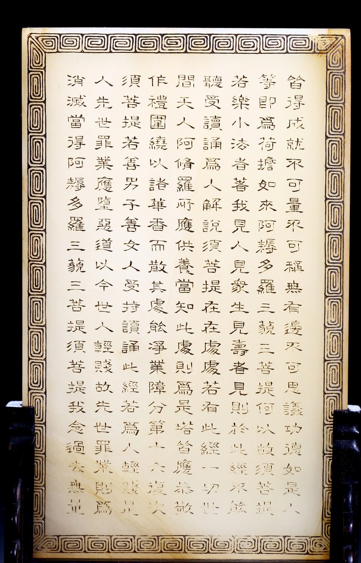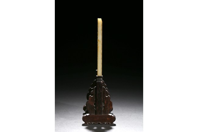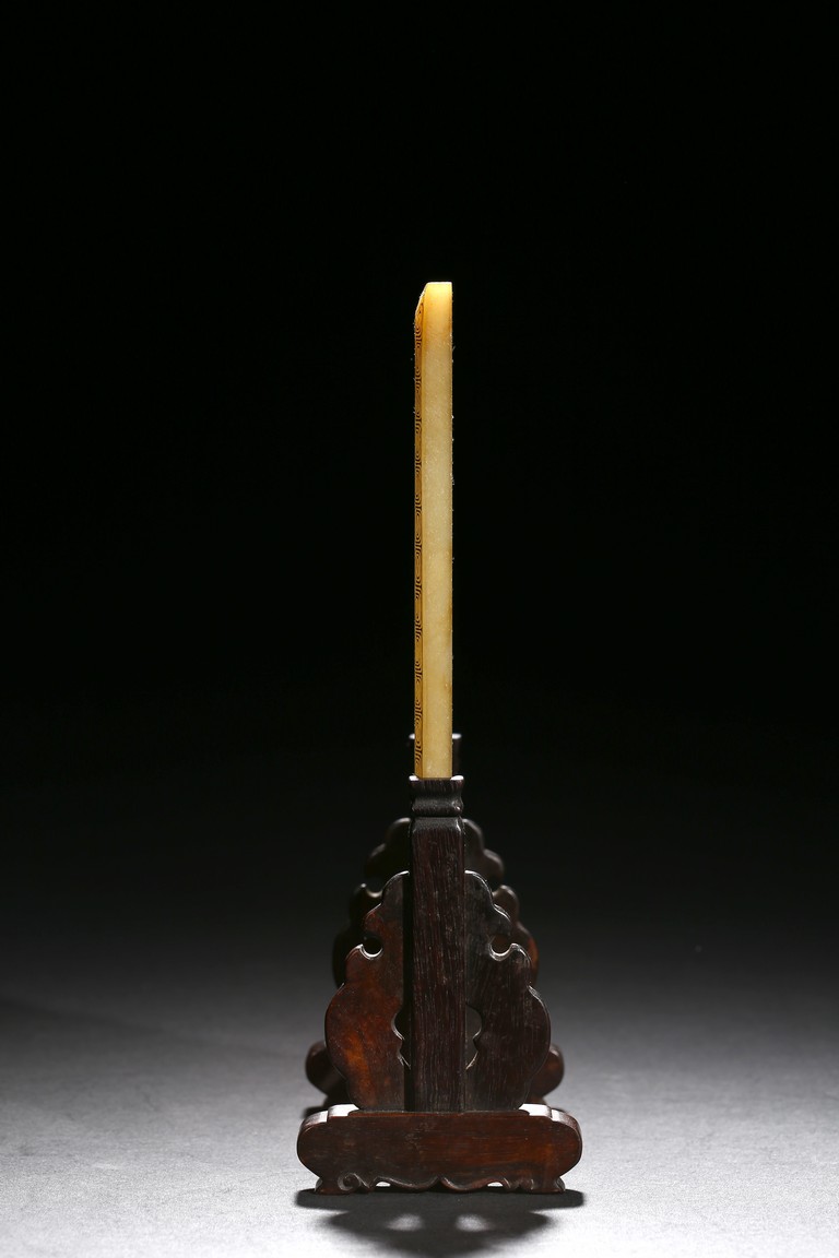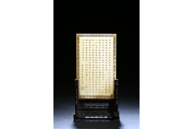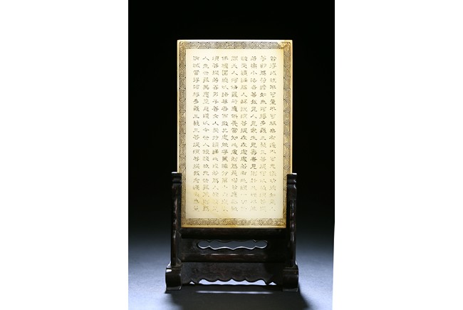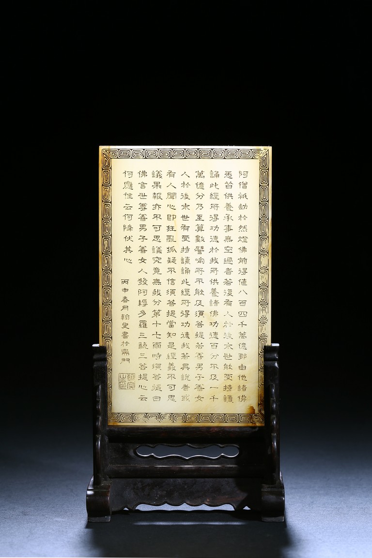 The jade screen delicately carved with poem inscription on both sides, with a key fret border along the rectangular side. Qing Dynasty period.