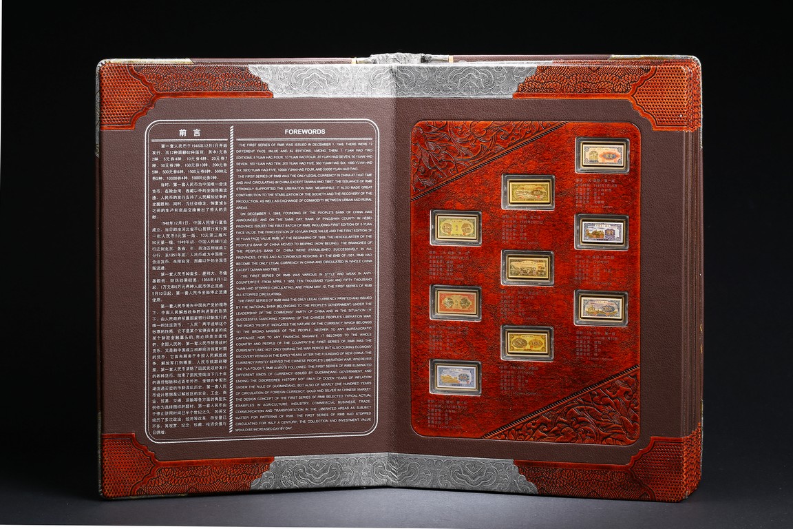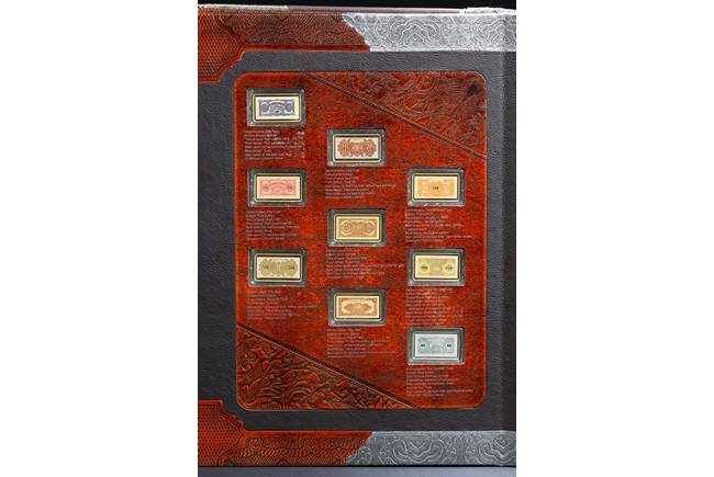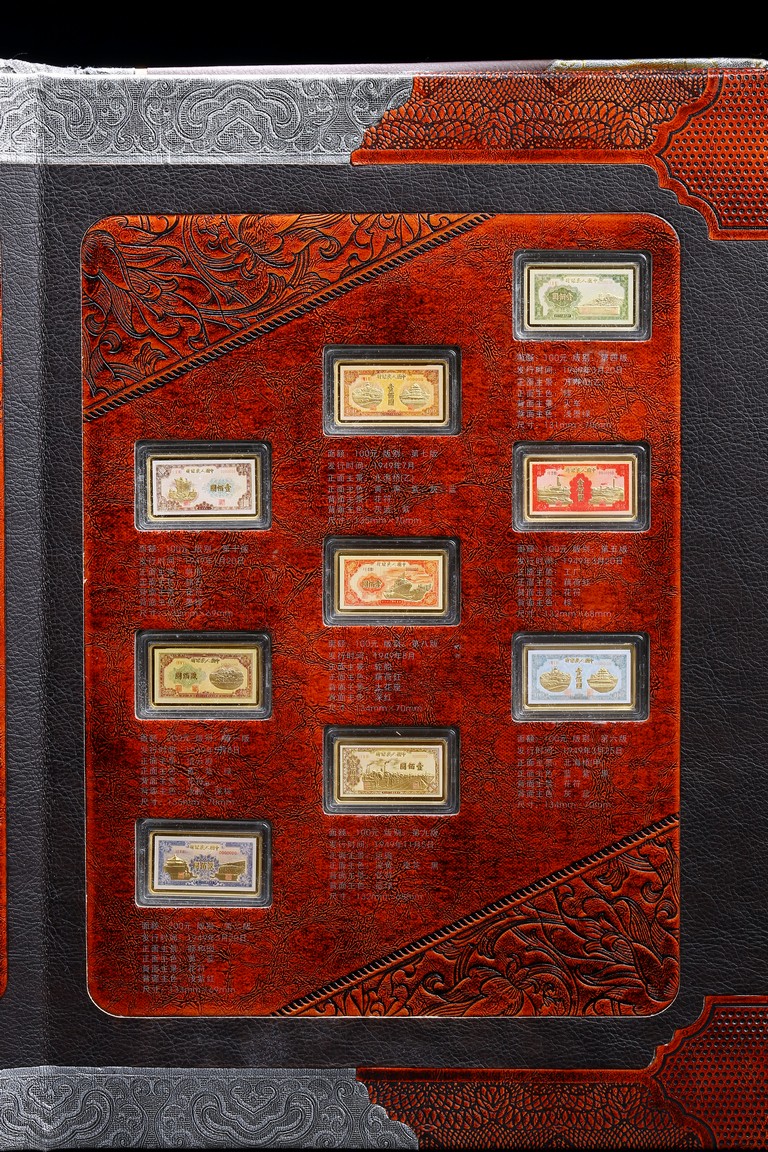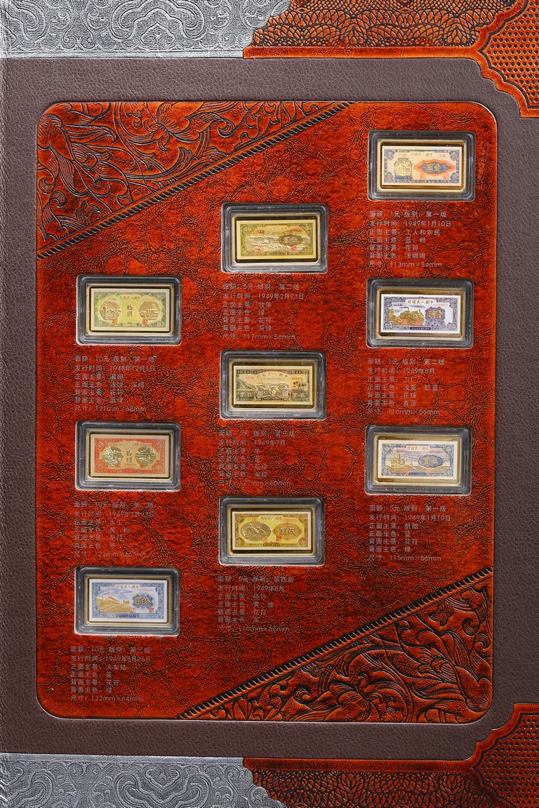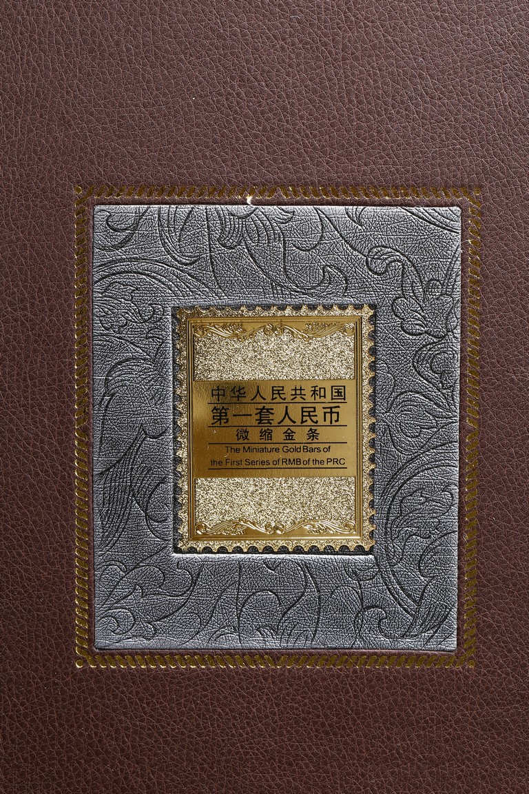 由中國印鈔造幣總公司於2009年製作, 此套微縮金條採用620克純金, 將中華人民共和國發行的第一套法定國家貨幣(1948 - 1953) 共12種面額, 62種版本的圖案微縮再現於62枚金條之上。限量發行8000套, 此套編號為3552/8000. 來源:洛杉磯華裔藏家提供