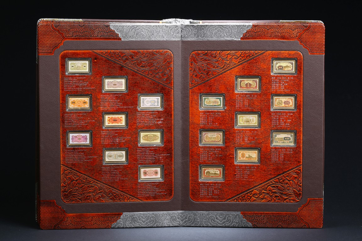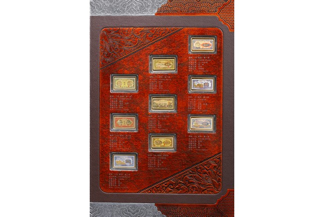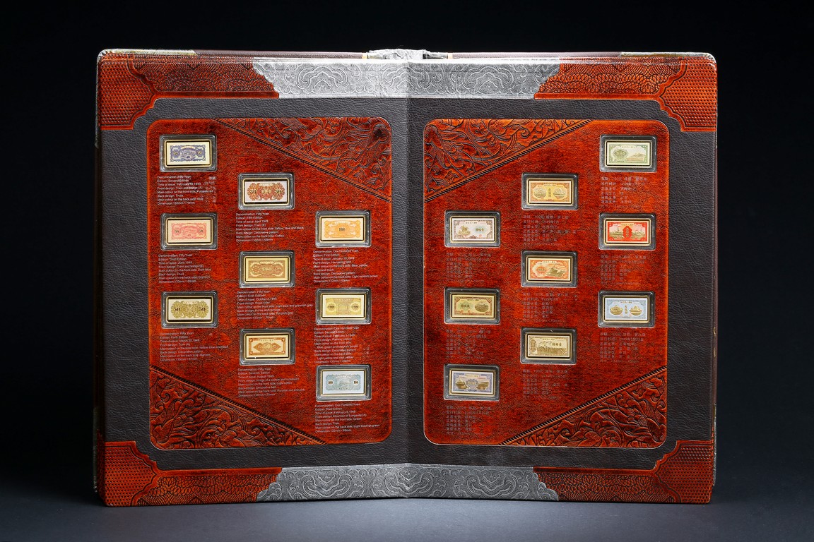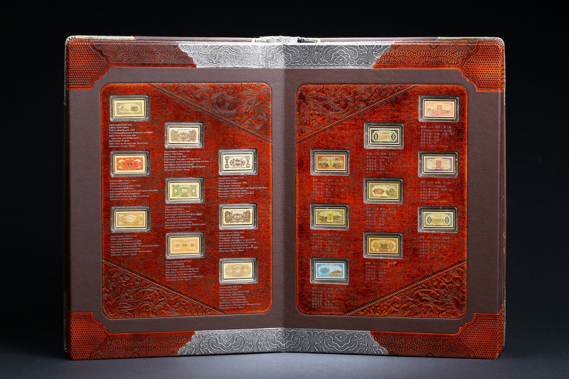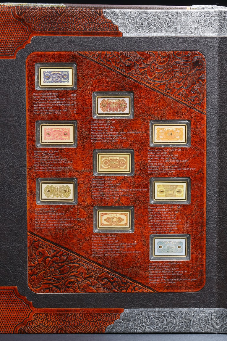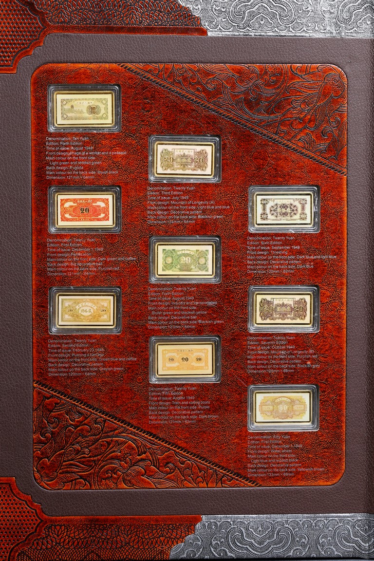 由中國印鈔造幣總公司於2009年製作, 此套微縮金條採用620克純金, 將中華人民共和國發行的第一套法定國家貨幣(1948 - 1953) 共12種面額, 62種版本的圖案微縮再現於62枚金條之上。限量發行8000套, 此套編號為3552/8000. 來源:洛杉磯華裔藏家提供