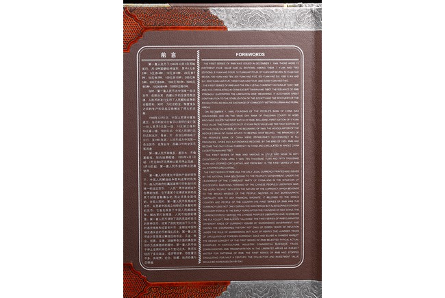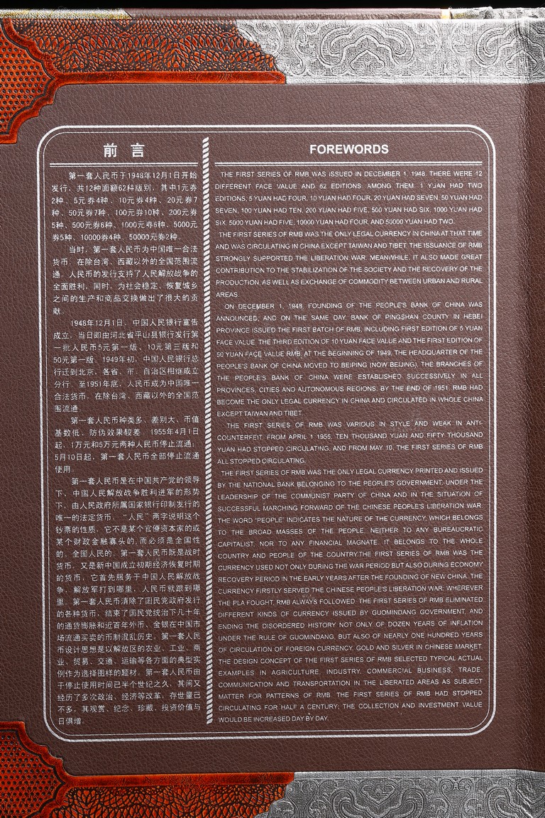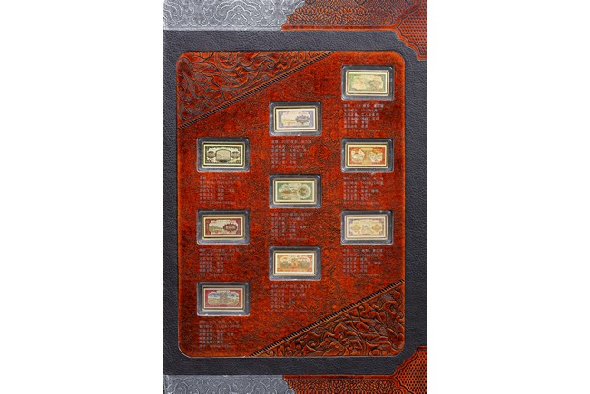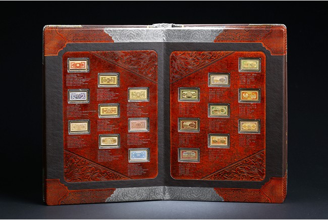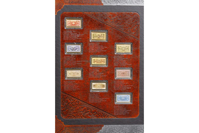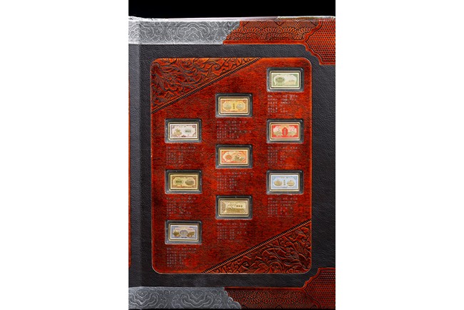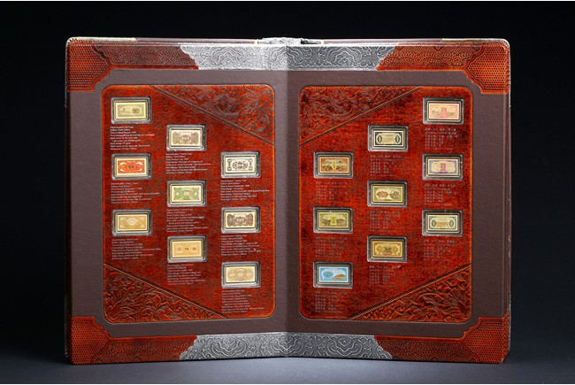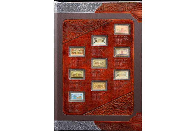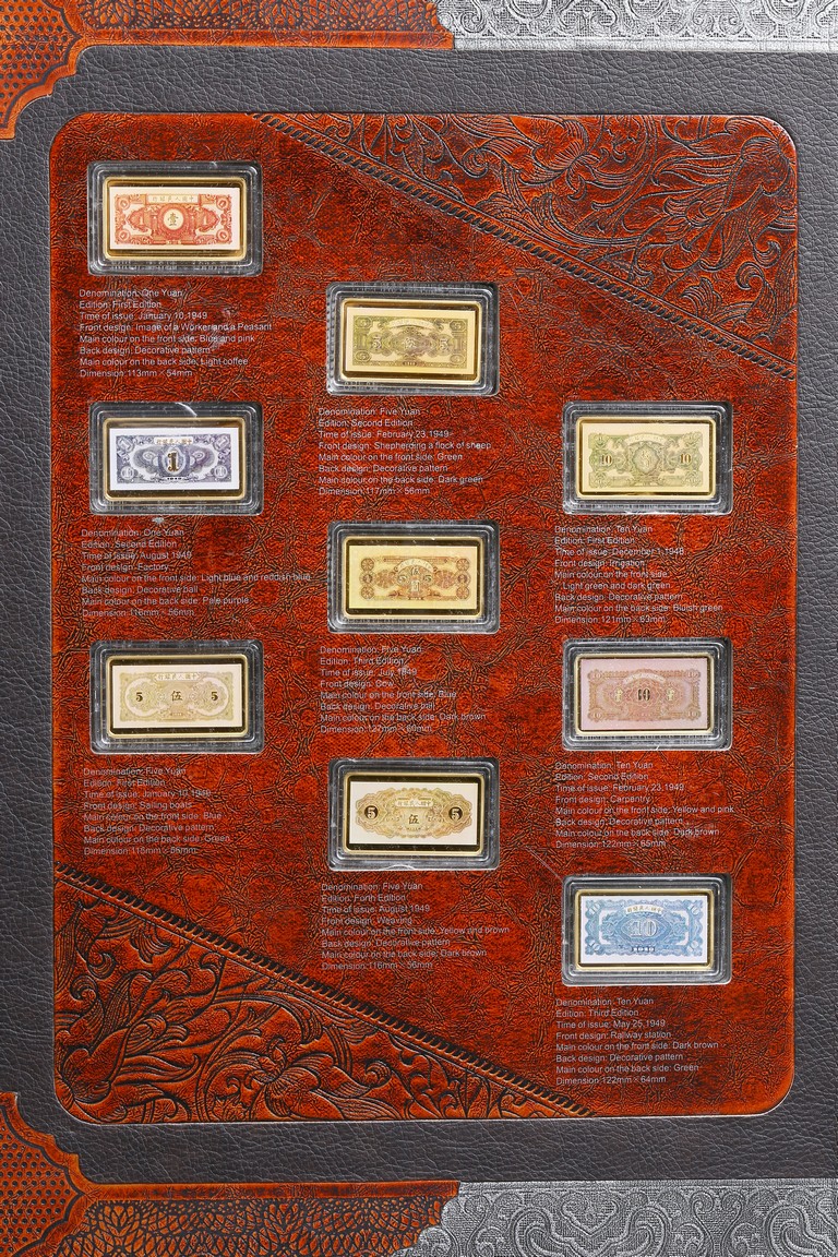 由中國印鈔造幣總公司於2009年製作, 此套微縮金條採用620克純金, 將中華人民共和國發行的第一套法定國家貨幣(1948 - 1953) 共12種面額, 62種版本的圖案微縮再現於62枚金條之上。限量發行8000套, 此套編號為3552/8000. 來源:洛杉磯華裔藏家提供
