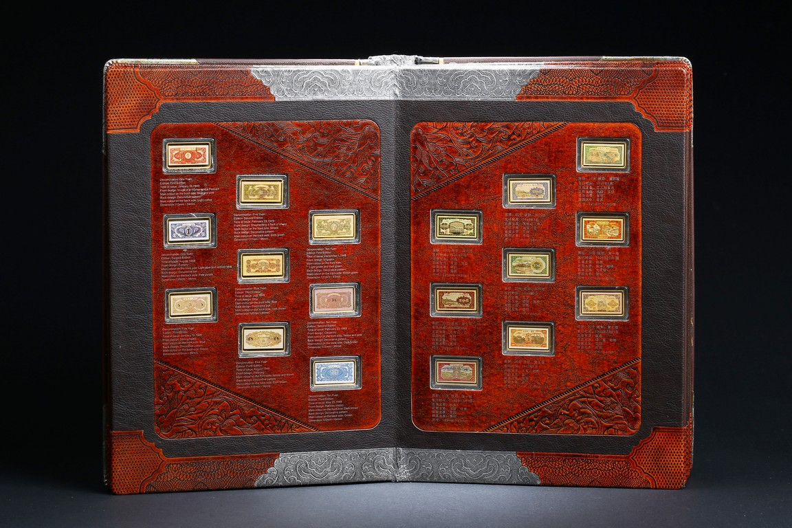 Total of 62 gold bars in 620 gram pure gold. Issued in 2009 by China Banknote Printing and Minting Corporation, this set including 12 different denominations and 62 designs of first series RMB(Chinese Yuan) introduced from 1948 to 1953, all in miniature gold bar form, with a fitted luxury leather bag. Limited Edition: No.3552 out of 8000.