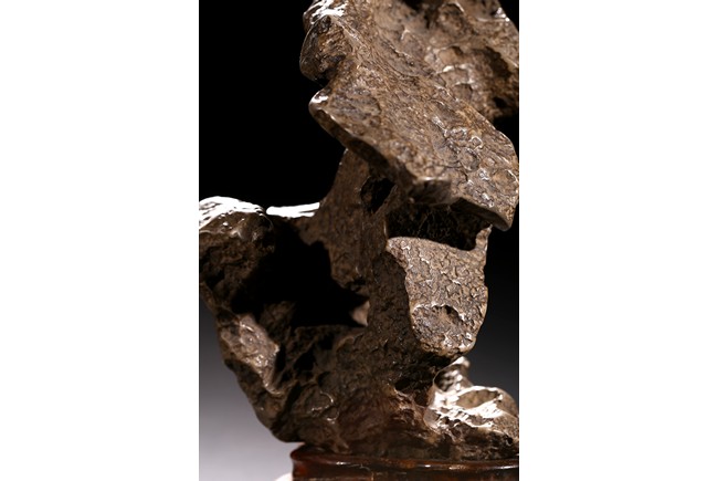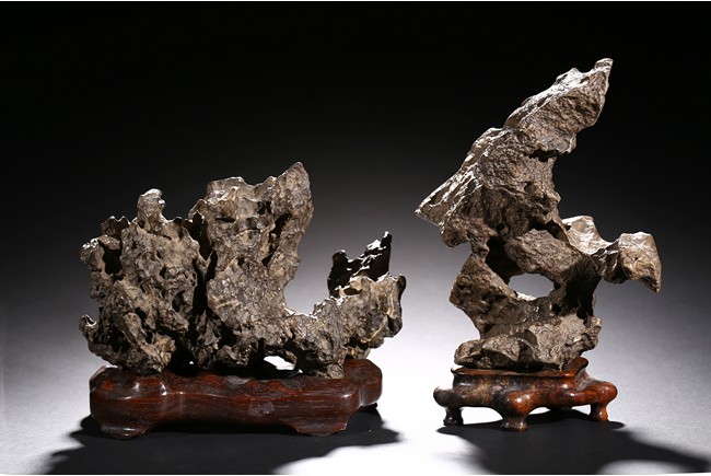 Consisting of two irregular form Lingbi scholar's rock, fitted with wooden stands.