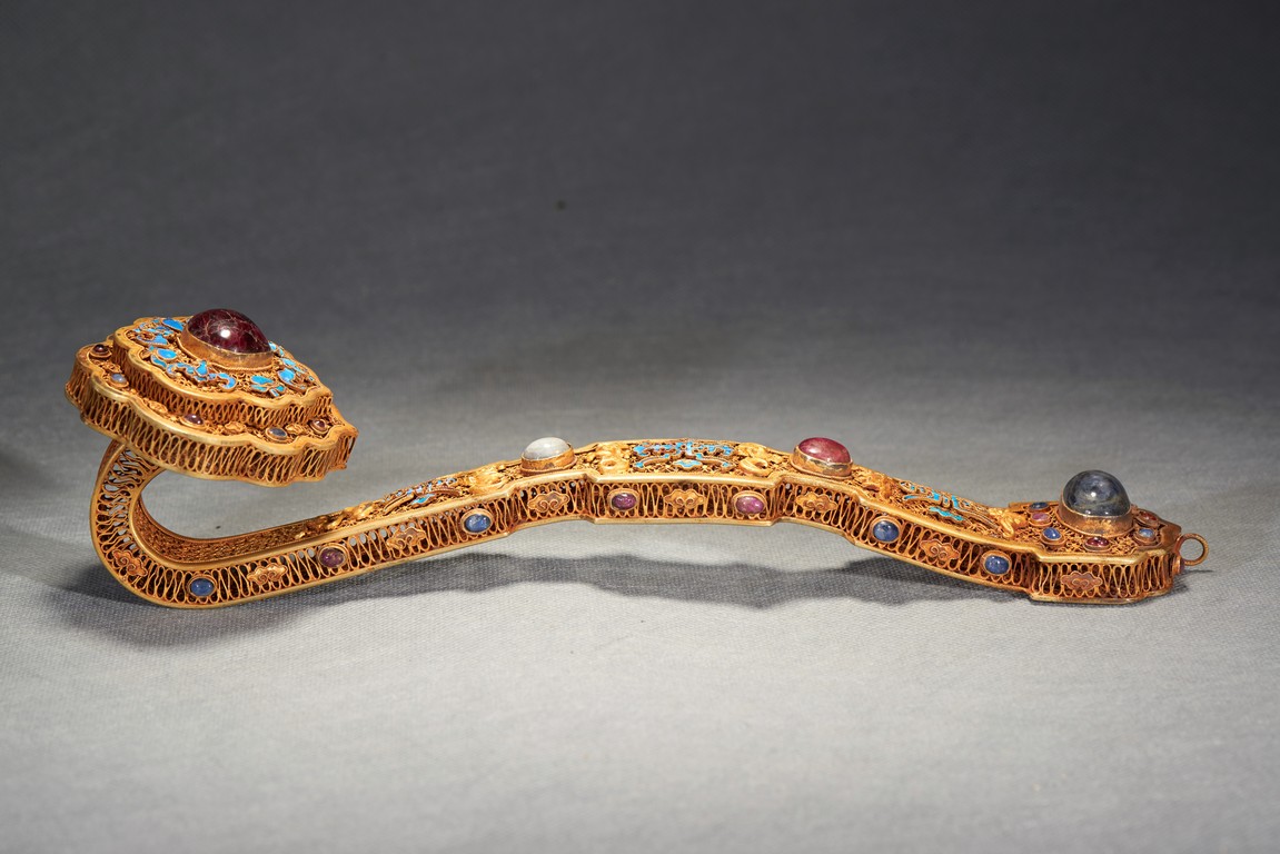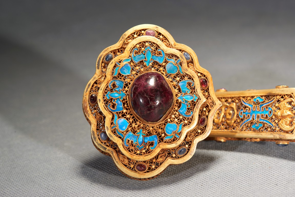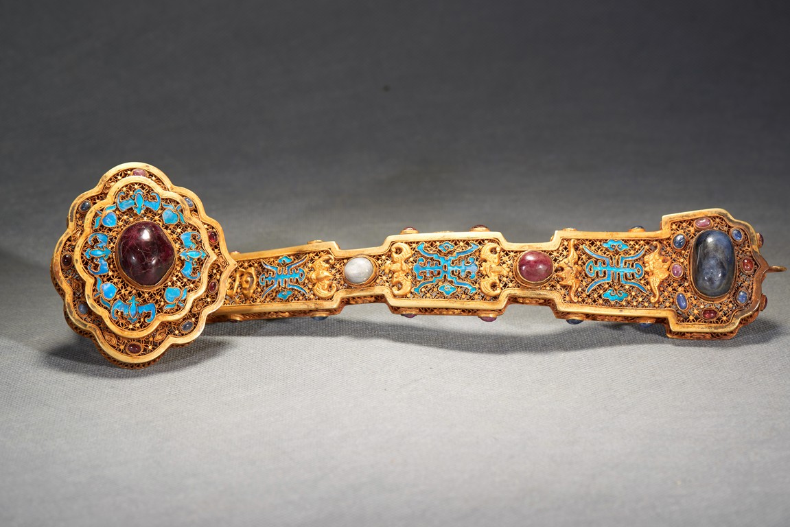 Delicately executed in filigree, the ruyi scepter head embellished with a large tourmaline in the manner of peach flanked by five bats modelled by kingfisher feather, the arched handle further inlaid with three different types of gems spaced by kingfisher feather 'shou' character, all reserved on elaborate gilt wire ground. Qing Dynasty period.