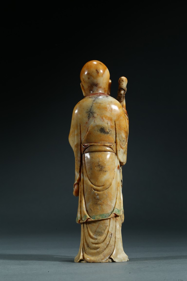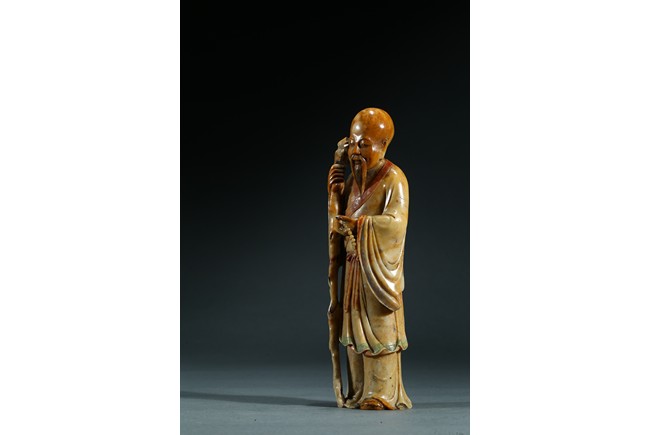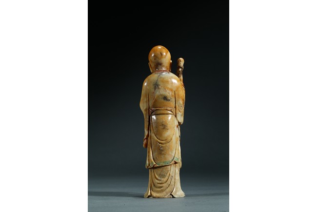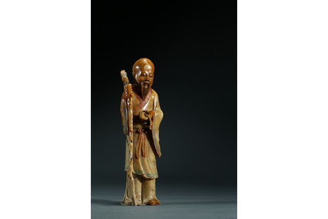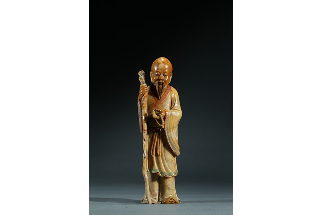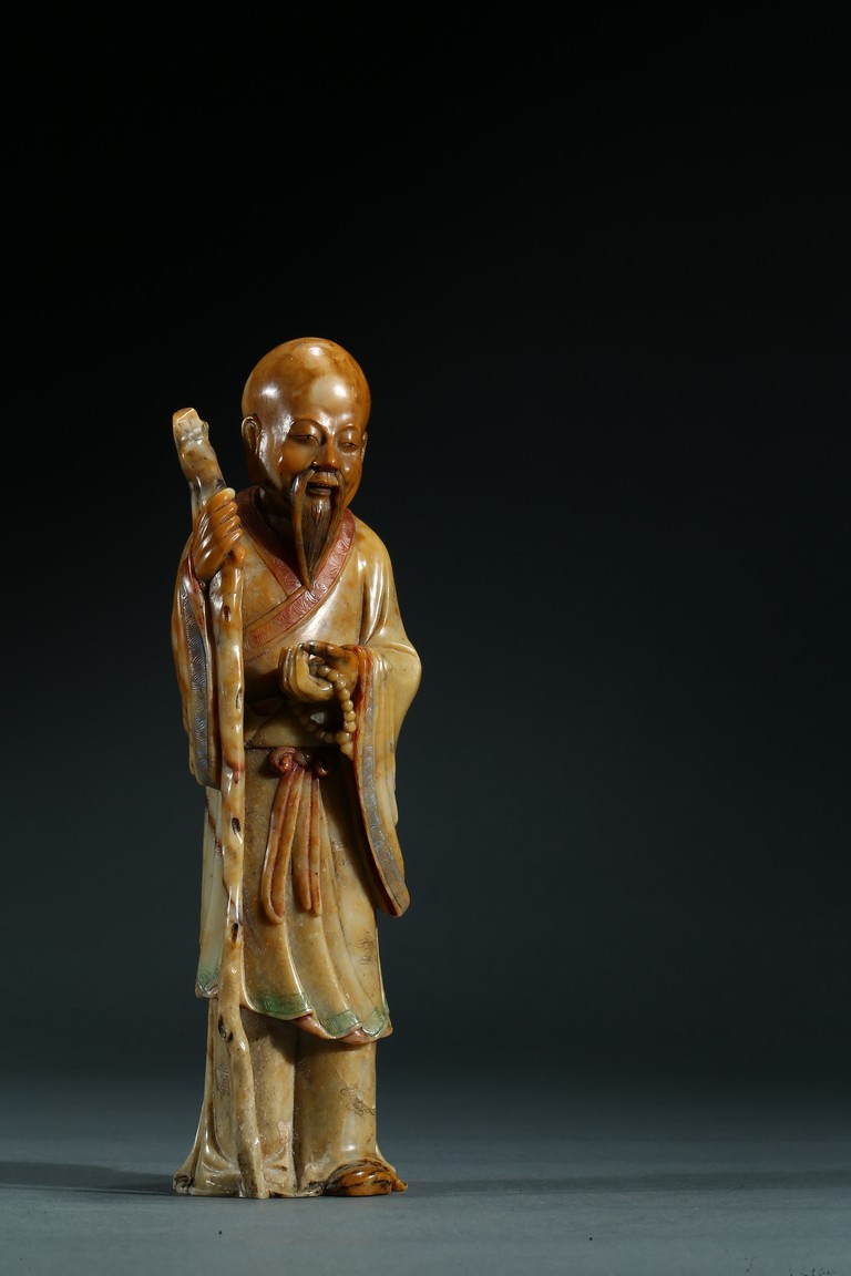 Skillfully carved, the elder is shown standing wearing long and flowing robes draped in elegant folds, his right hand holding a long tree branch crutch, left hand holding a bead bracelet, face with serene expression. Qing Dynasty period.