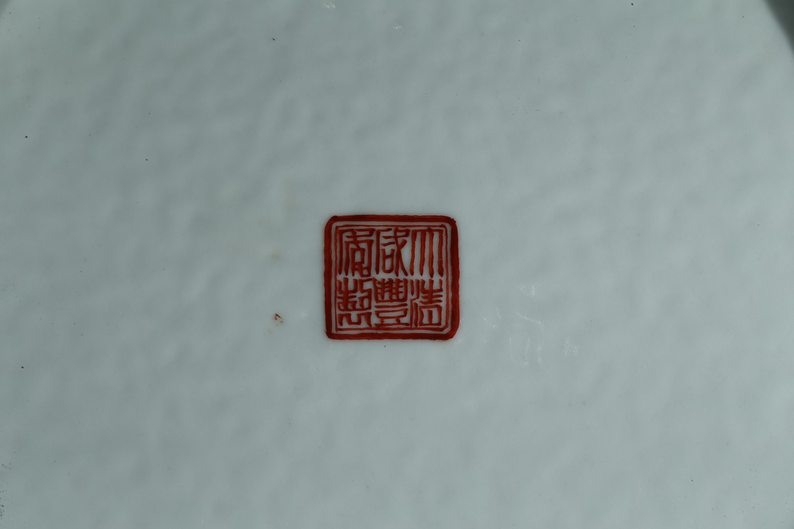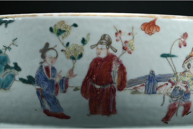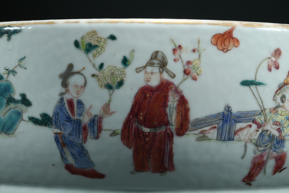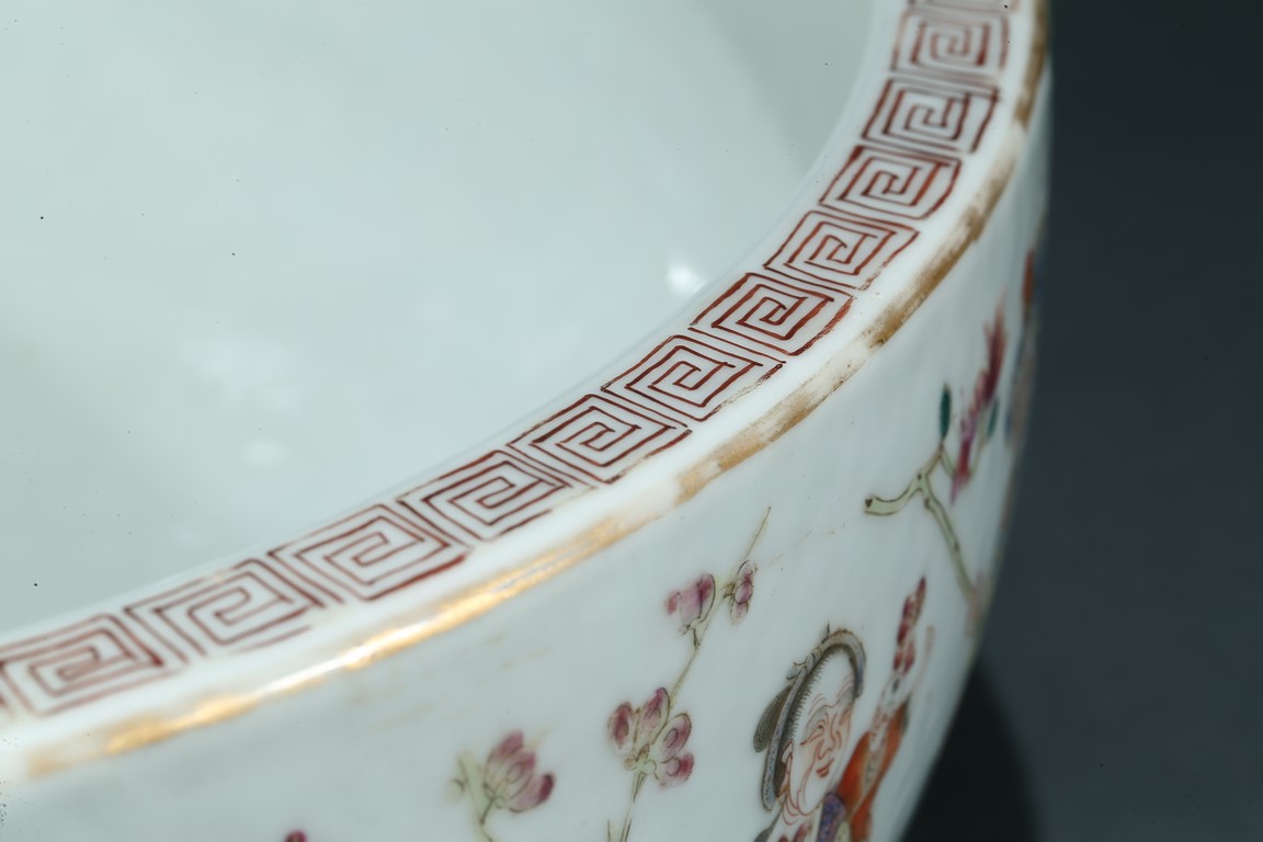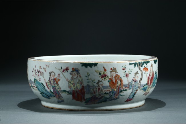 Well potted of large compressed form, the exterior finely painted with continuous scene of groups of officials and beauties standing or sitting in the mountainous setting, everyone's hand holding a branch of flowers or sprigs, around the washer mouth rim finely decorated with gilt glazed border enclosed band of key-fret in scarlet, the base with a six character inscription. Late Qing Dynasty period.