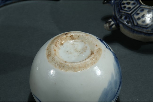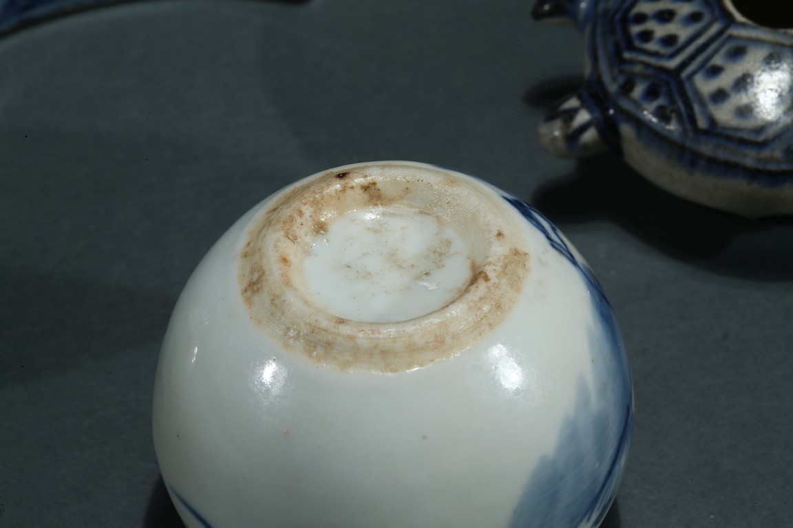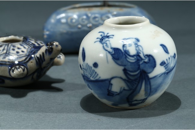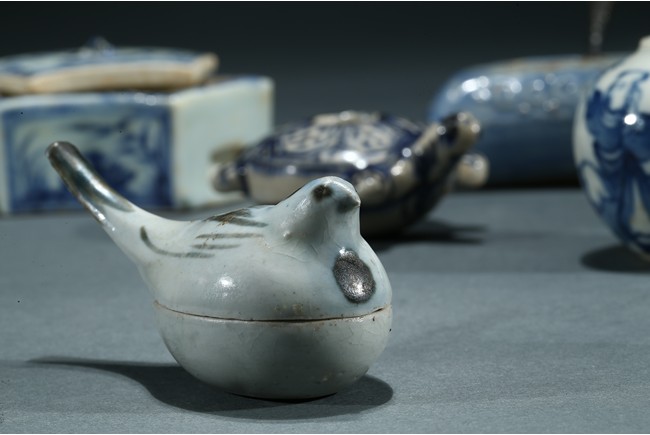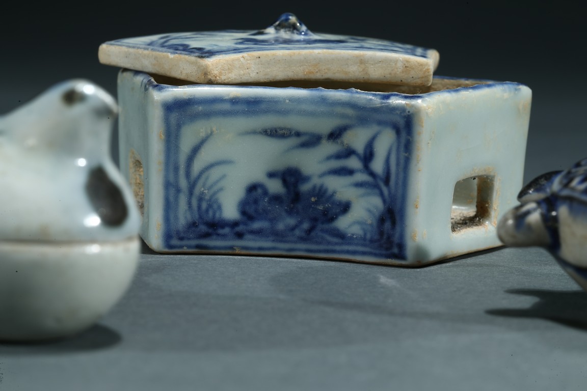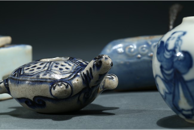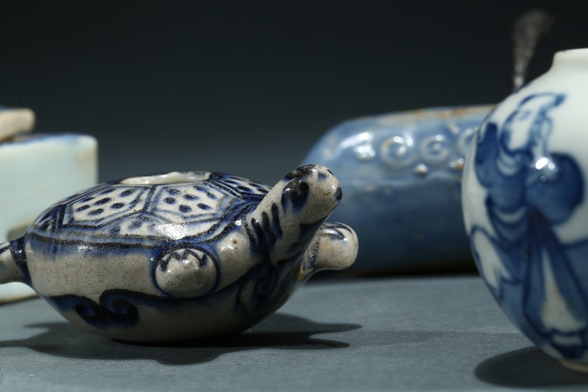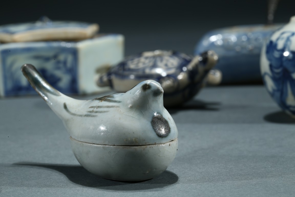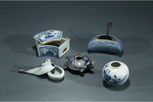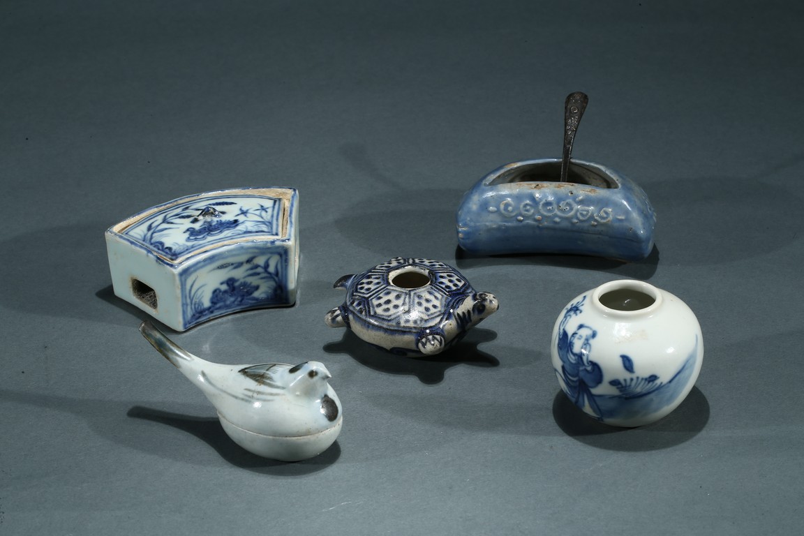 Comprising of a fan shaped box with cover, a perching bird form box, a moulded turtle form ornament, a figure jar and a moon shaped ware with a copper spoon. Ming/Qing Dynasty period.