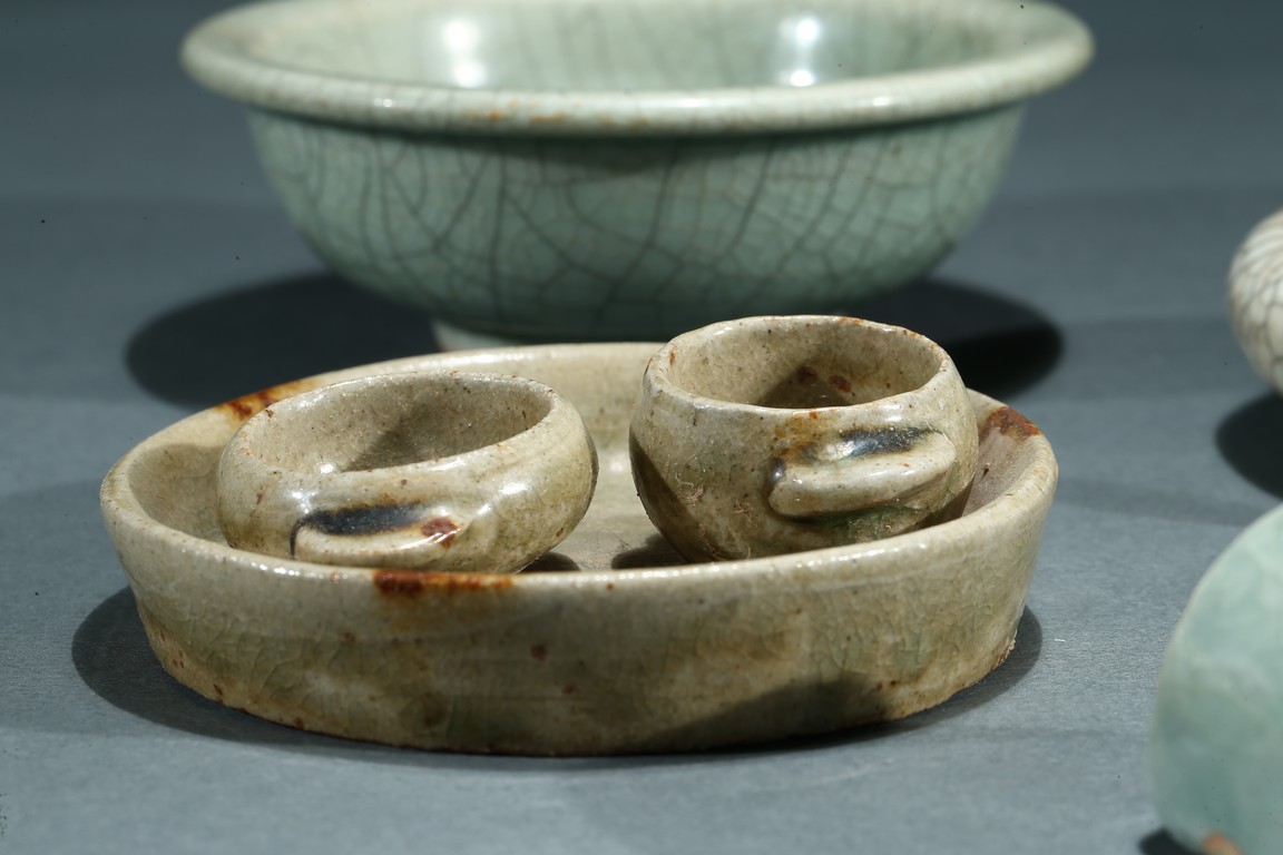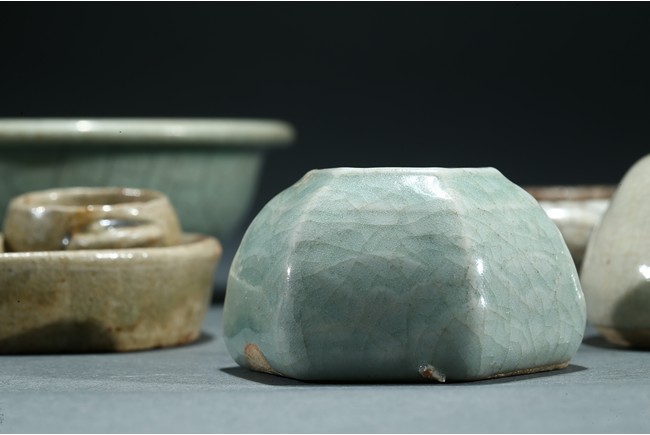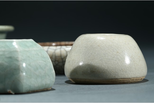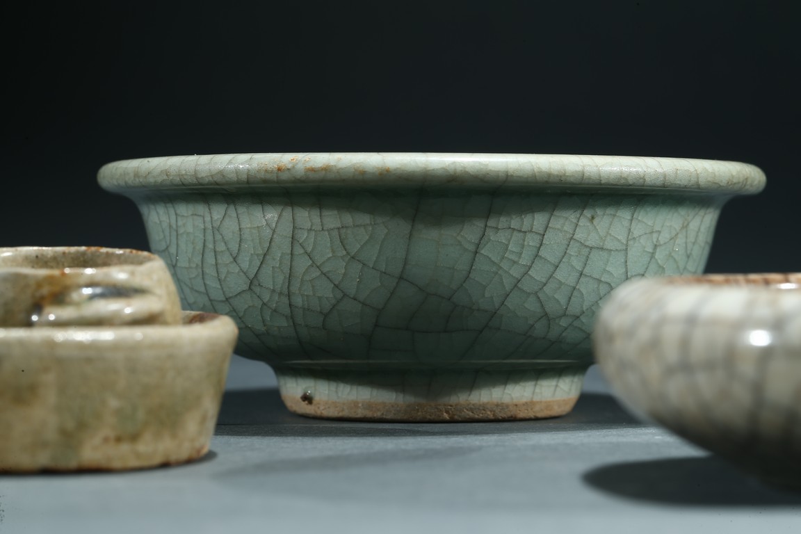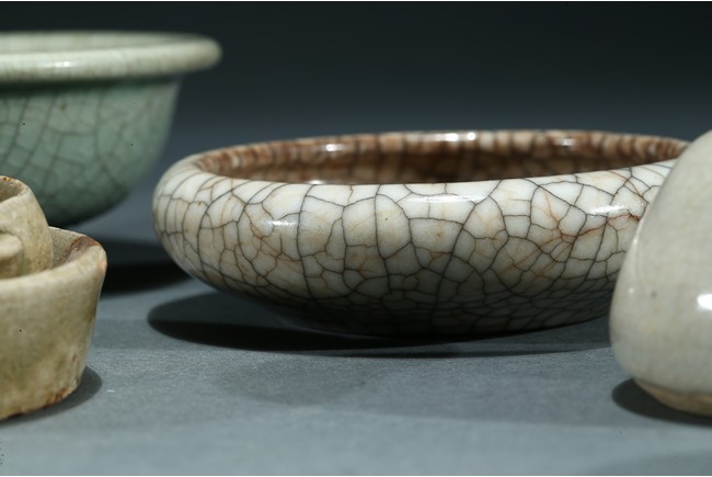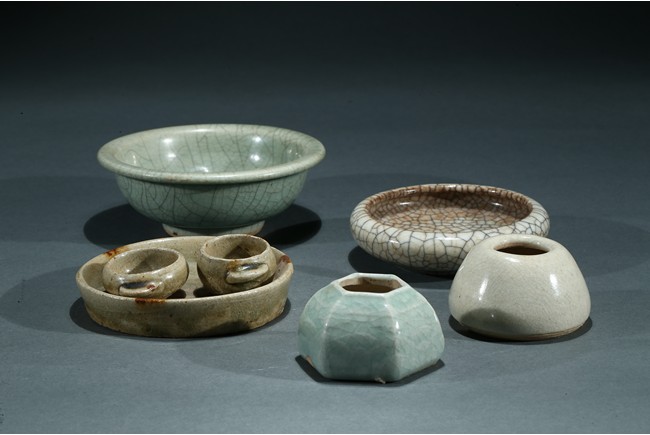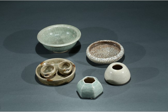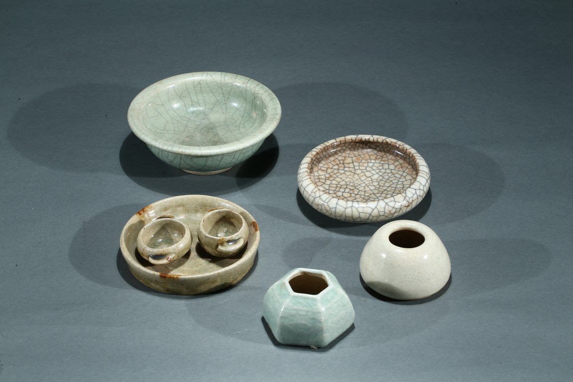 Comprising of a celadon glazed bowl, a circular ge-type dish, a tea-dust glaze dish with two small ware inside, a six faced ware and a small white glazed ware. Yuan/Ming Dynasty period.