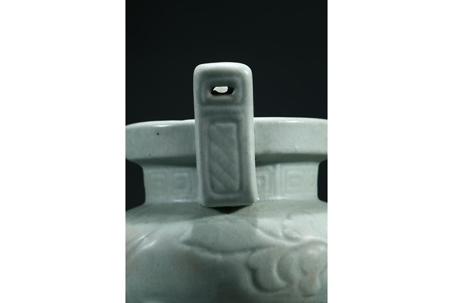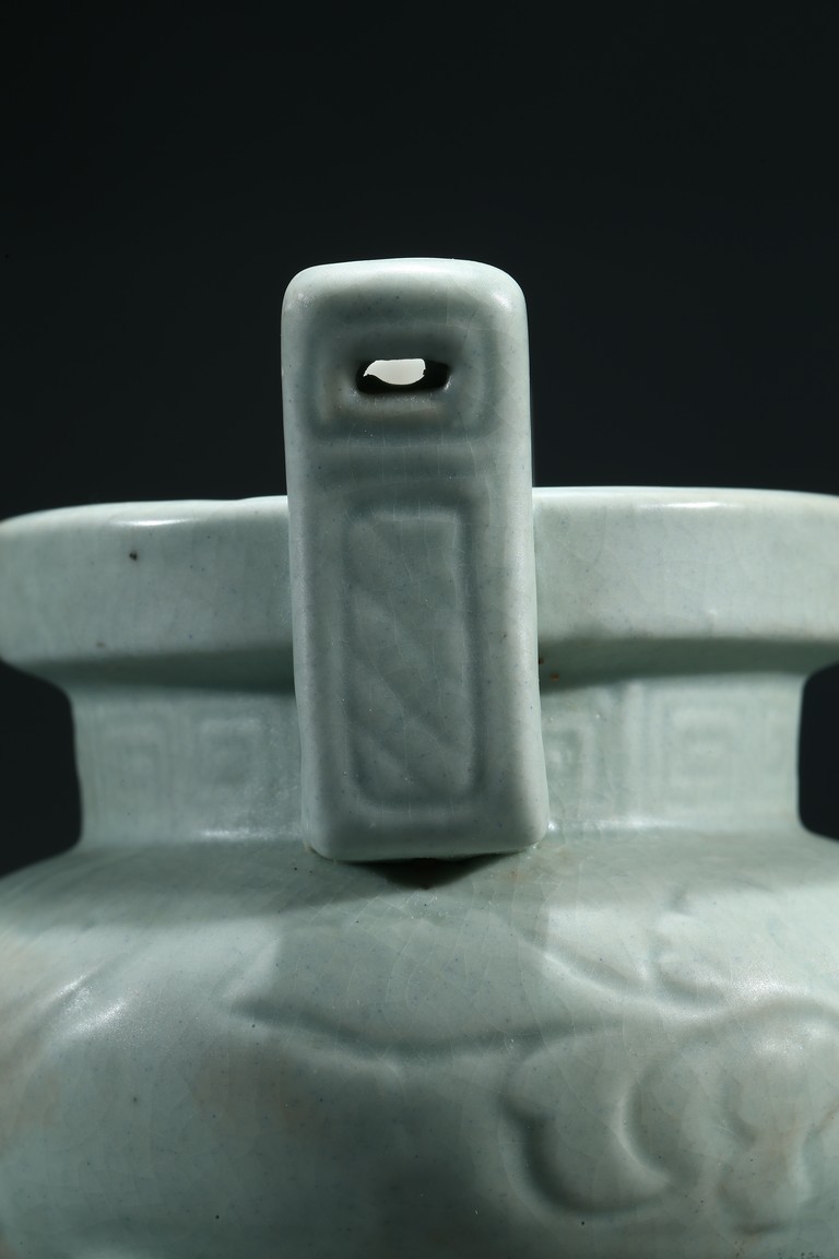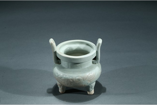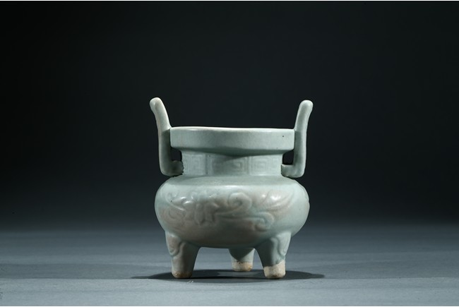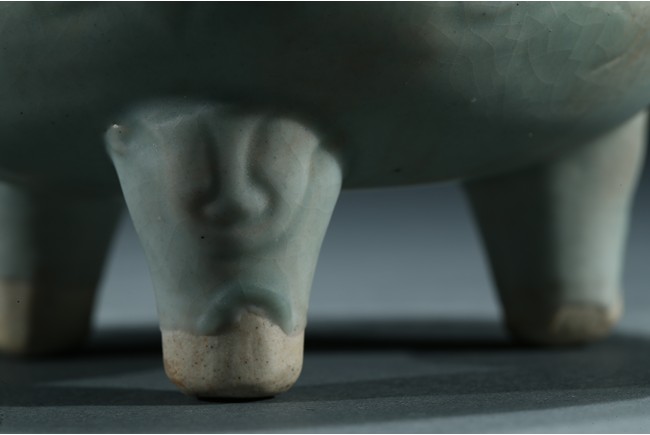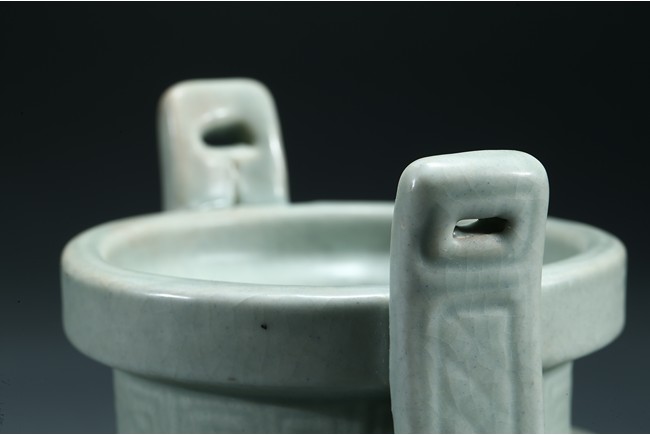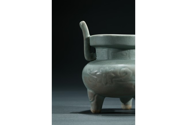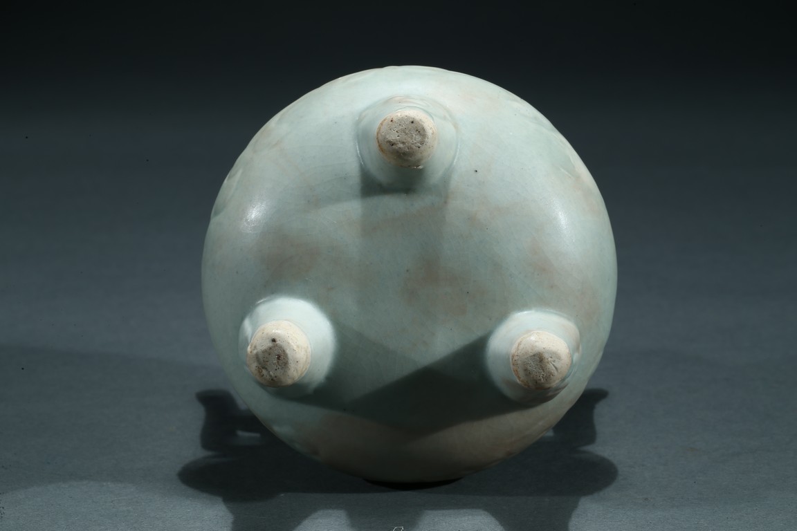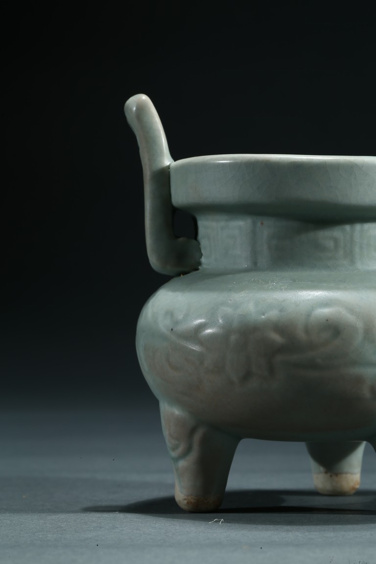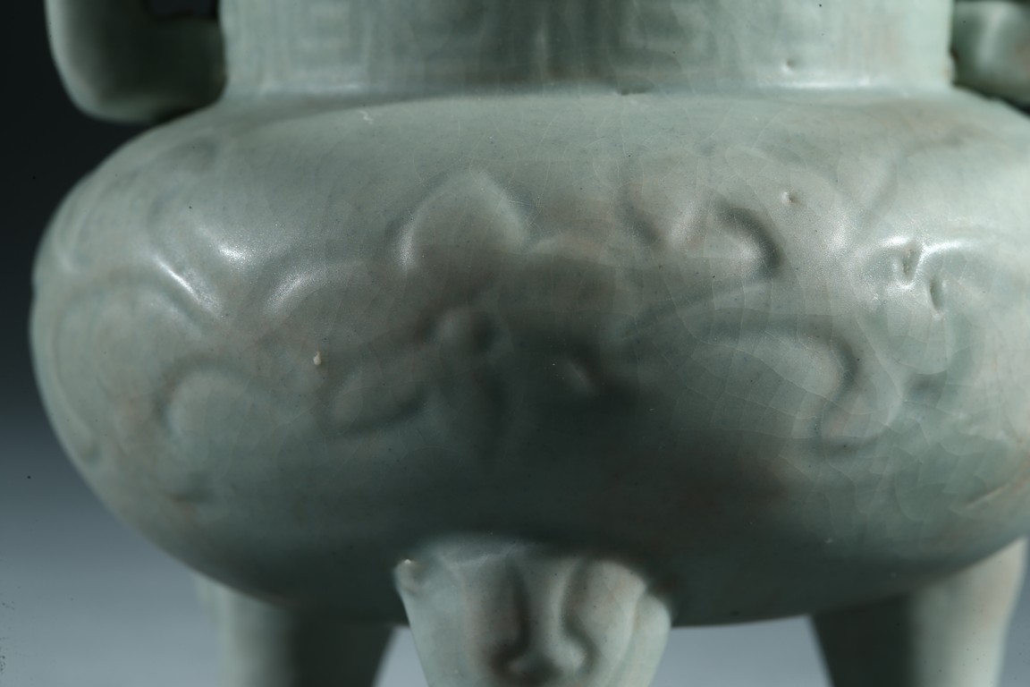 The compressed globular body raised from three short tampering feet to a straight neck with thick everted rim, flanked by a pair of long upright handles, covered overall with a thick celadon glaze. Yuan Dynasty period.