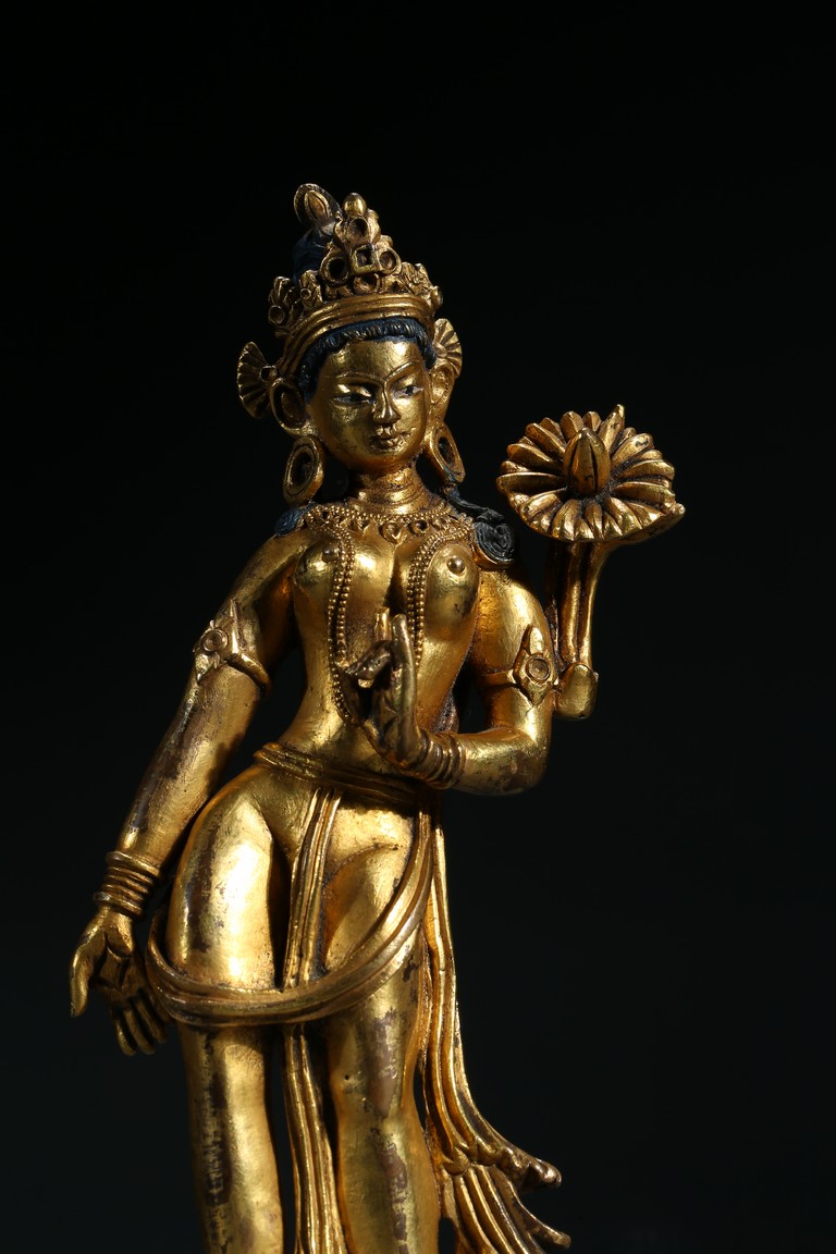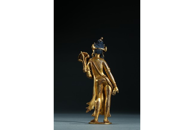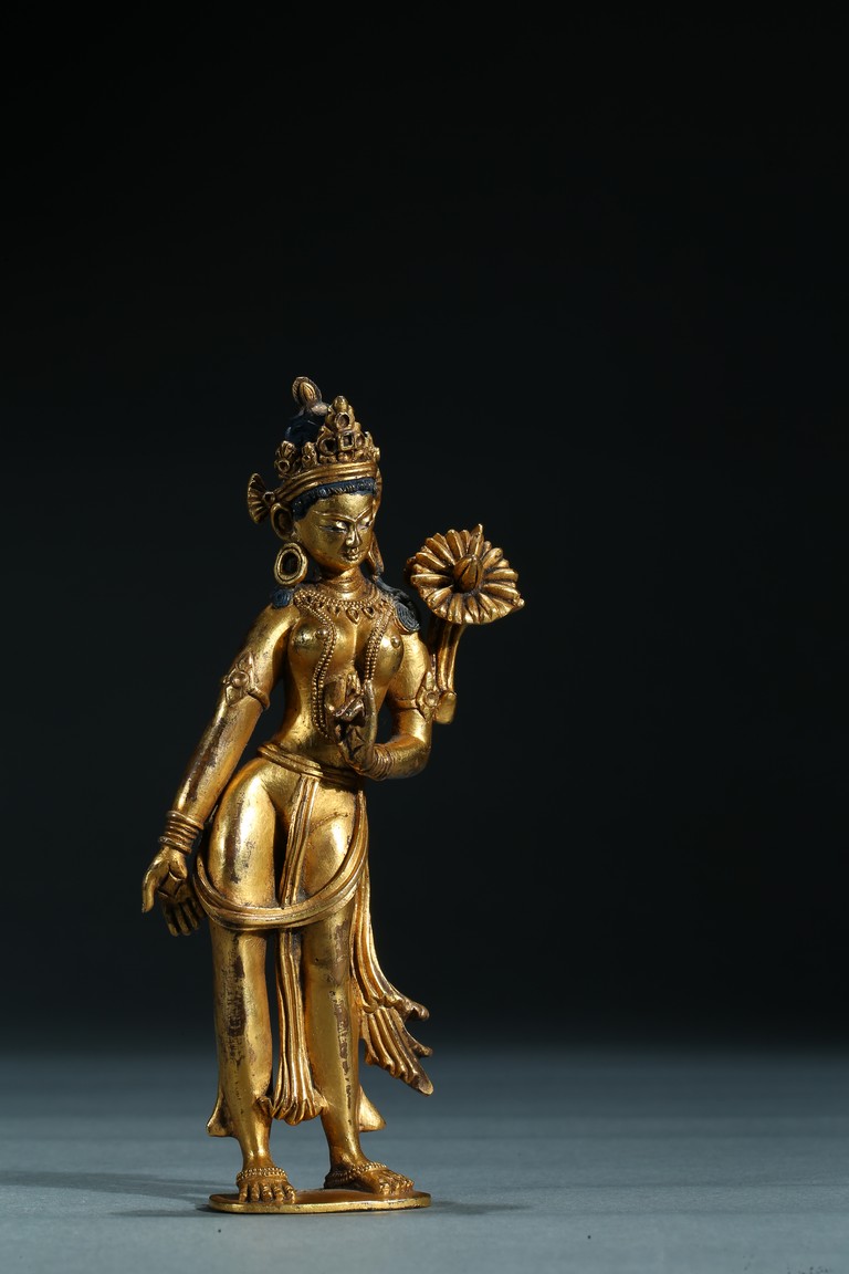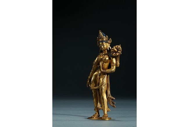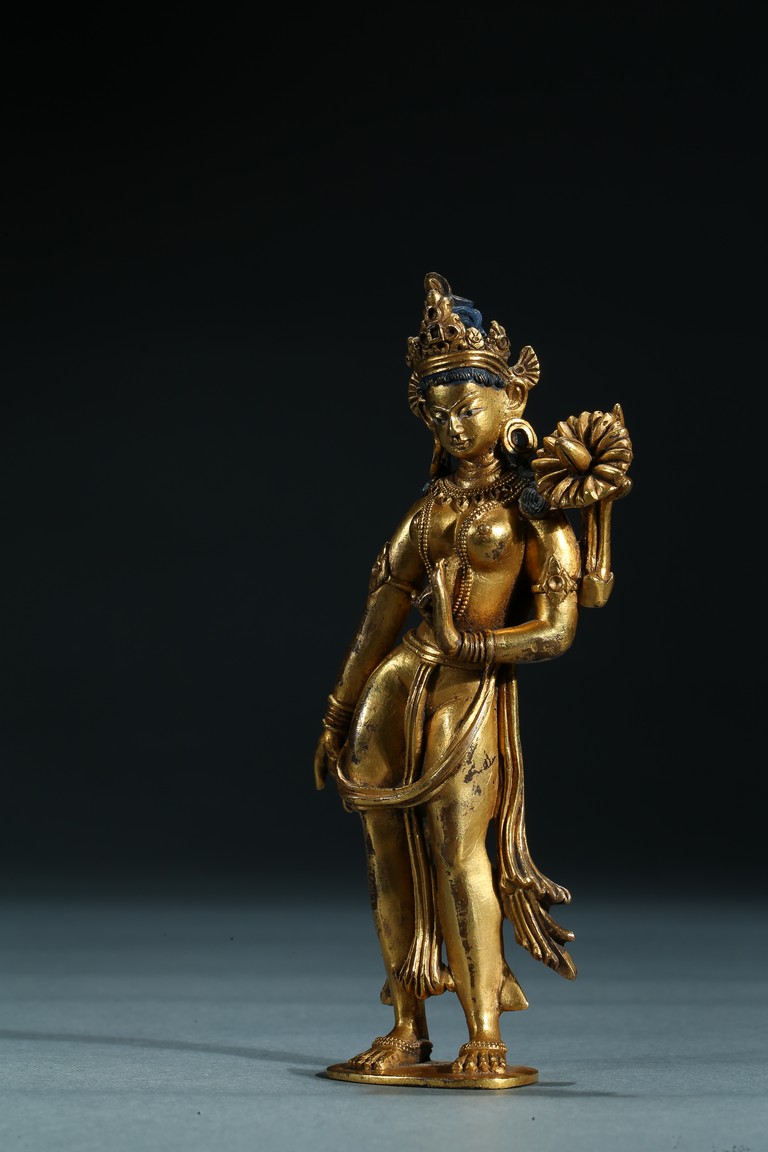 The bodhisattva is shown standing with hips thrust to the right, right hand in varada mudra, clad in a dhoti with a sash draped across the legs. Qing Dynasty period.