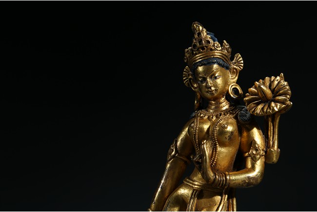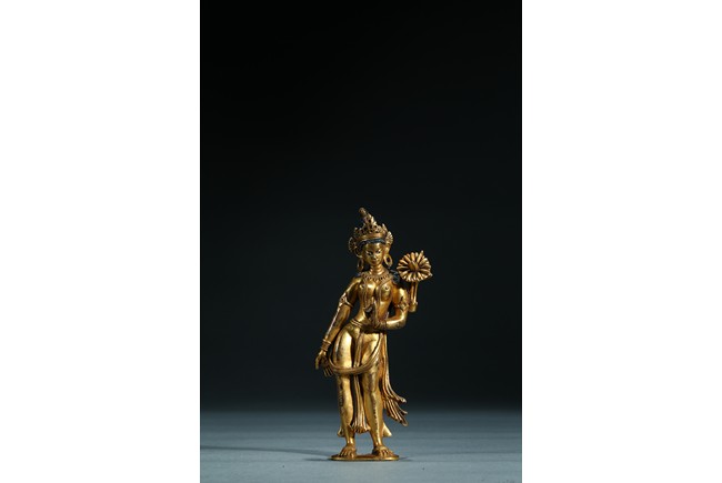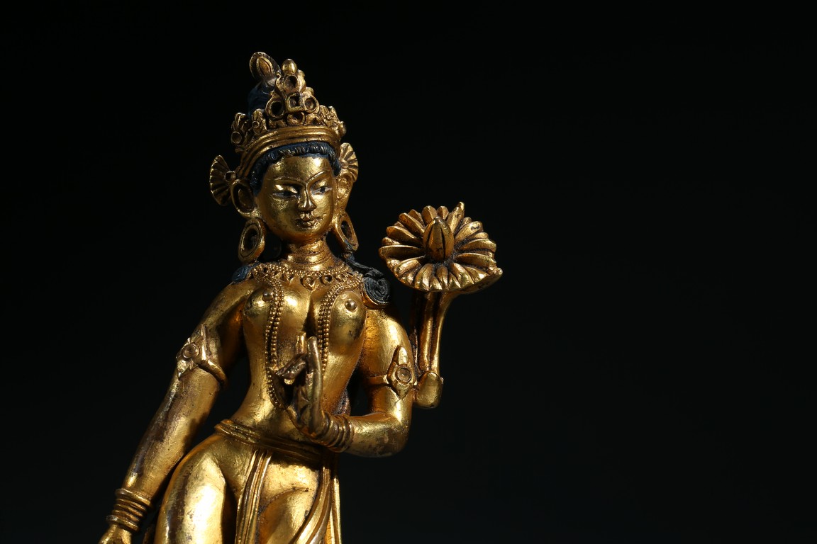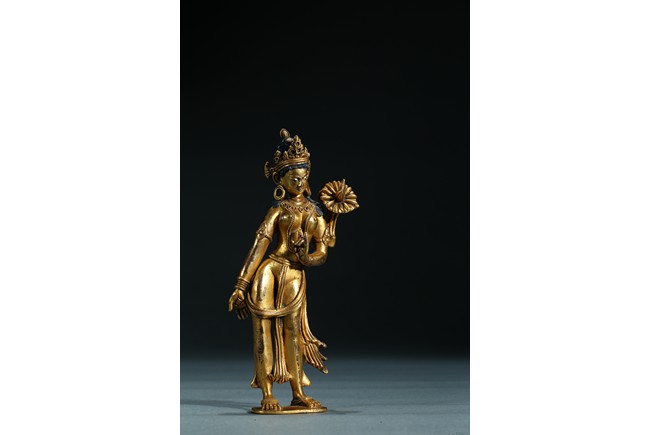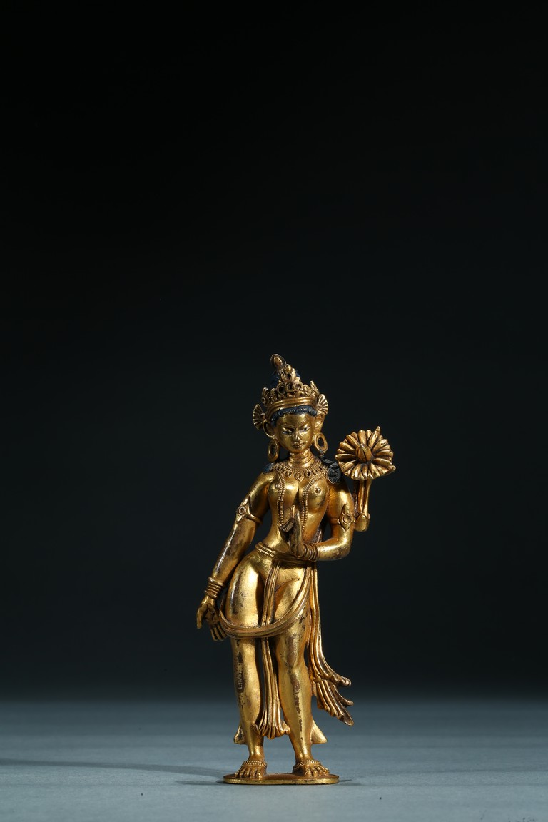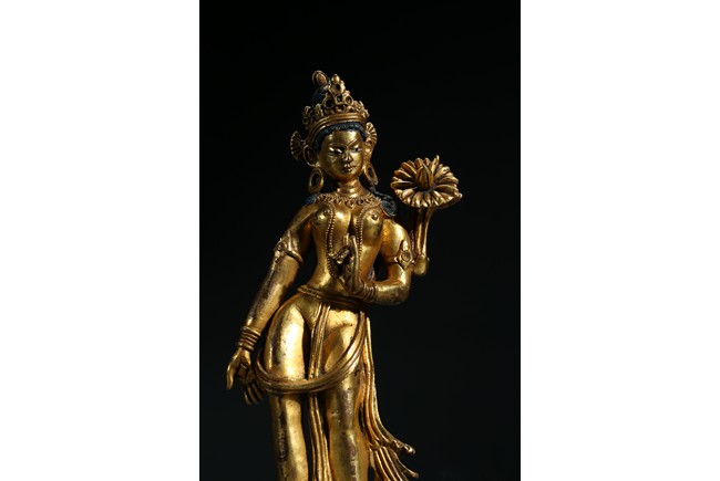 The bodhisattva is shown standing with hips thrust to the right, right hand in varada mudra, clad in a dhoti with a sash draped across the legs. Qing Dynasty period.