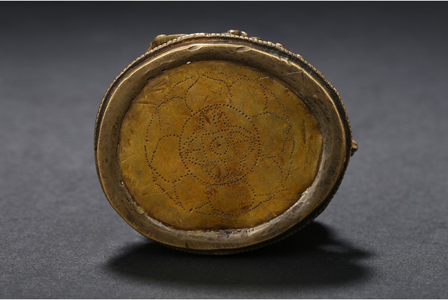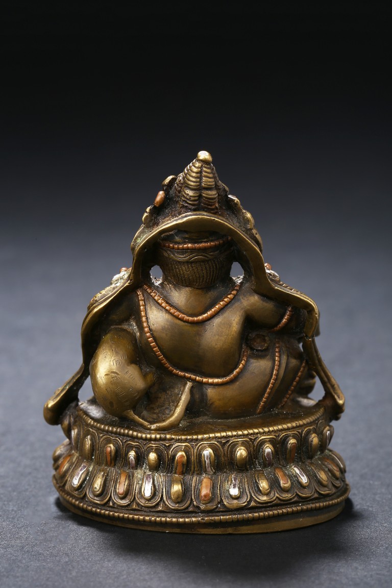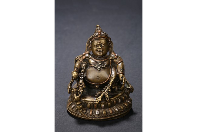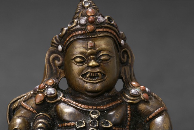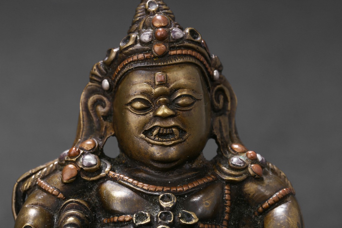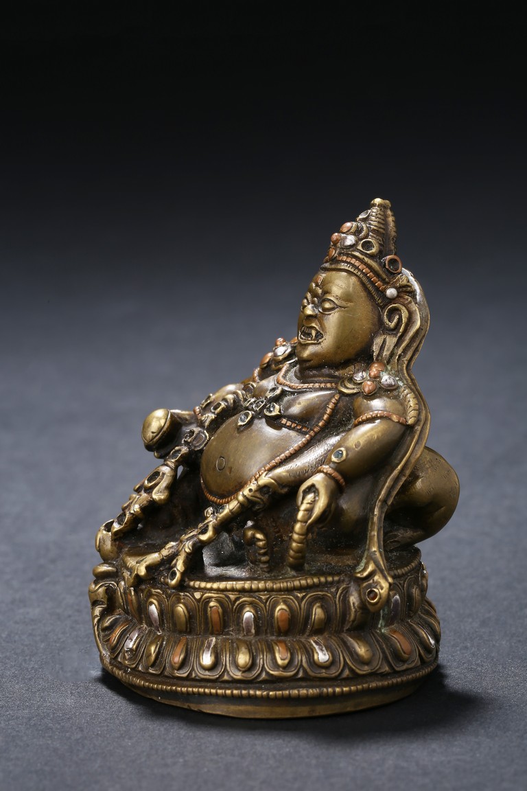 The bodhisattva is shown seated upon double lotus throne, adorned with beaded jewellry, with large belly, each hand holding an attribute, mouth agape revealing fangs. The lotus leaf and necklace inlaid in silver. Ming Dynasty period.