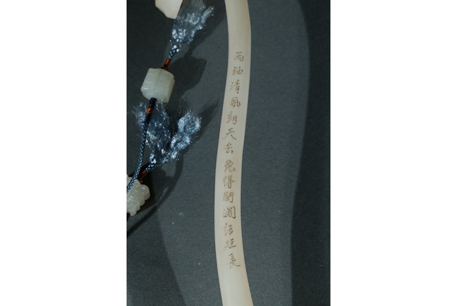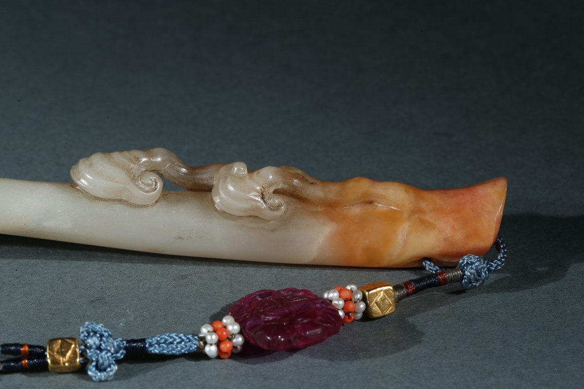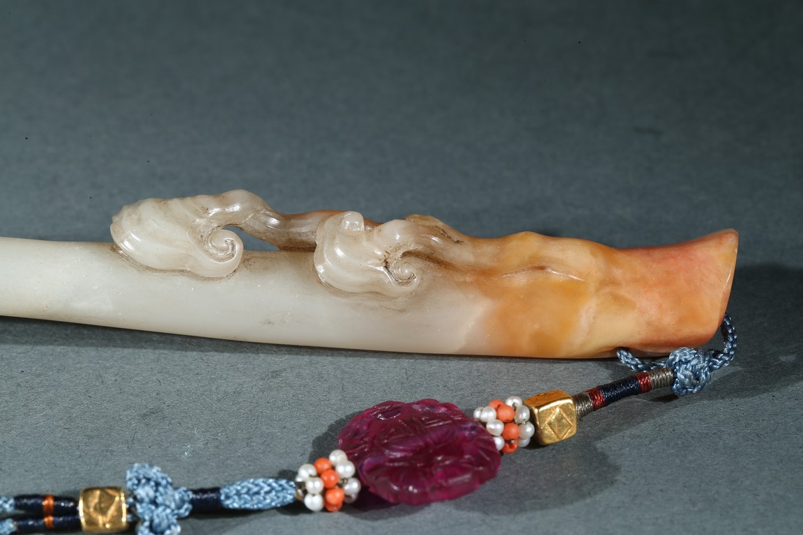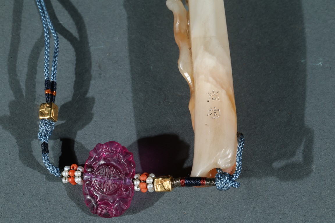 Carved as a stem of lingzhi, at the end of long slender shaft surmounted by two small lingzhi sprigs, incised with running script inscription on shaft and signed Shang Jun to the end, the white stone with minor black speckles and veins of russet inclusion. Qing Dynasty period.