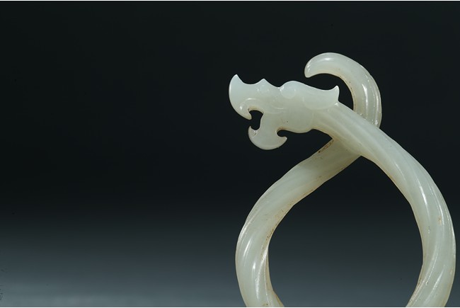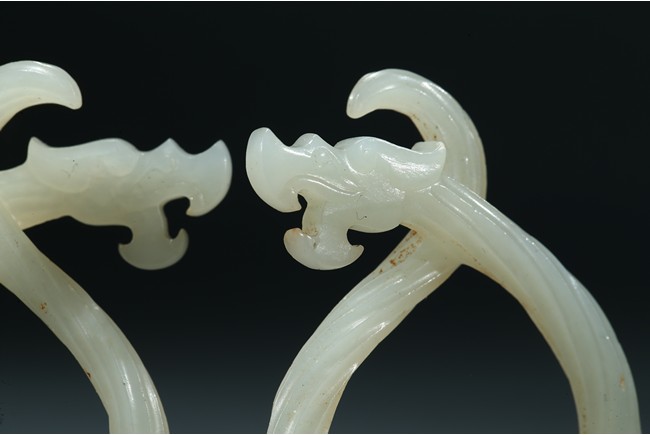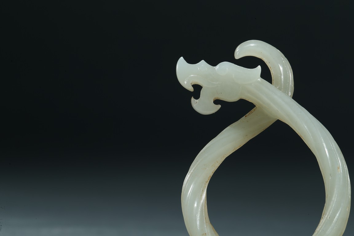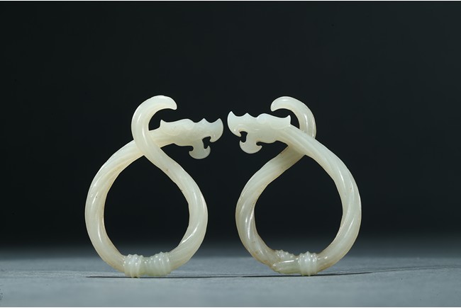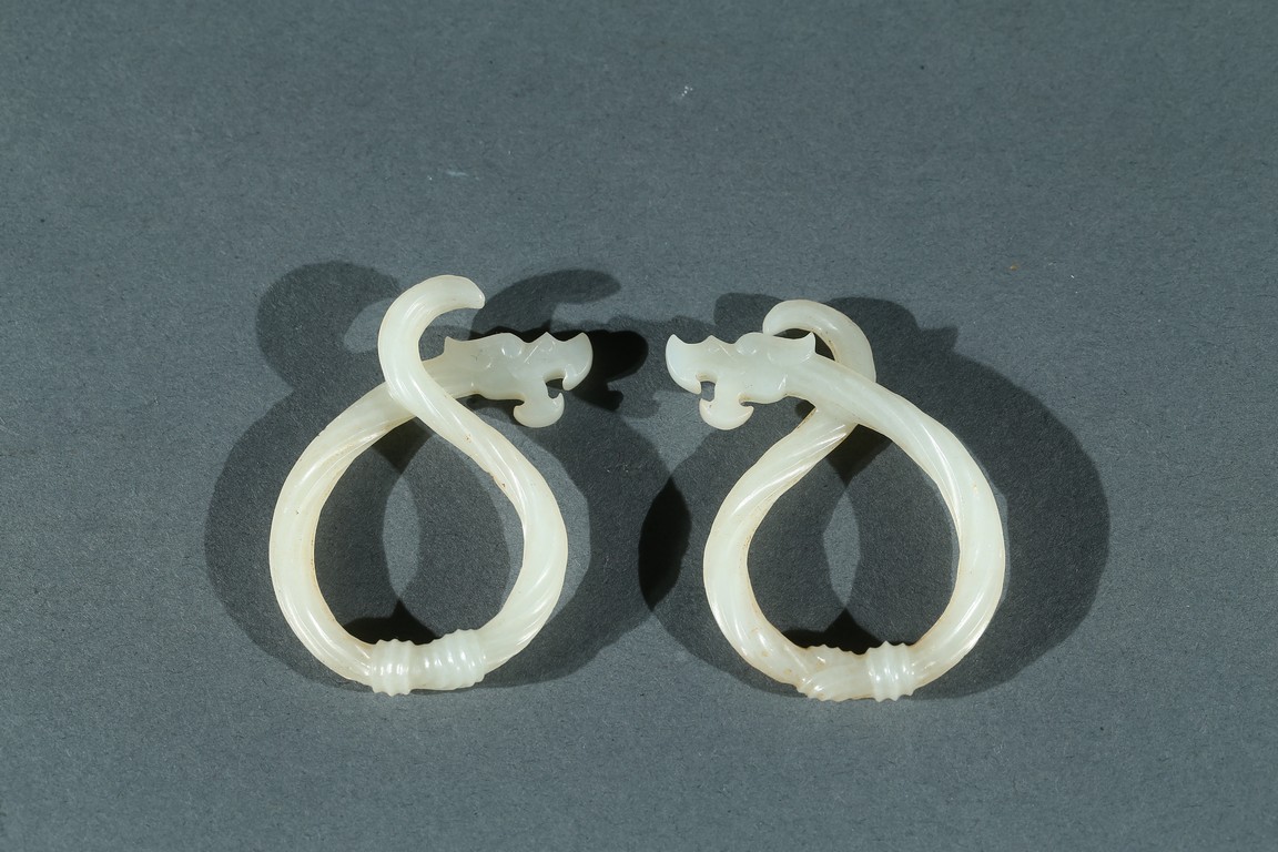 Each dragon pendant is modelled with its sinuous body as twisted rope, the stylized dragon head with mouth agape, the stone is of smoothly polished white tone. Warring State period.