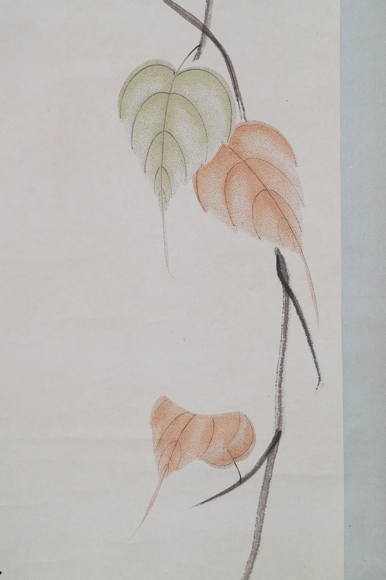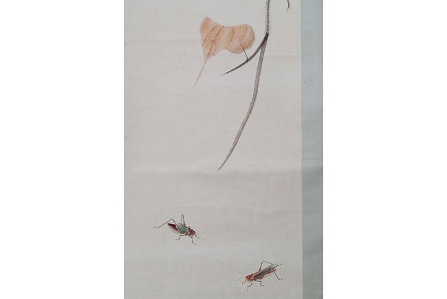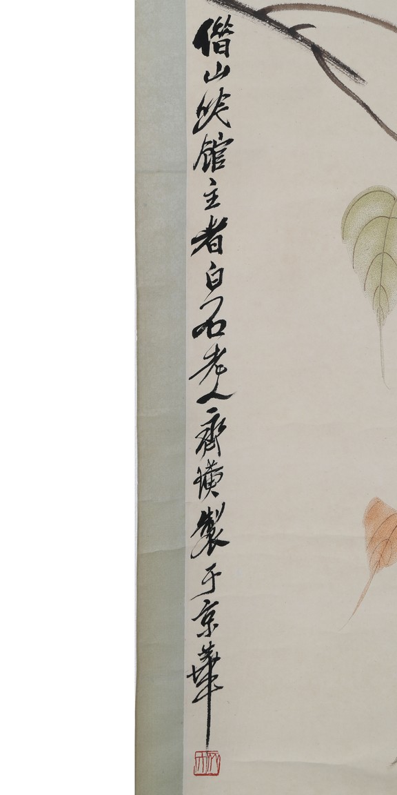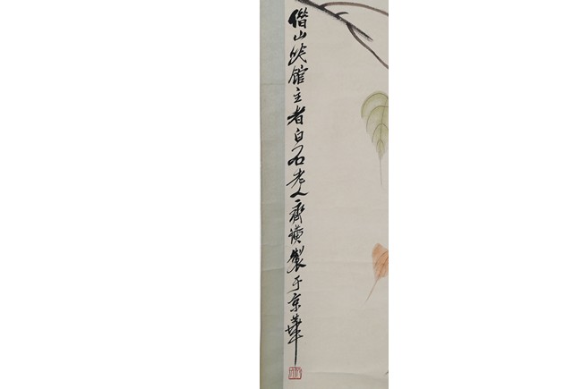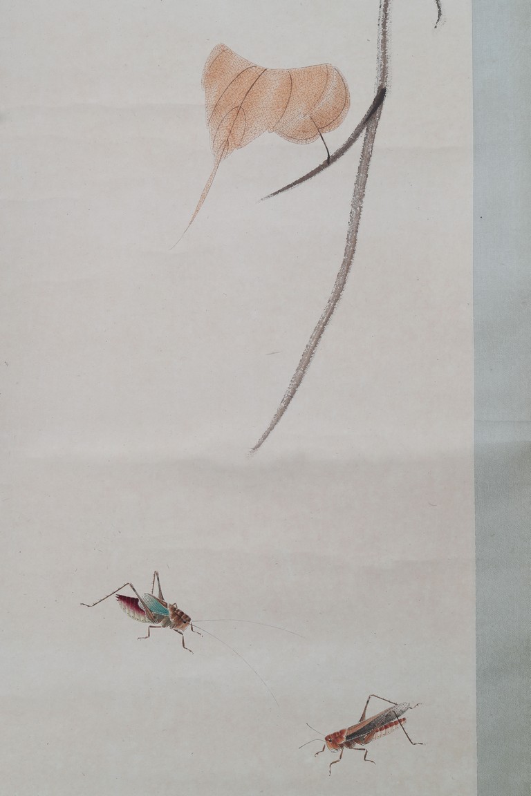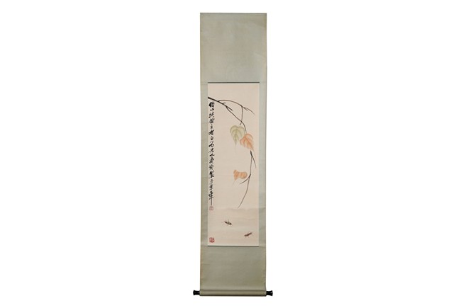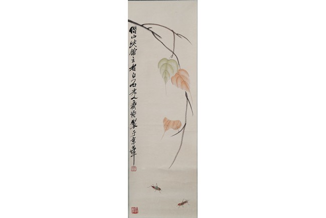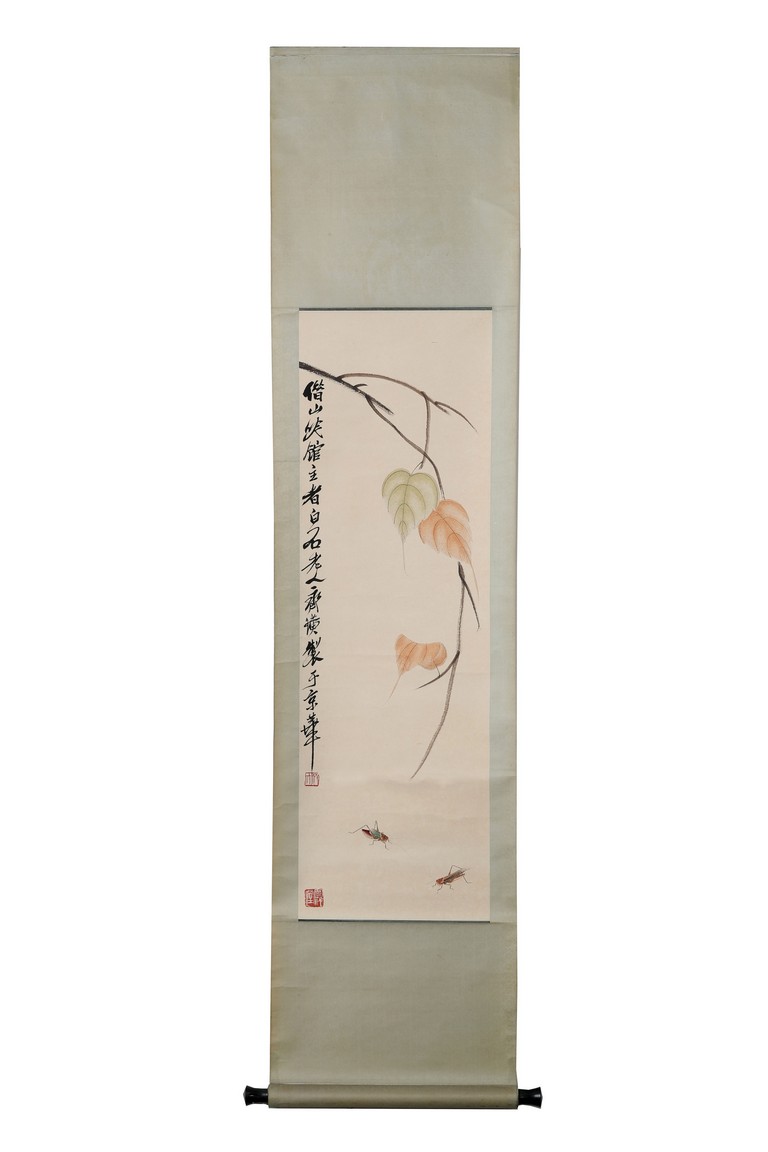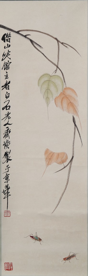 Color and ink on paper. Hanging scrolling. Insects. Inscribed and signed 'Qi Huang', with two seals of the artist.