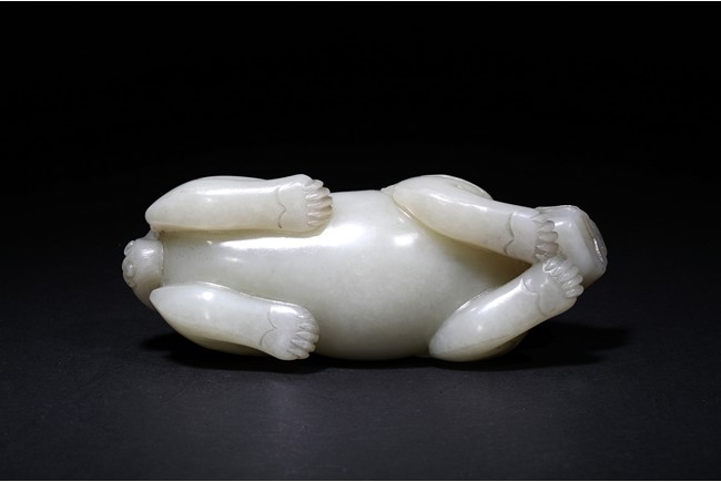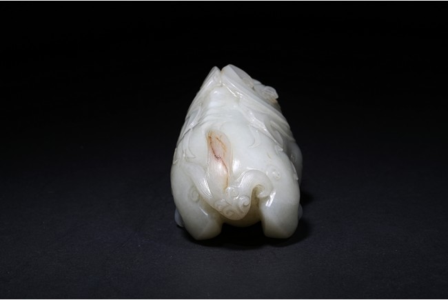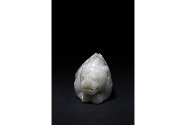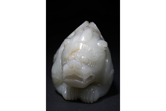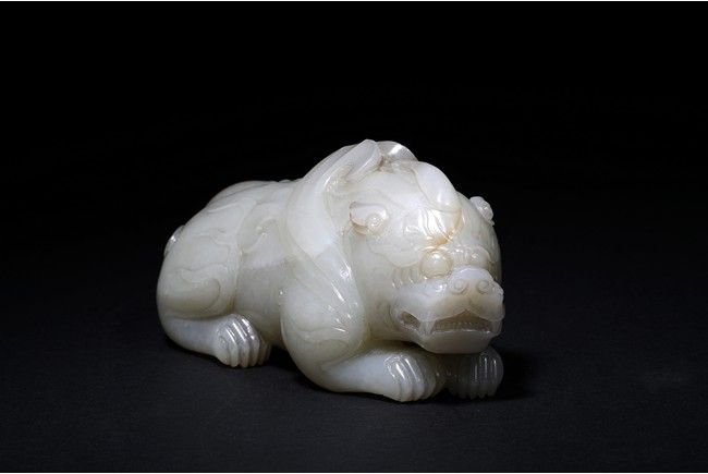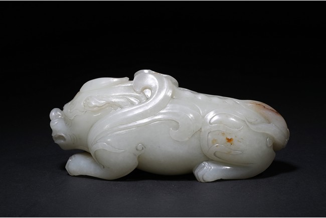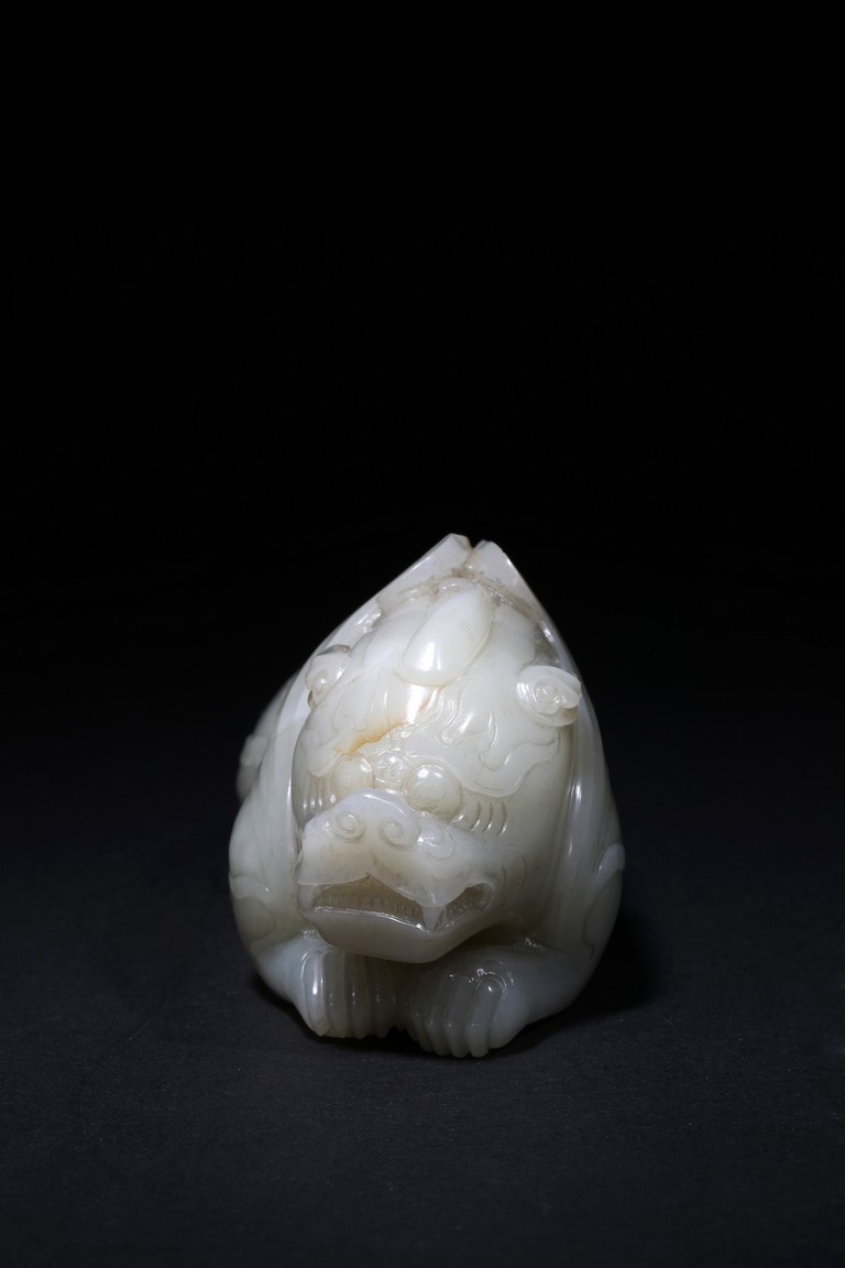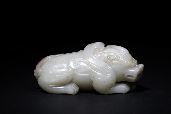 Deftly carved as a recumbent mythical beast, face with bushy eyebrows, mouth grinning showing all his teeth, bifurcated tail splitting down his back, the stone of translucent white tone with natural veins and slightly russet inclusions. Qing Dynasty period.