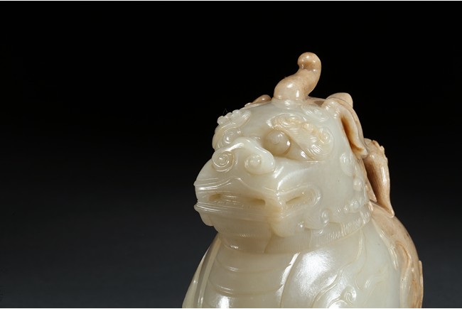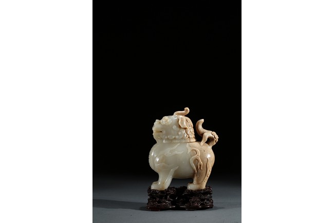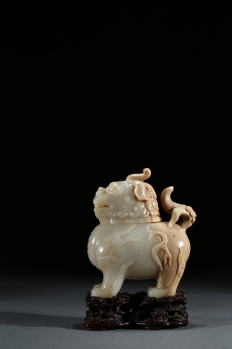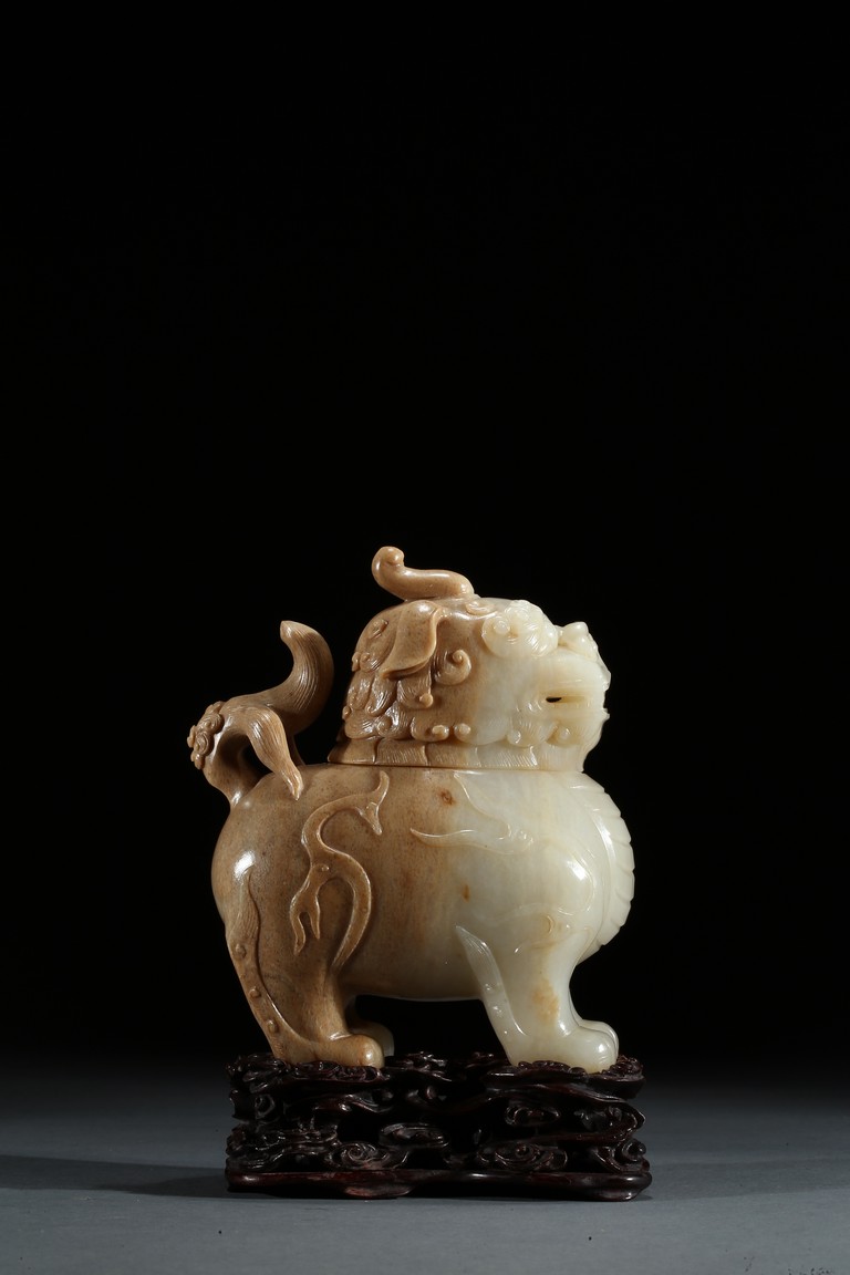 The censer is carved as a luduan standing with four legs ending in clawed feet. The detachable cover is modelled as the head of the ferocious beast with jaws agape and teeth bared, the beast with finely incised mane and tail flying behind, the stone is of white tone to the front half body and with russet skin to the rear half body. Ming Dynasty period.