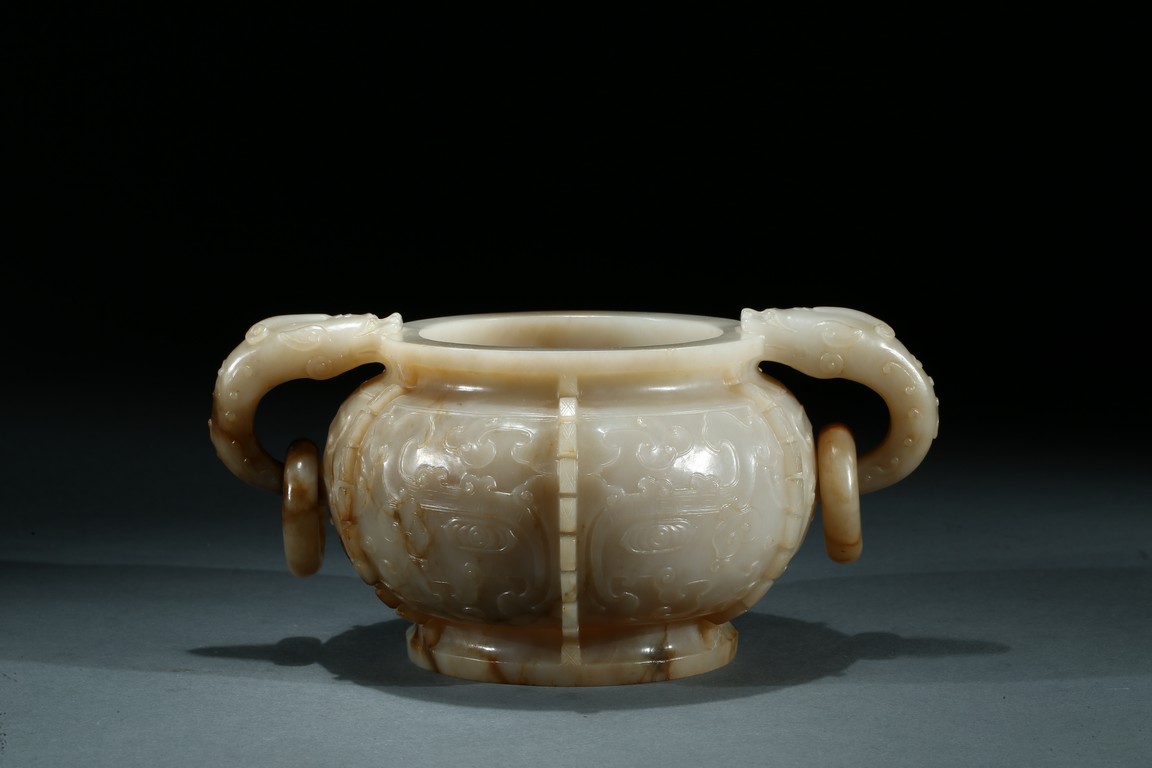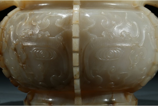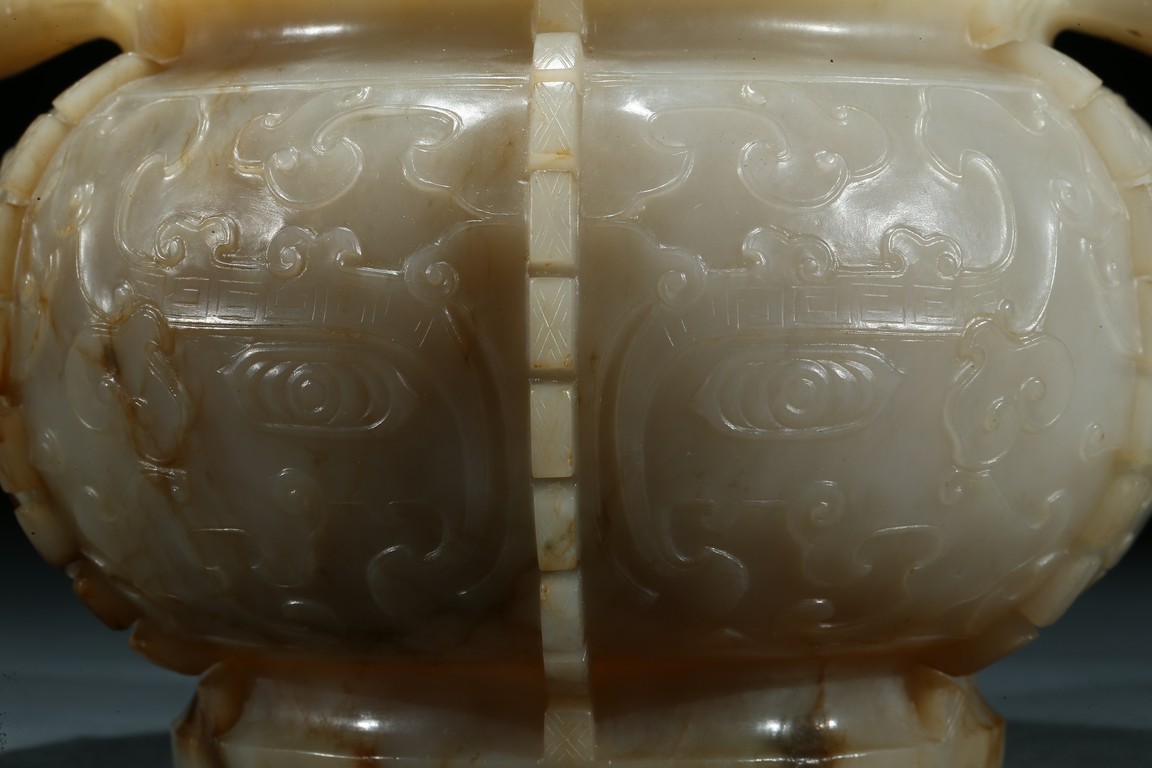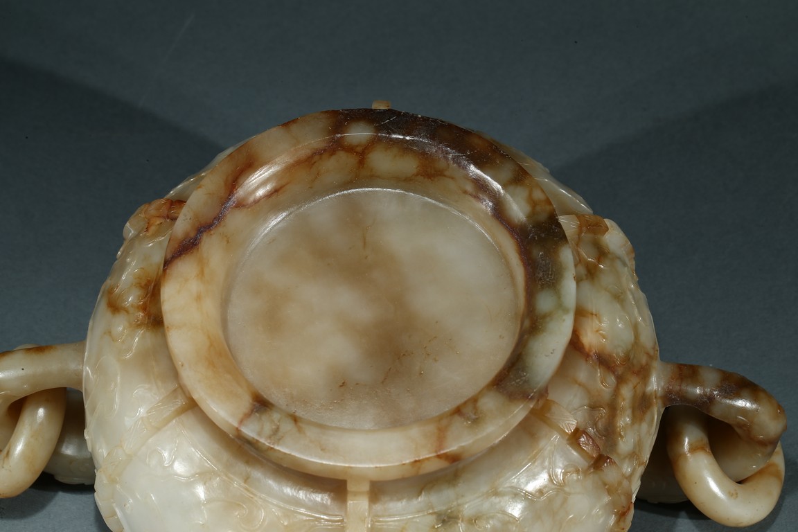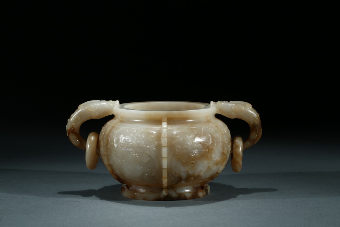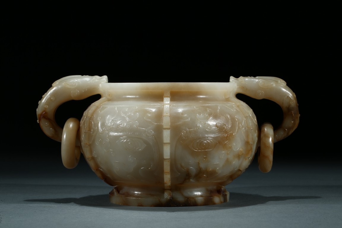 The compressed globular body with a waisted neck and lipped-rim, supported on slightly spreading foot, the rounded sides carved with two taotie mask divided by flanges, set with a pair of opposing dragon handles suspending loose rings, the translucent stone with some brownish and russet-stained veins. Ming Dynasty period.