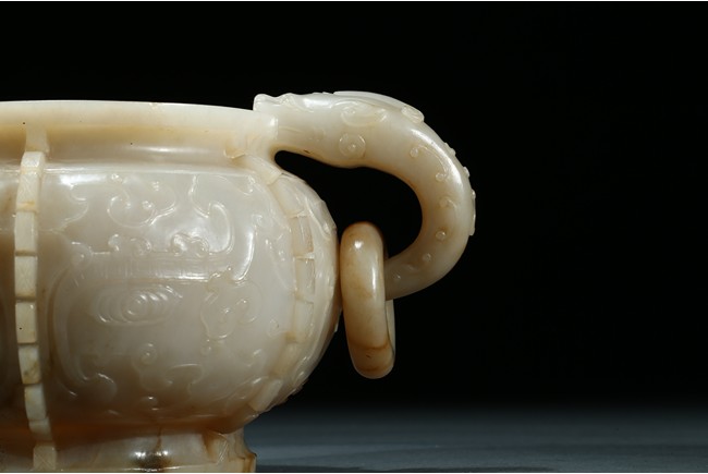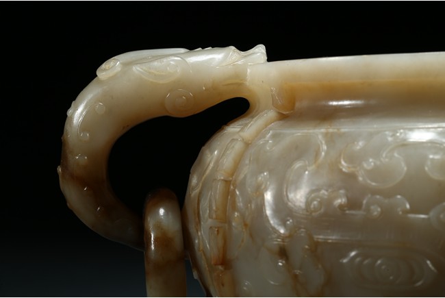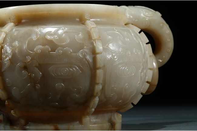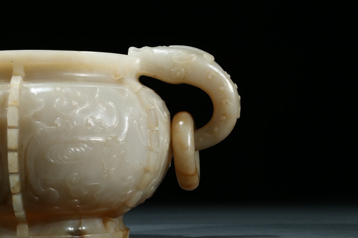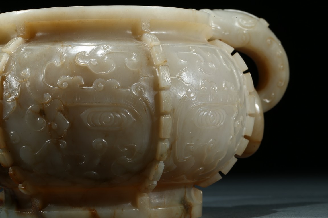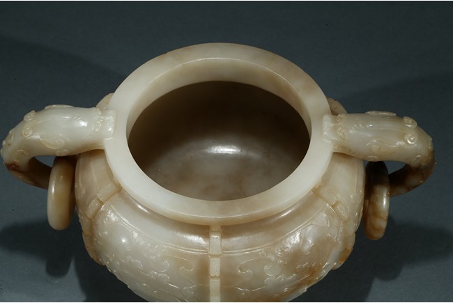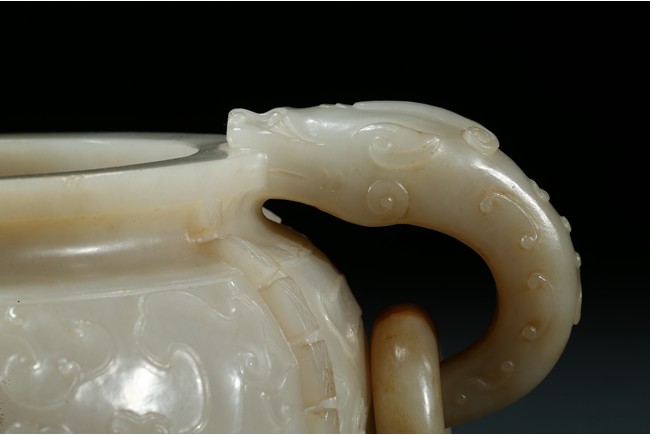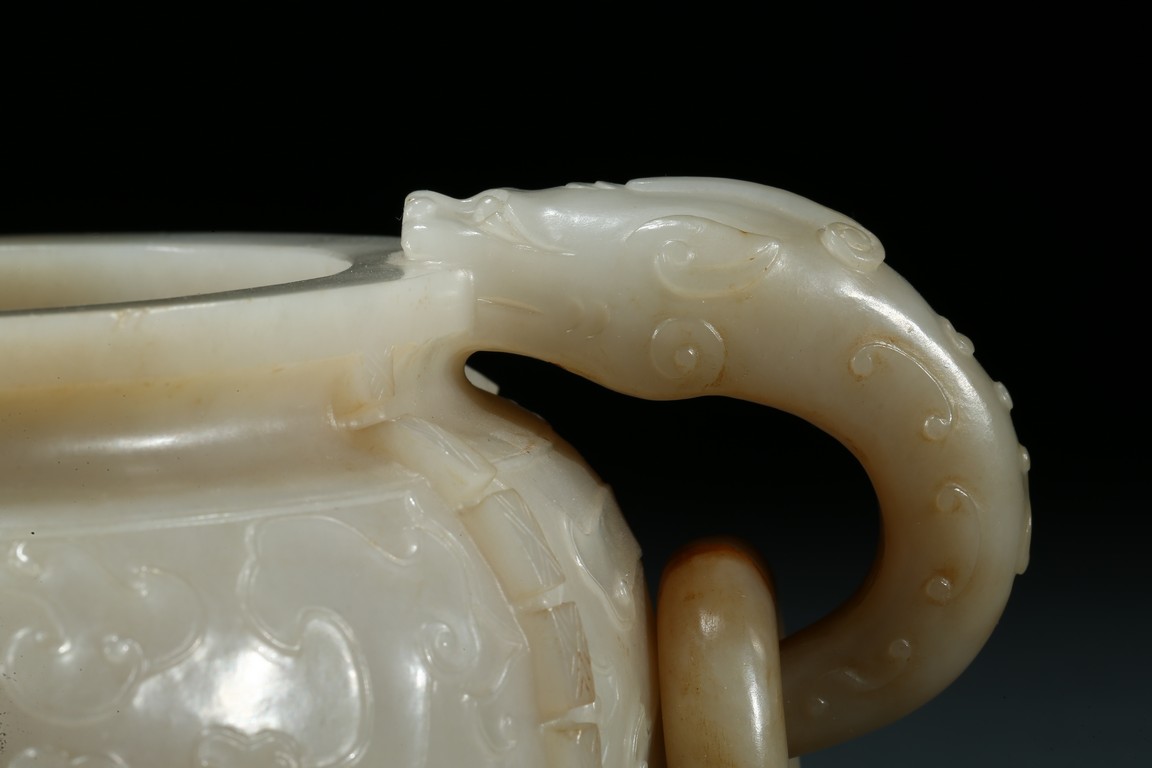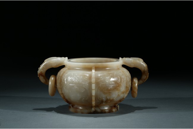 The compressed globular body with a waisted neck and lipped-rim, supported on slightly spreading foot, the rounded sides carved with two taotie mask divided by flanges, set with a pair of opposing dragon handles suspending loose rings, the translucent stone with some brownish and russet-stained veins. Ming Dynasty period.