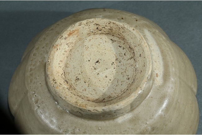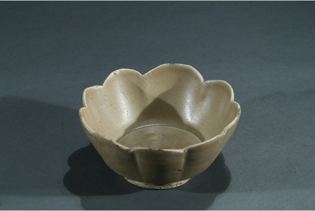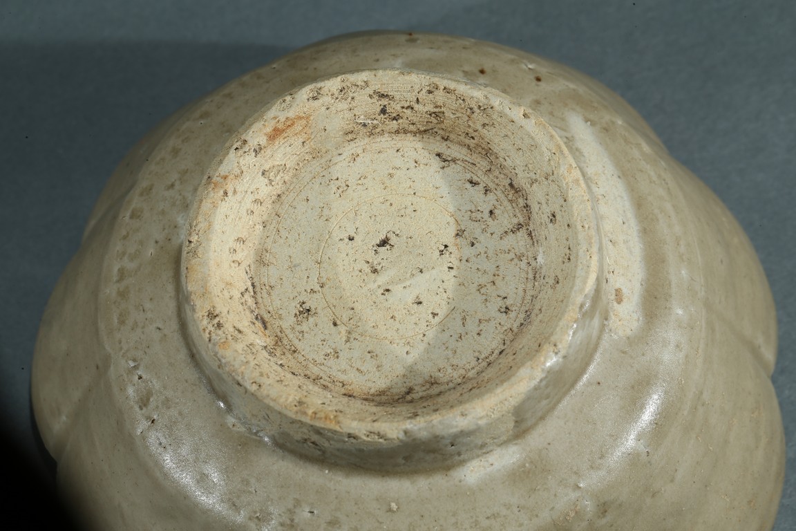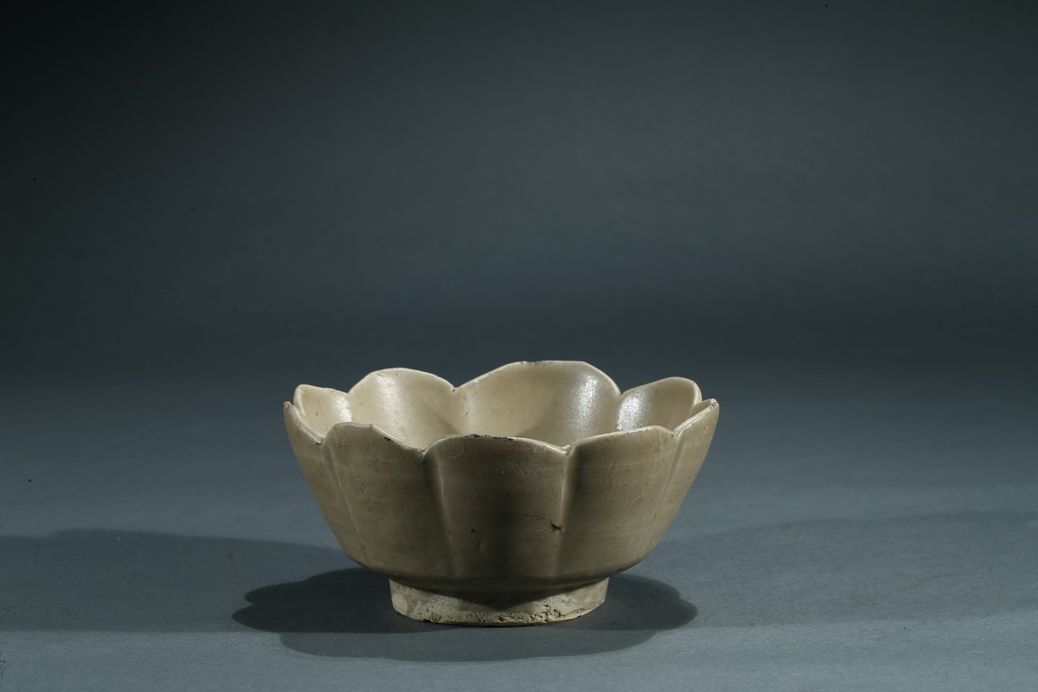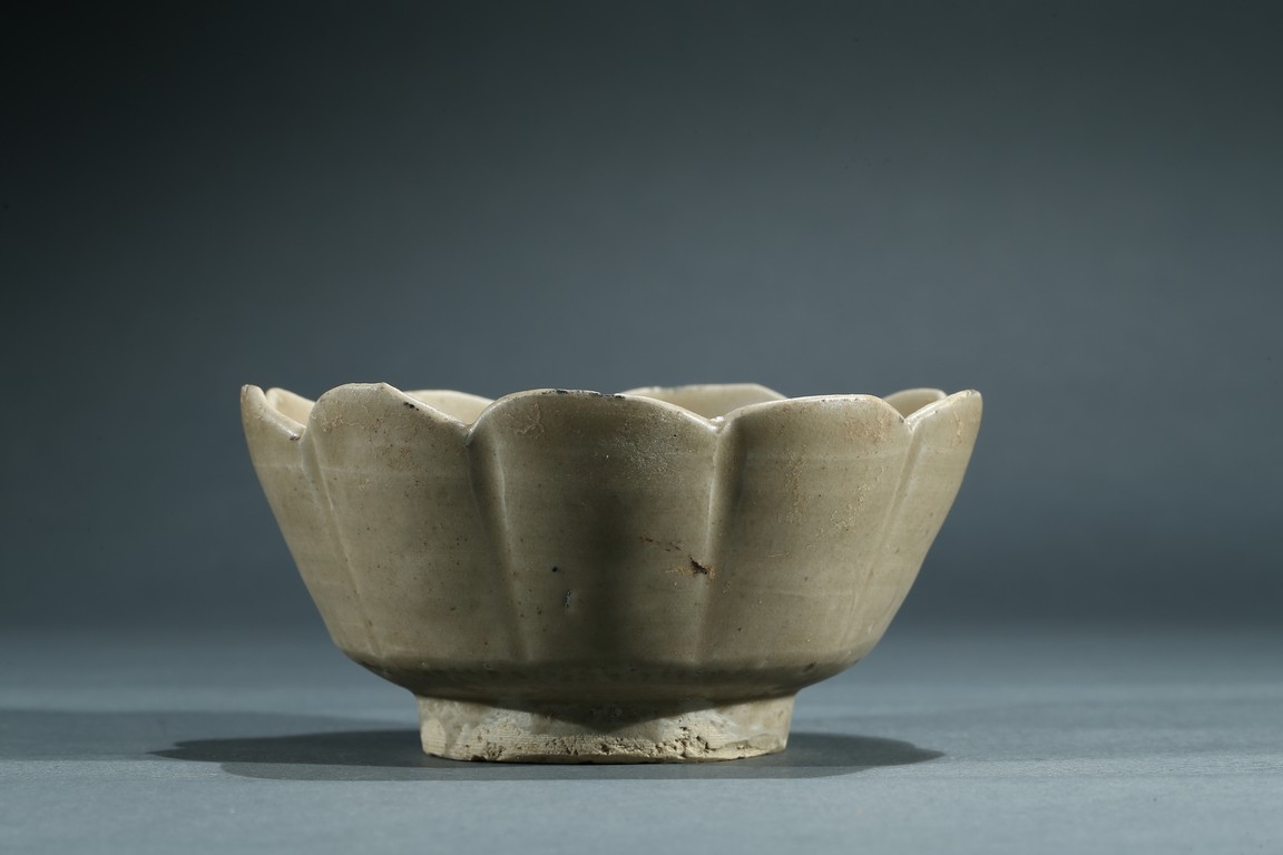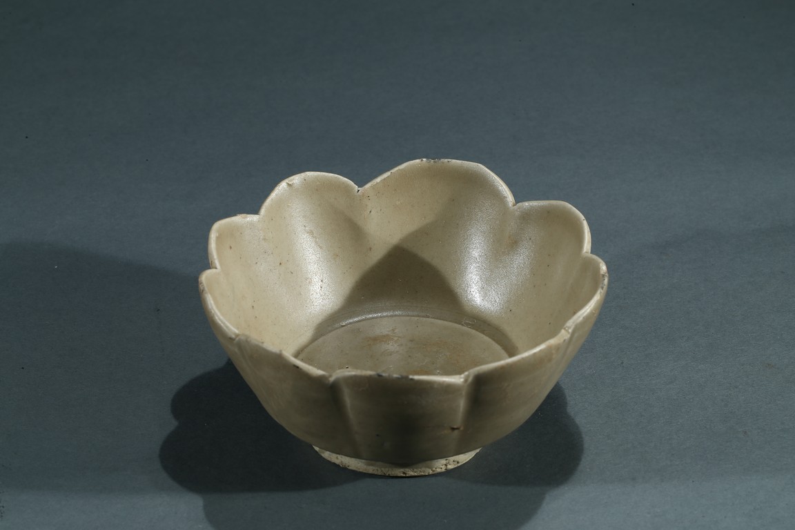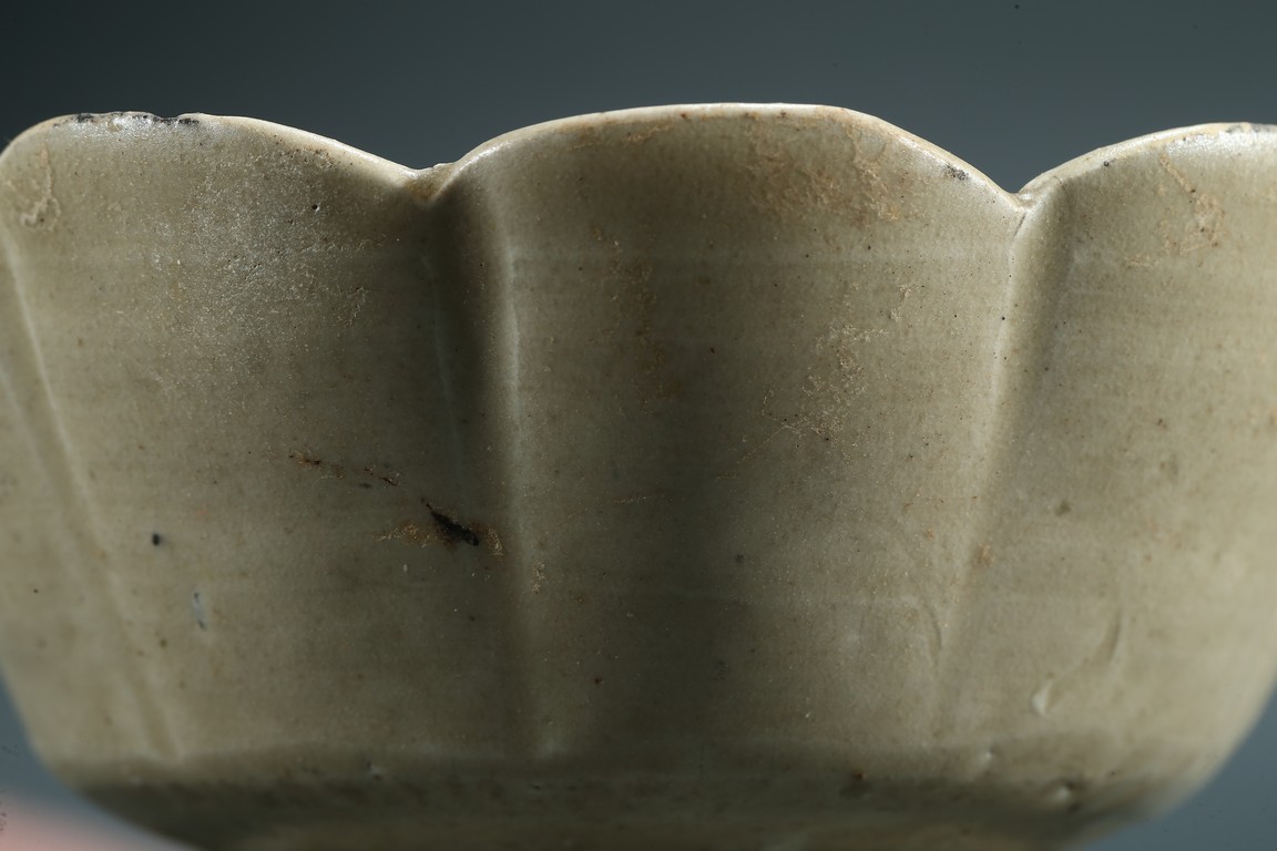 Rising from a short straight foot, the bowl of nine-lobed section with a barbed rim, applied overall with a greyish-celadon glaze. Tang Dynasty period.