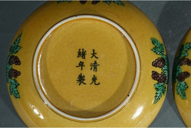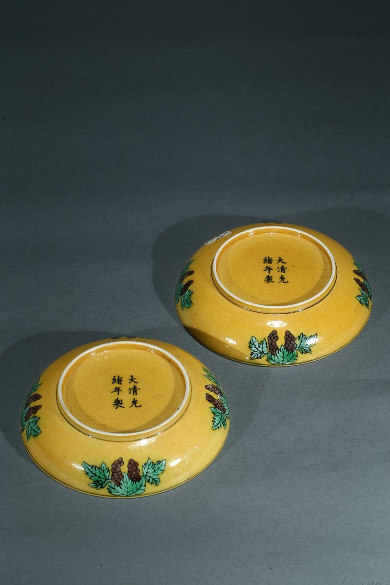 Each dish is incised and enamelled to the center of the interior with a green and an aubergine dragon contesting a flaming pearl amidst fire scrolls. The exterior is decorated with four leafy grapefruit groups. The base with six character GUANGXU mark. Qing Dynasty period.