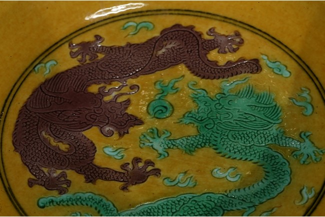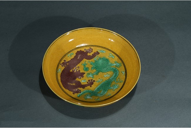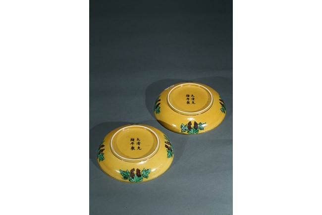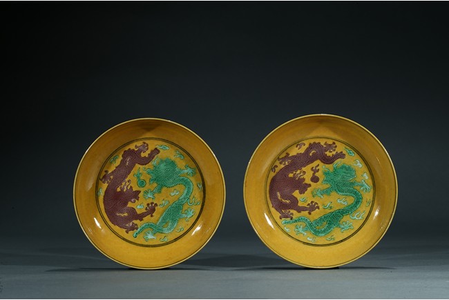 Please refer to a pair of similar yellow ground enamelled 'dragon' dishes, sold in Sotheby's New York on March 19, 2016, Lot 1409. 可參考一對類似黃底素三彩龍紋盤,售於紐約蘇富比2016年3月19日,拍品號1409。
