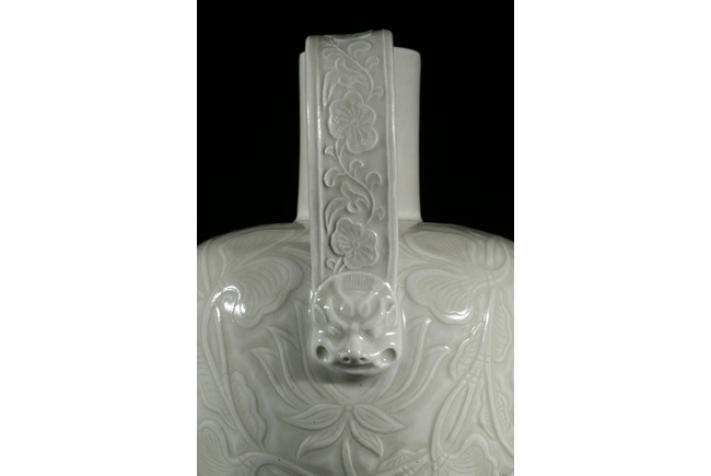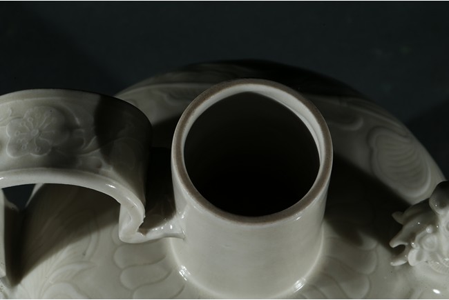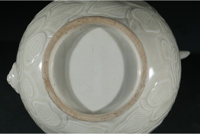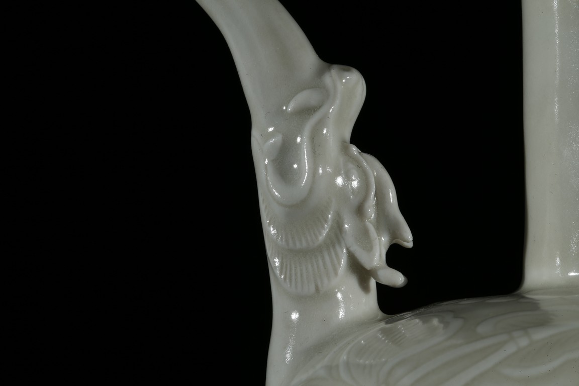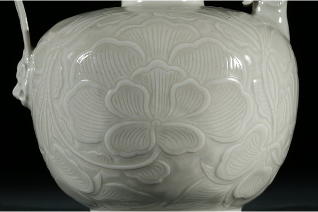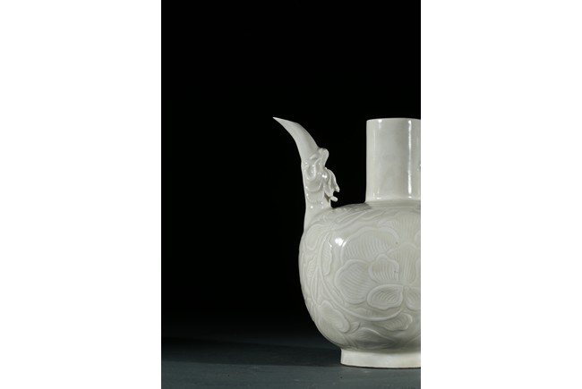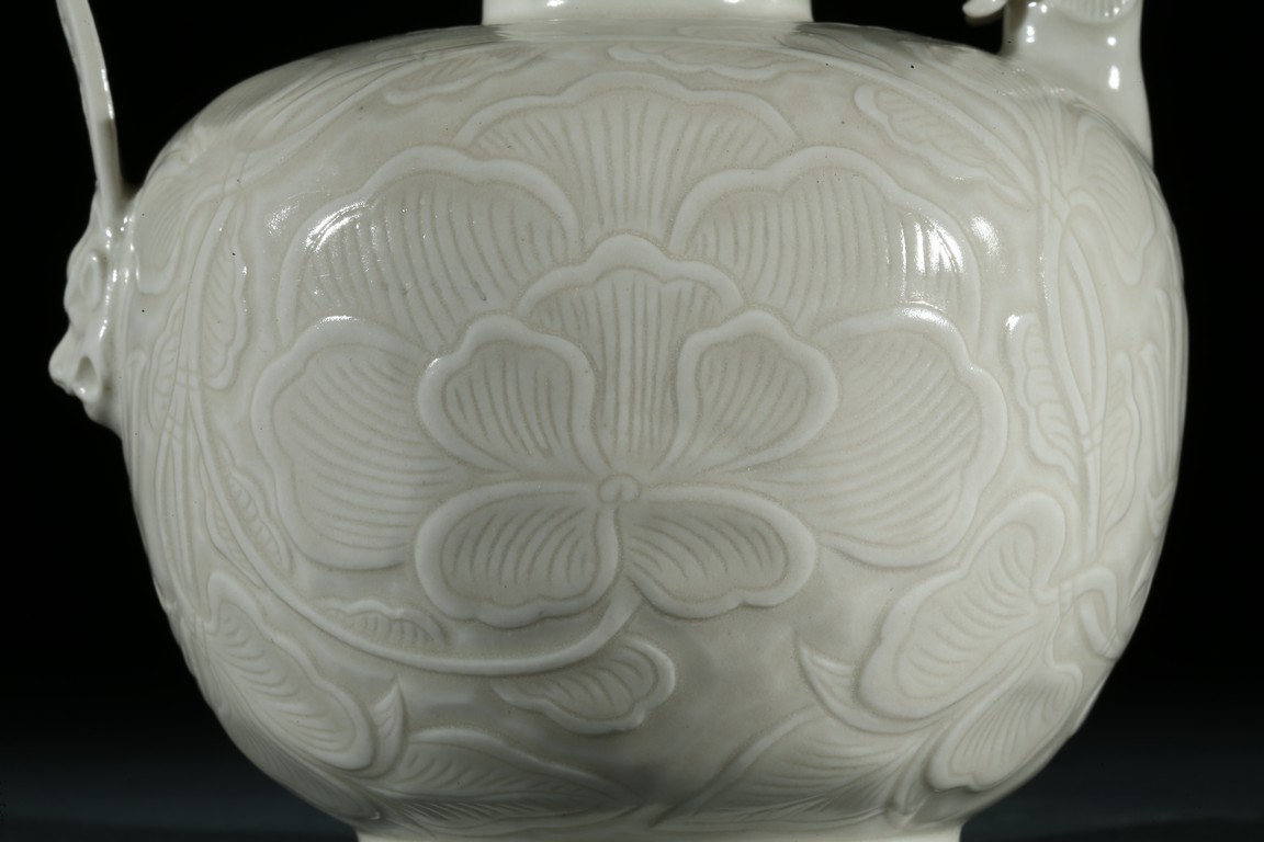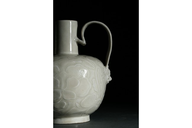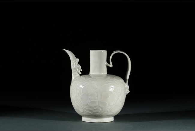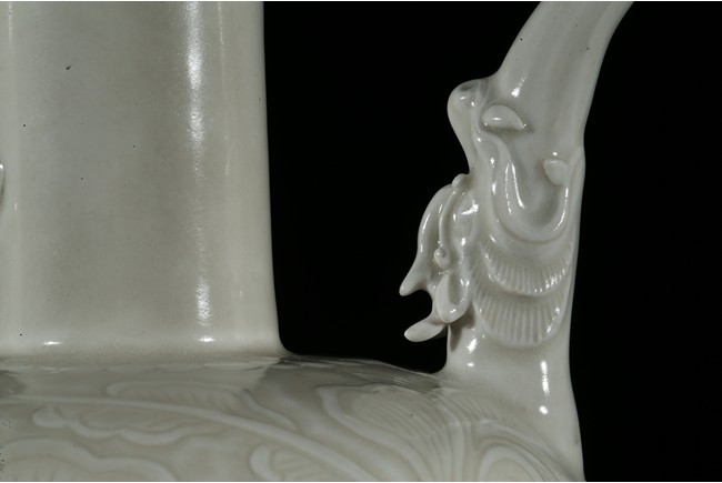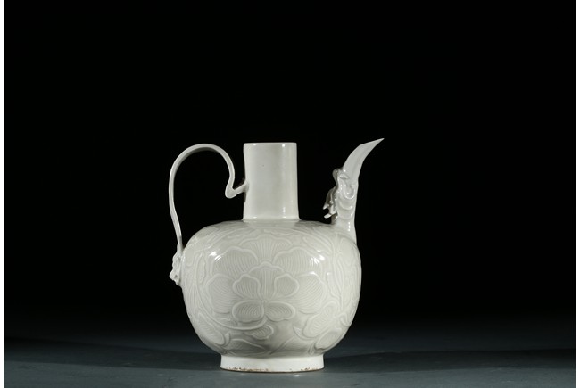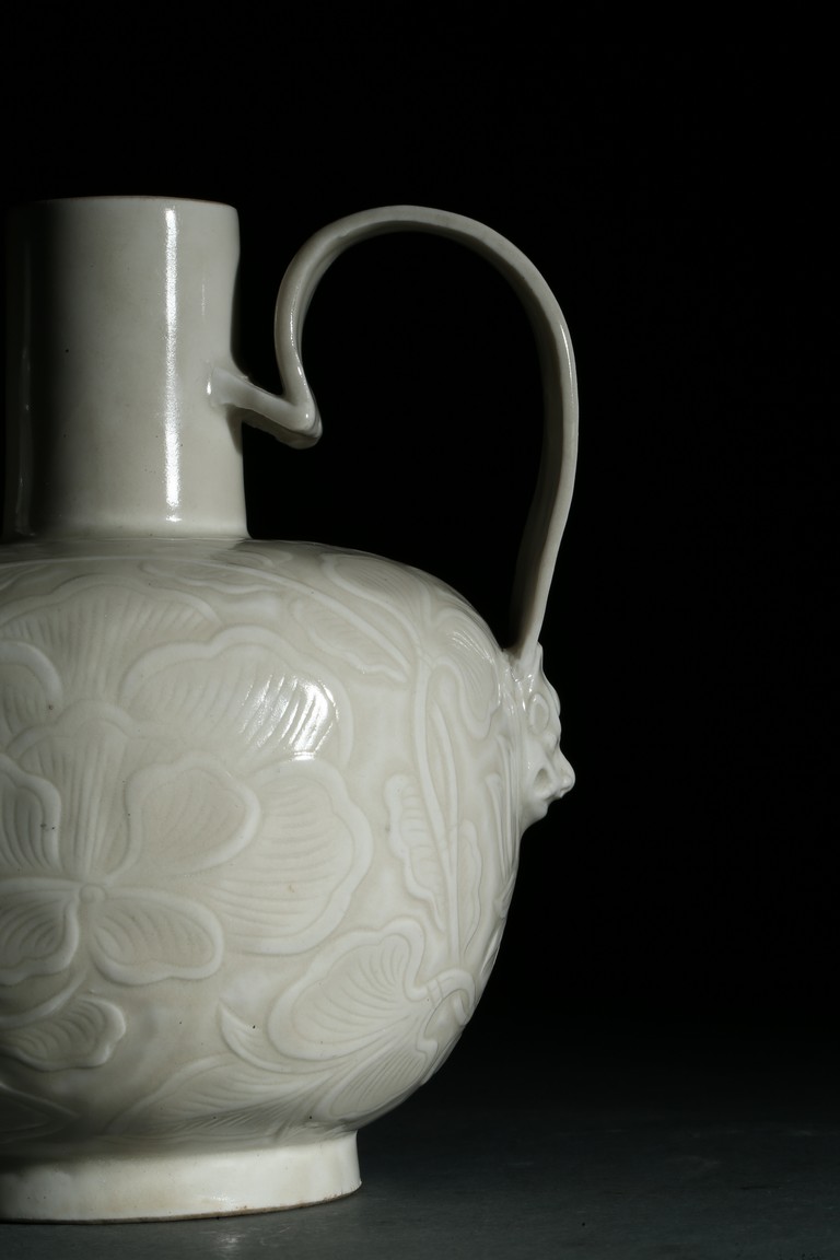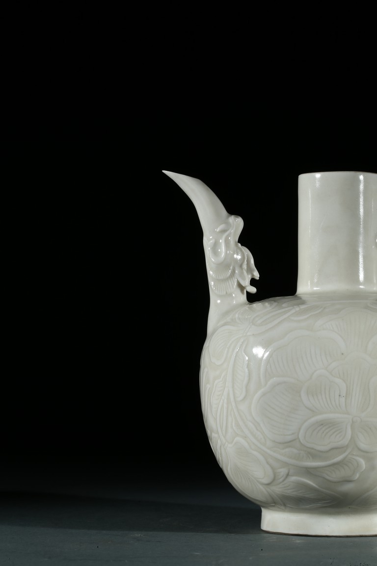The ewer is potted with rounded sides supported on a broad foot ring rising to straight tubular neck, applied to the shoulder with a gently curved spout and upright strap handle; the body exquisitely carved with lotus flower decorations, all covered with a clear pale bluish-white glaze. Song Dynasty period.
