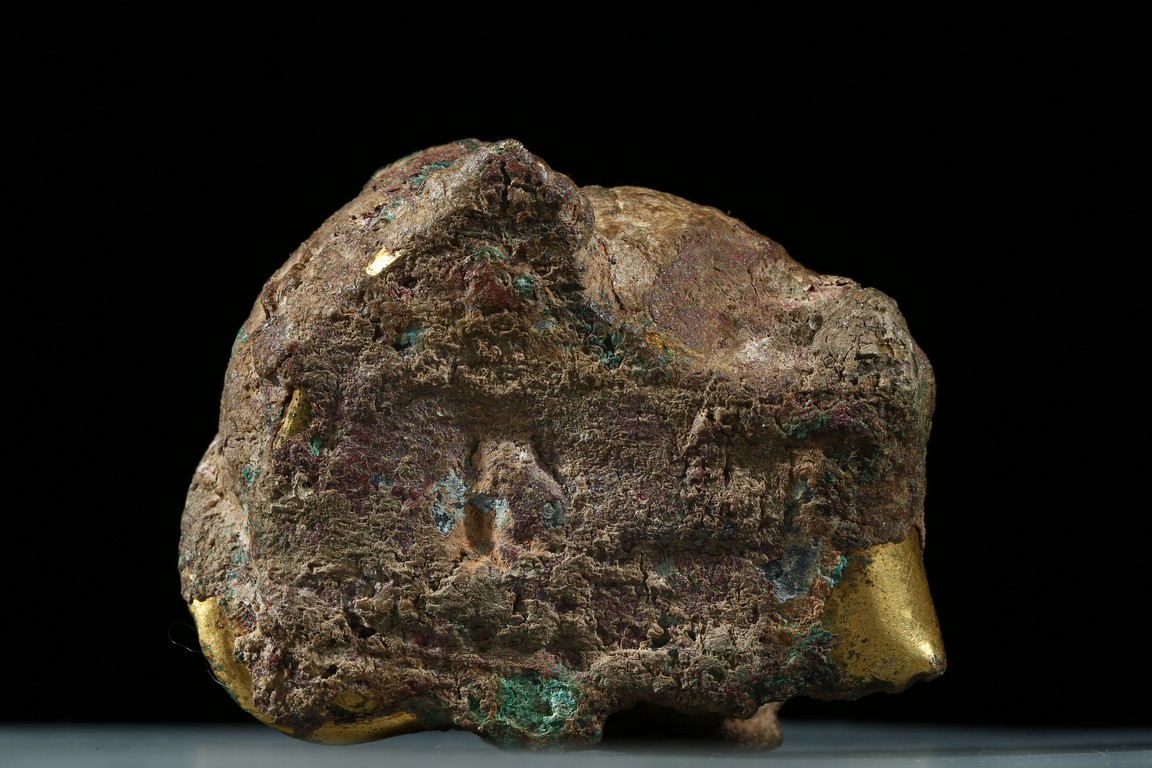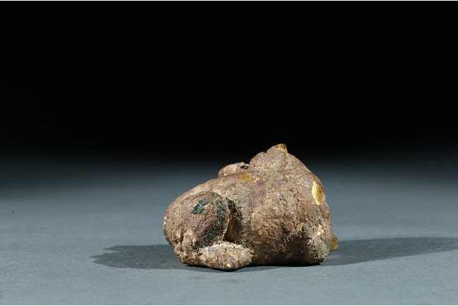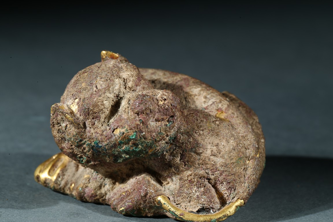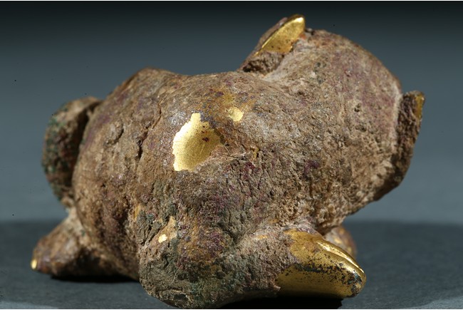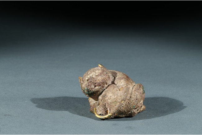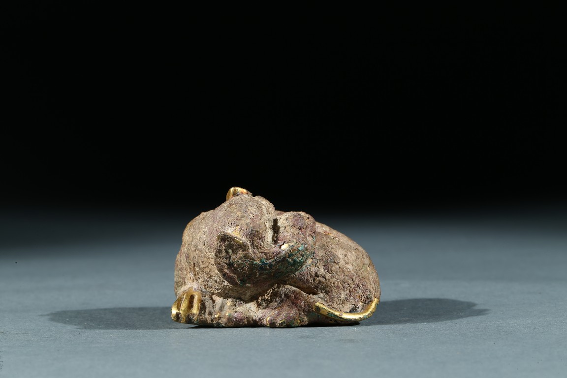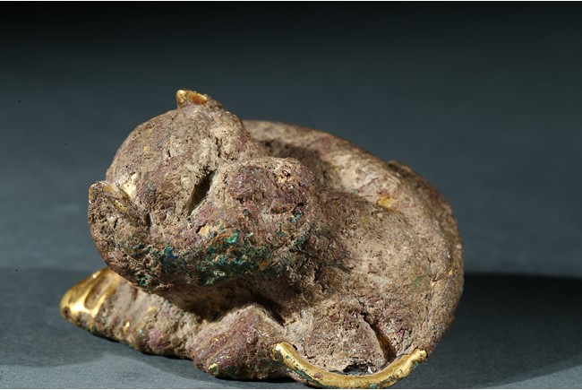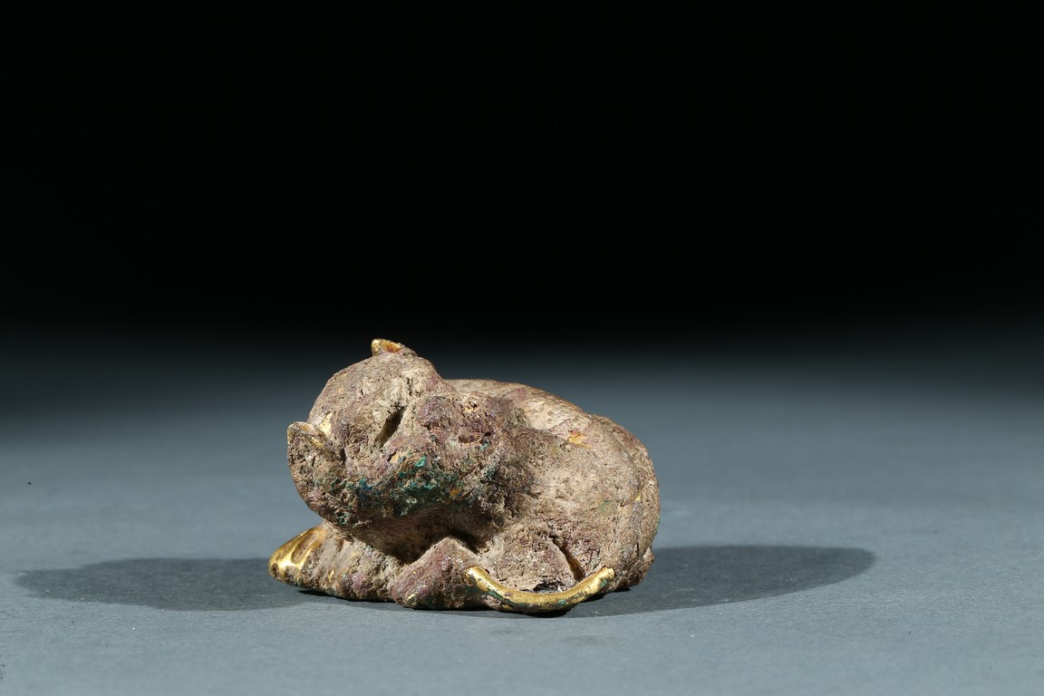 The recumbent tiger is shown with head turned to one side, tail swept to same side, with extensive encrustation covering head and body, partially revealing its gilt exterior. Han Dynasty period.