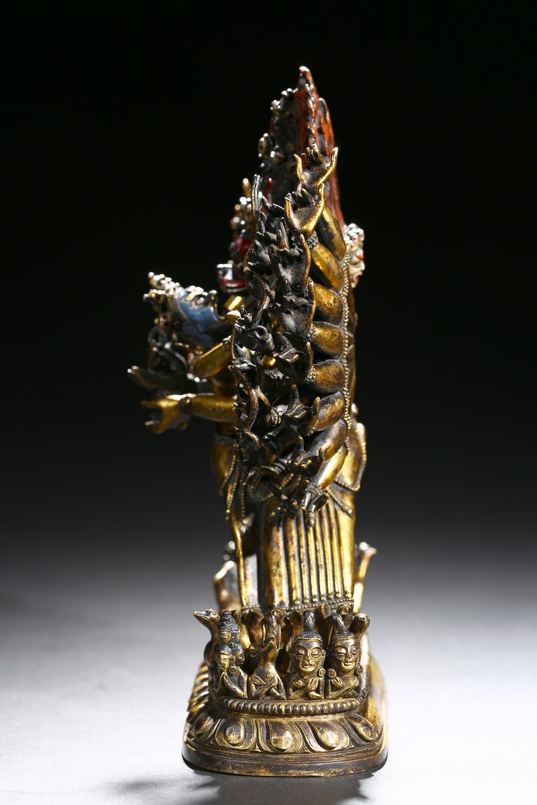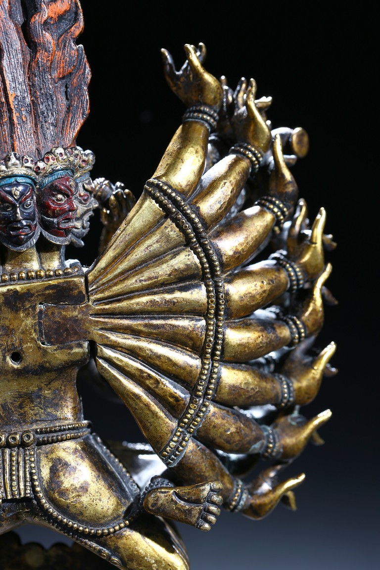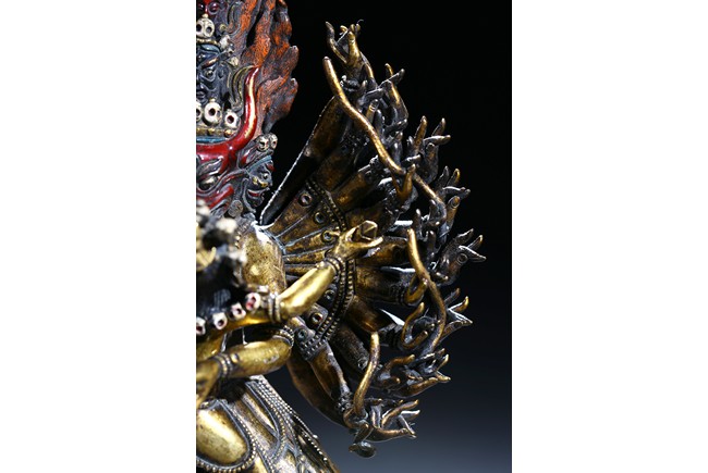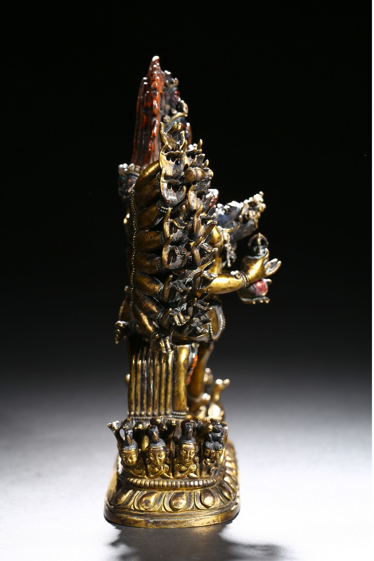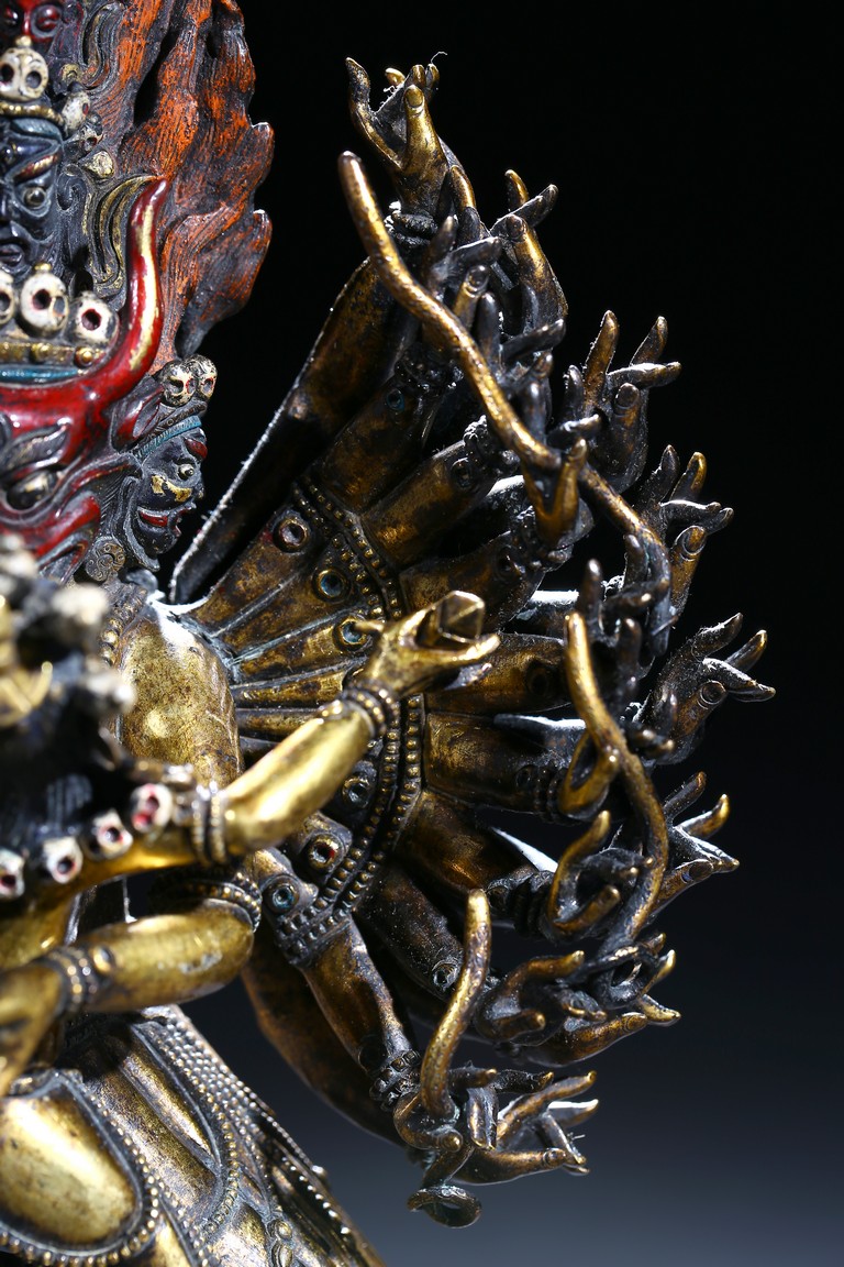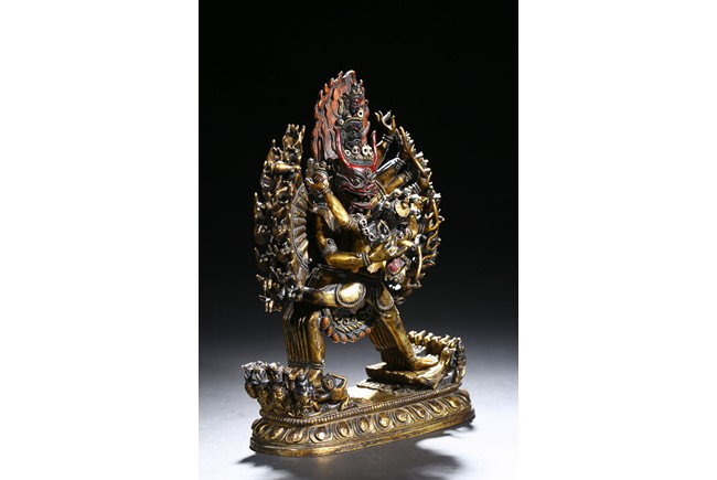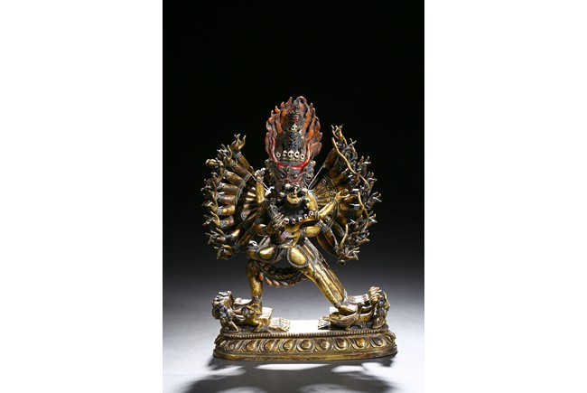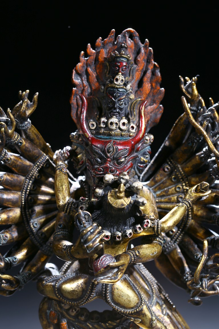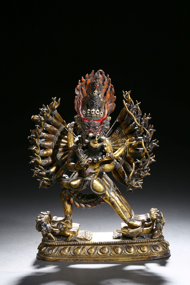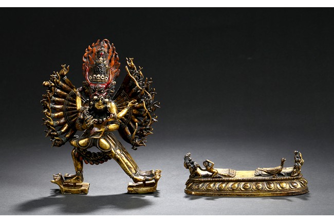 The buffalo-headed deity and his consort Yami cast standing in alidhasana atop prostrate figures, standing birds, and bovine animals, all on a lotus base, wearing a necklace of skulls, with beaded festons around the body, his many arms radiating about him and holding various attributes, his wrathful faces surmounted by his flaming hair and secured by a tiara of skulls. Qing Dynasty period.
