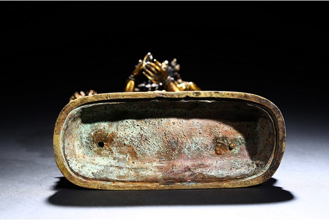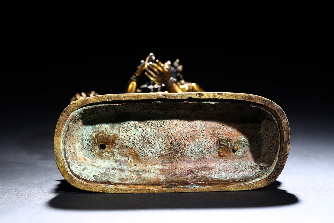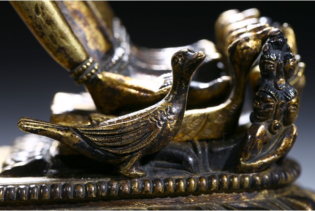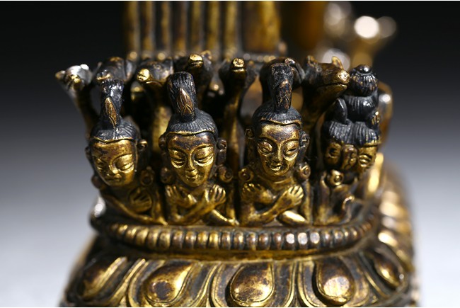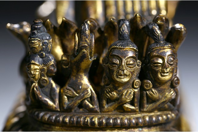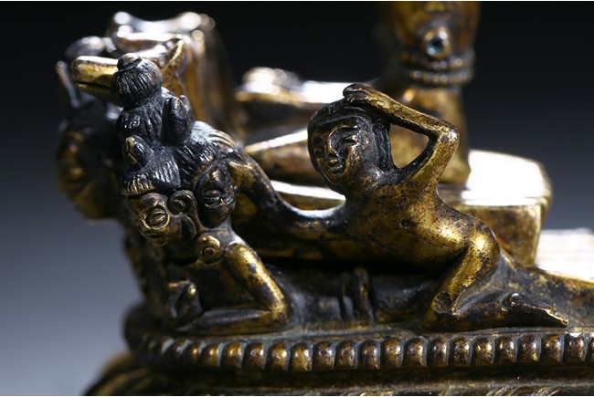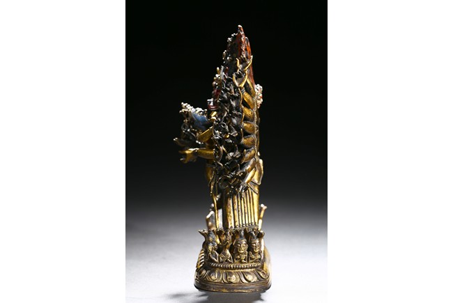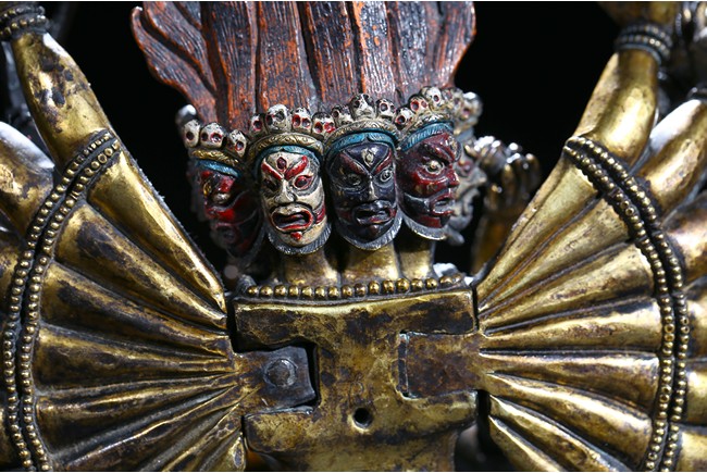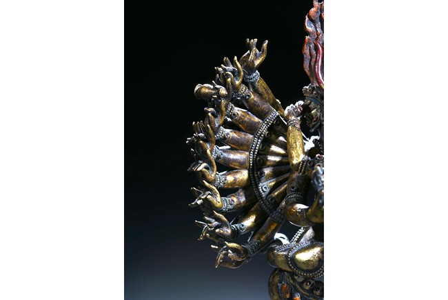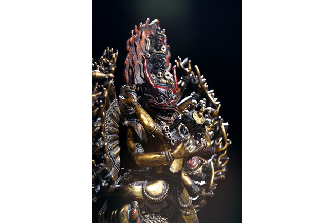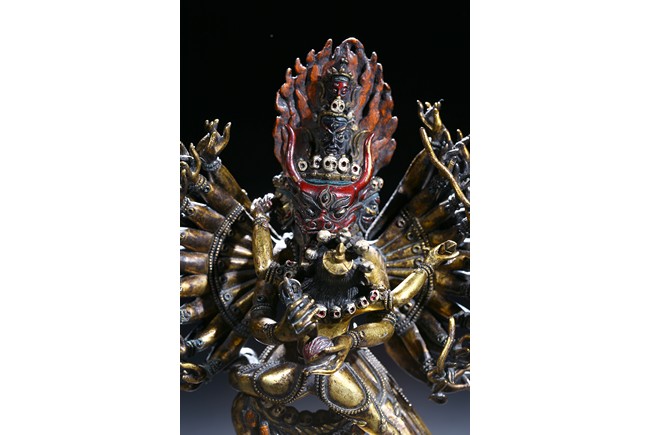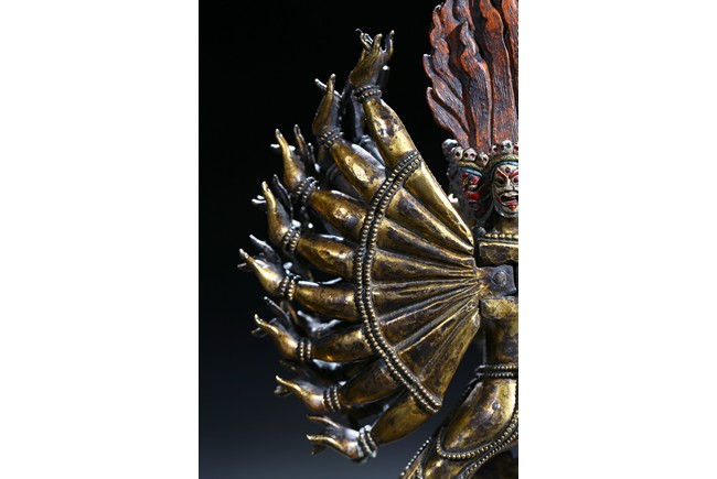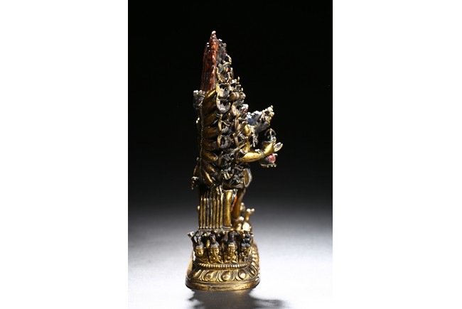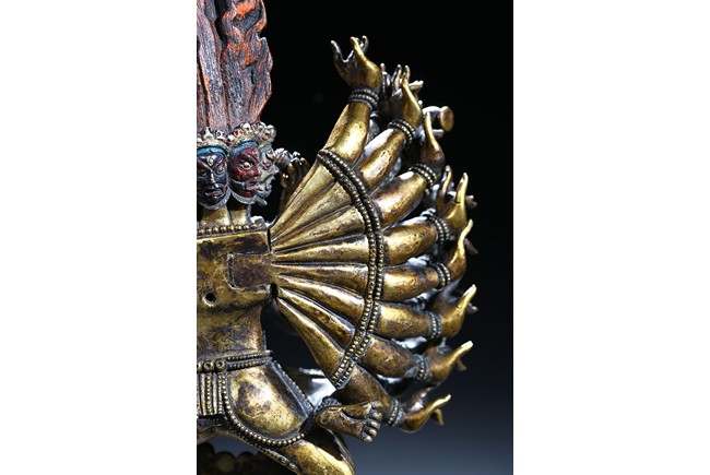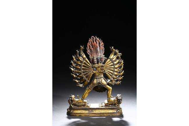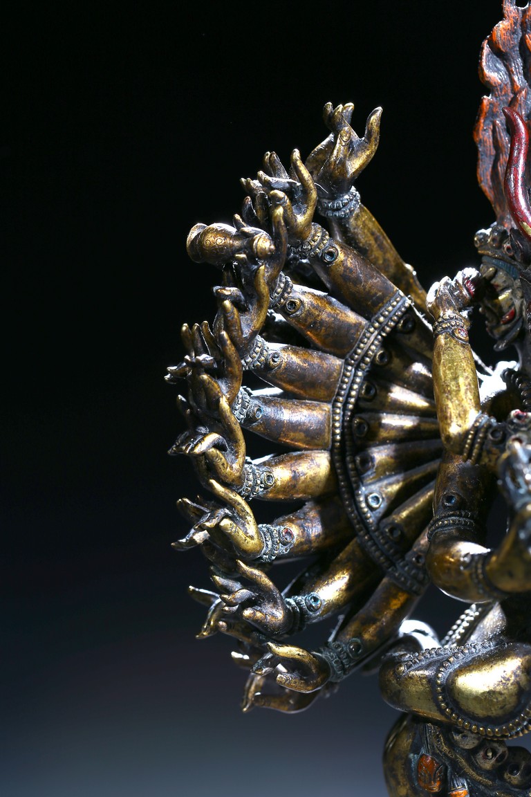 The buffalo-headed deity and his consort Yami cast standing in alidhasana atop prostrate figures, standing birds, and bovine animals, all on a lotus base, wearing a necklace of skulls, with beaded festons around the body, his many arms radiating about him and holding various attributes, his wrathful faces surmounted by his flaming hair and secured by a tiara of skulls. Qing Dynasty period.