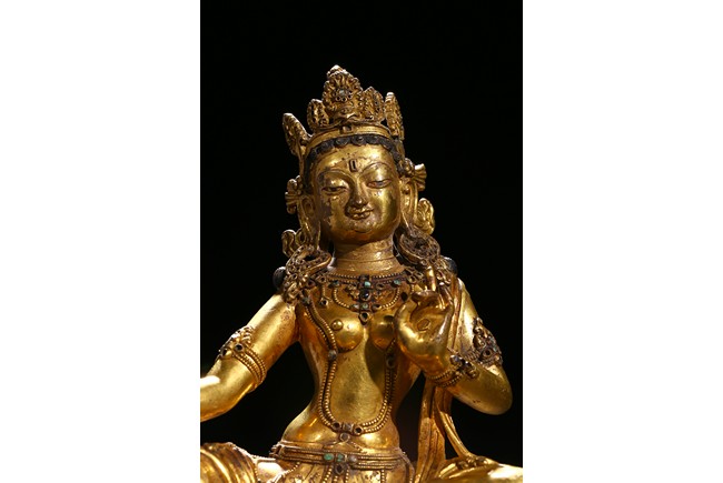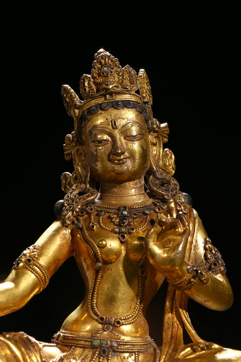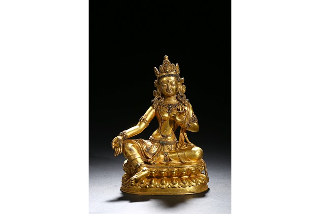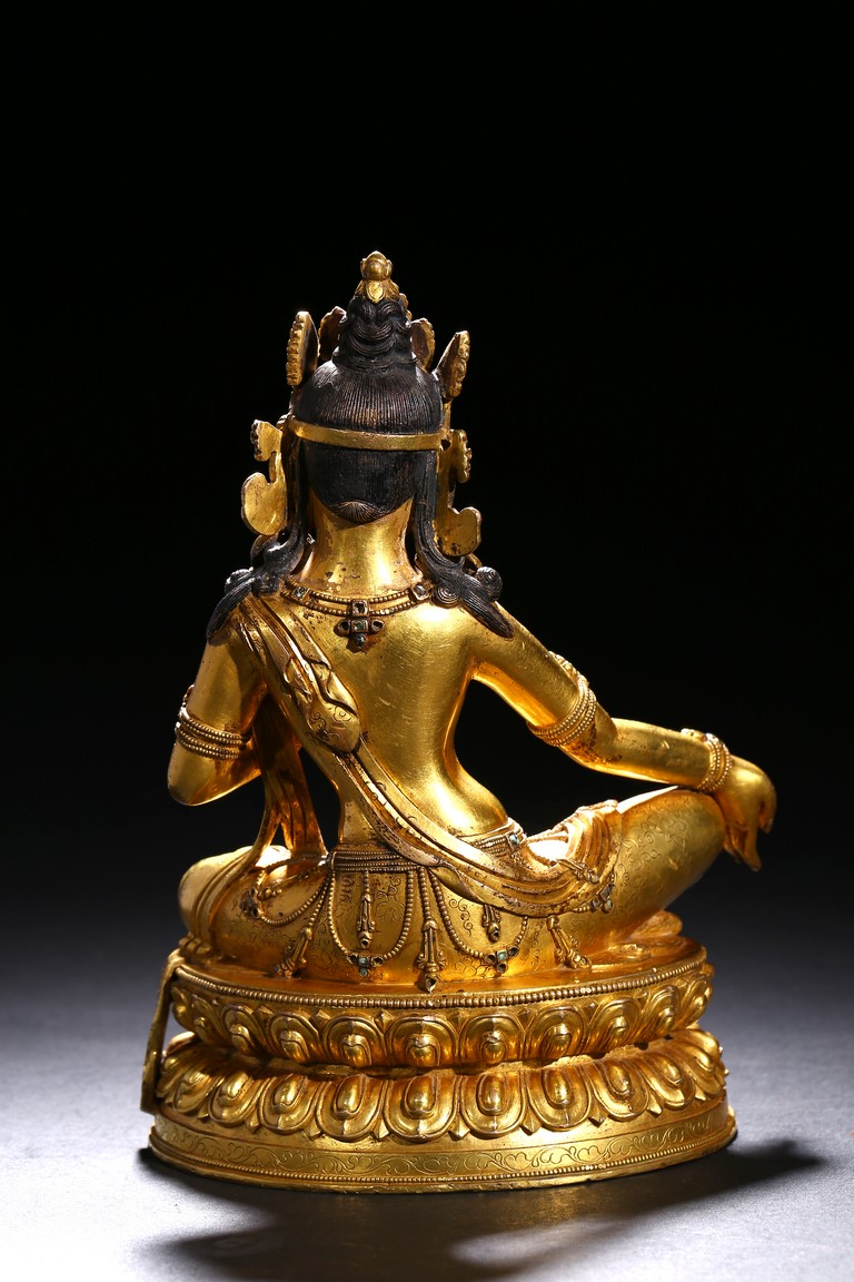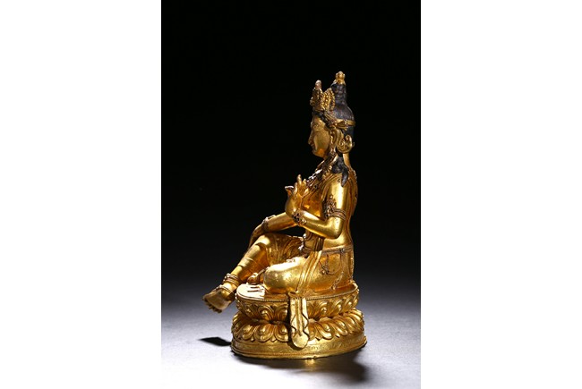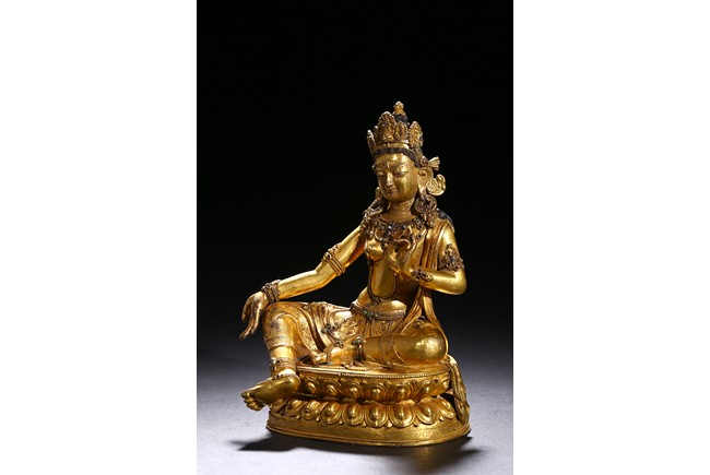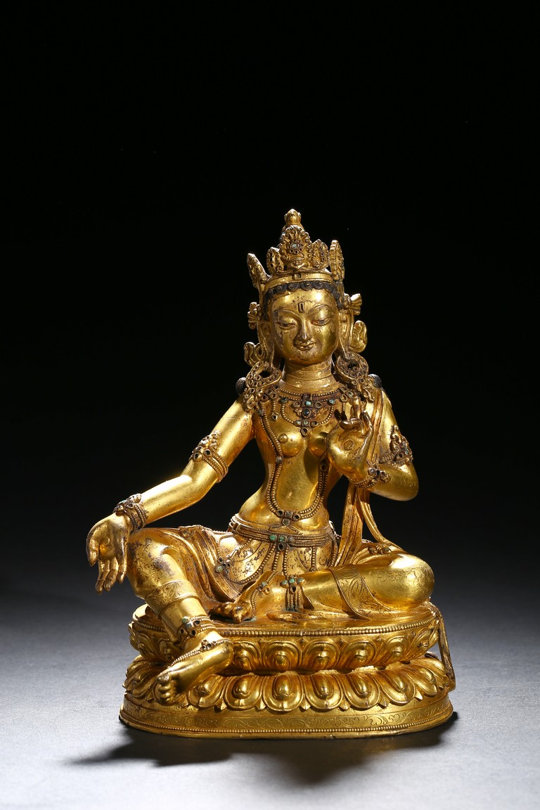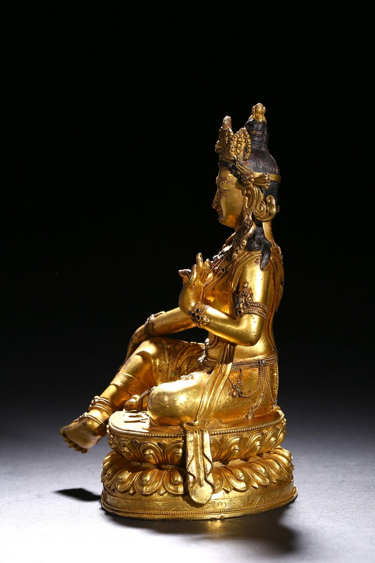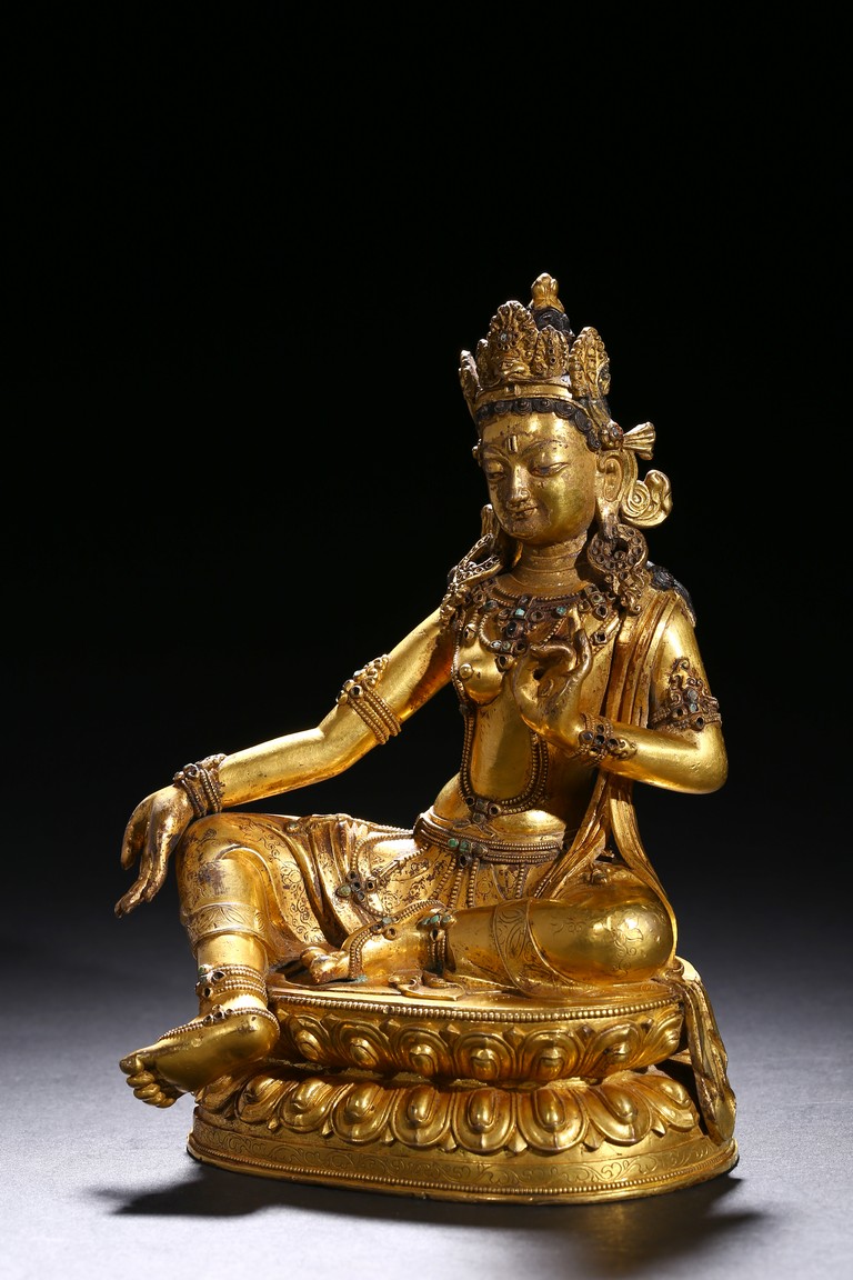 Seated in lalitasana on a double-lotus base, the right hand held in varada mudra and the left raised to the chest in vitarkamudra, wearing a dhoti and a loose shawl over the shoulder, adorned with bejewelled necklaces around the waist and the chest, the face with a benevolent expression, crowned with leaf tiara around a high chigon. Qing Dynasty period.