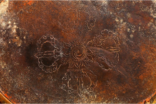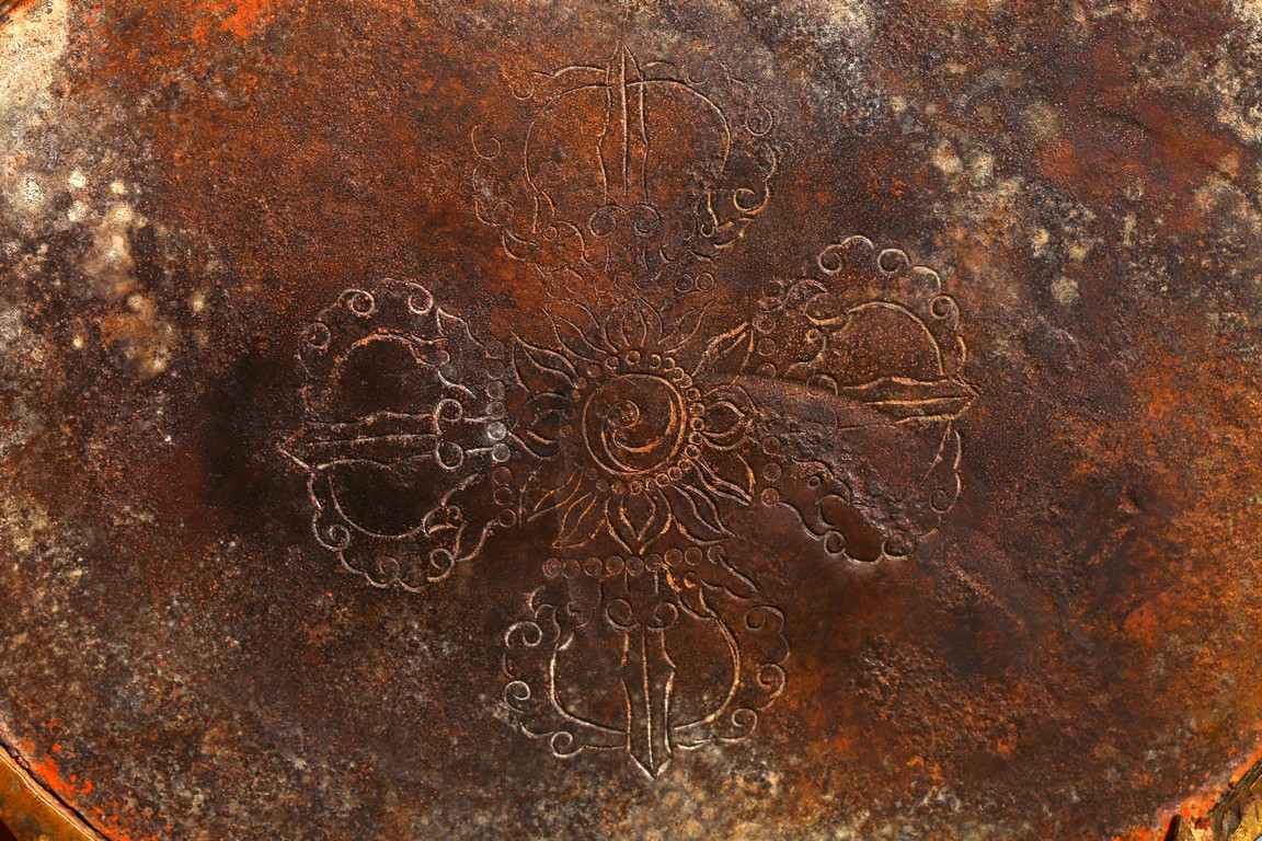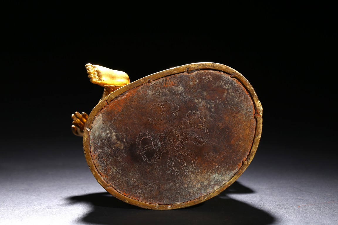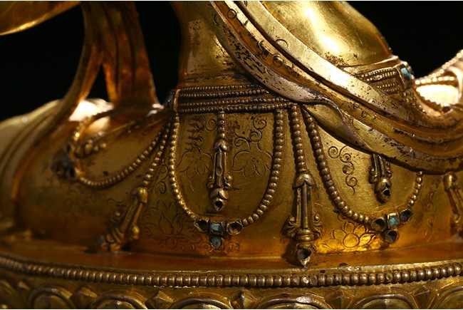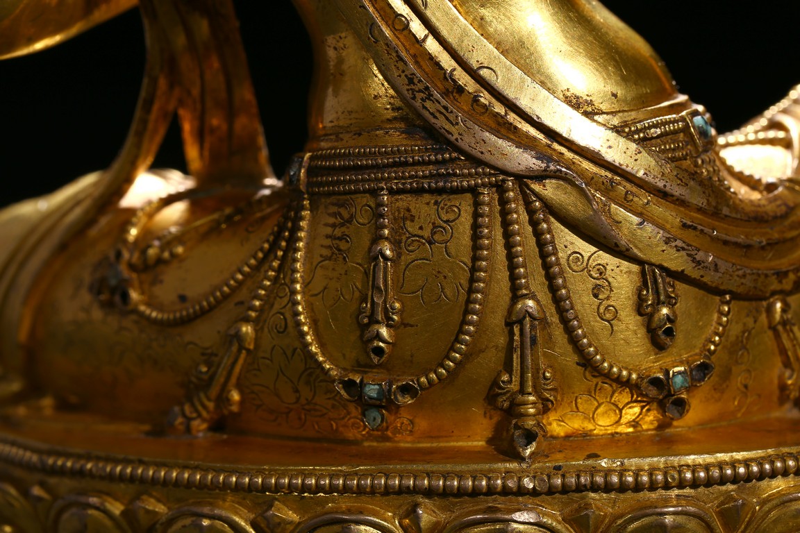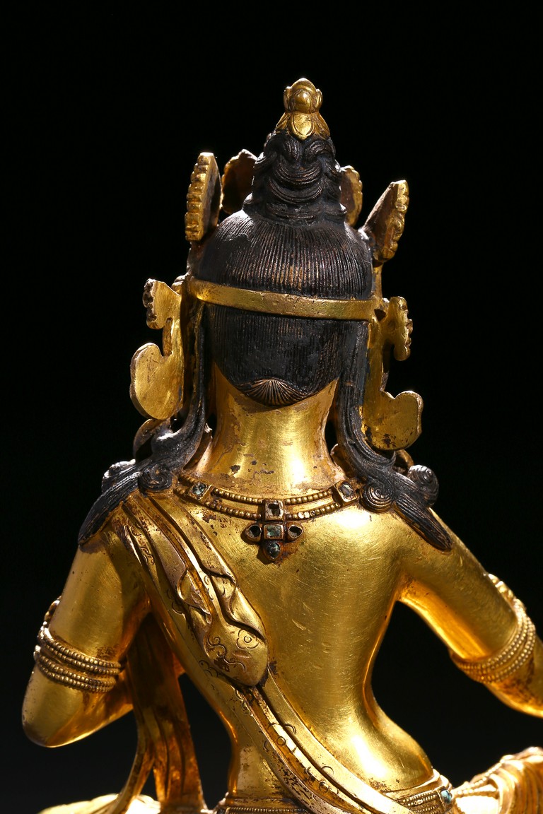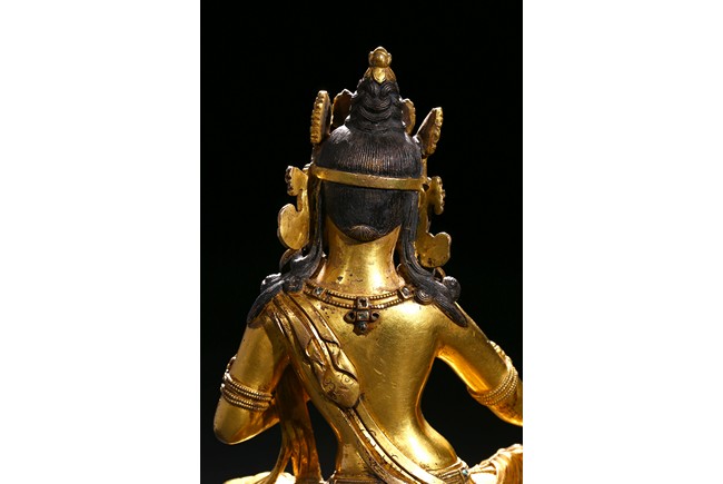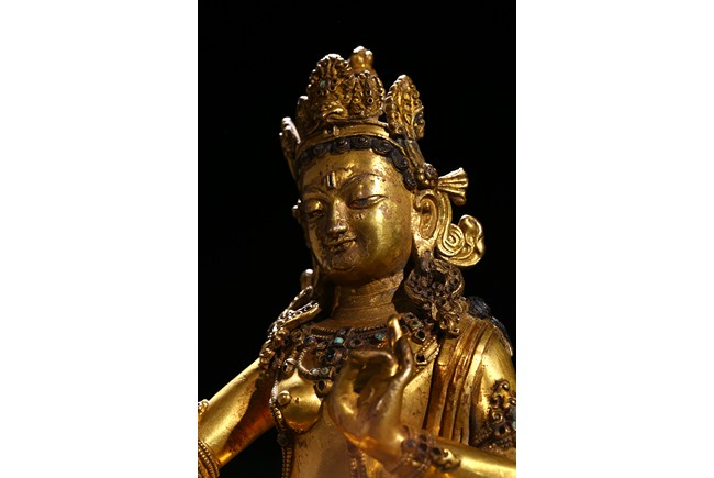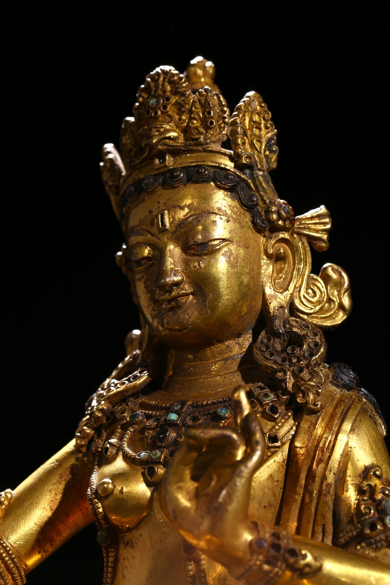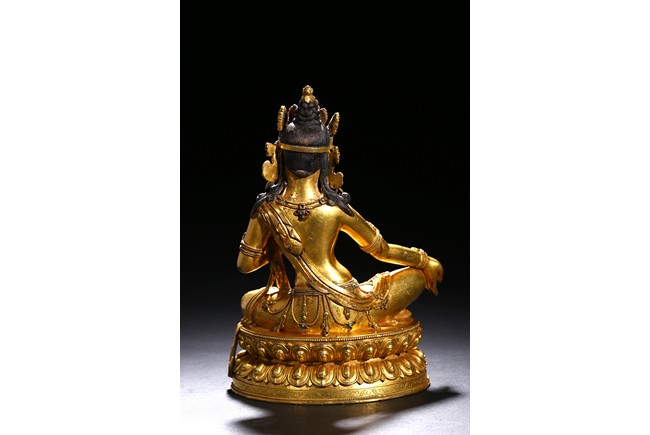 Seated in lalitasana on a double-lotus base, the right hand held in varada mudra and the left raised to the chest in vitarkamudra, wearing a dhoti and a loose shawl over the shoulder, adorned with bejewelled necklaces around the waist and the chest, the face with a benevolent expression, crowned with leaf tiara around a high chigon. Qing Dynasty period.