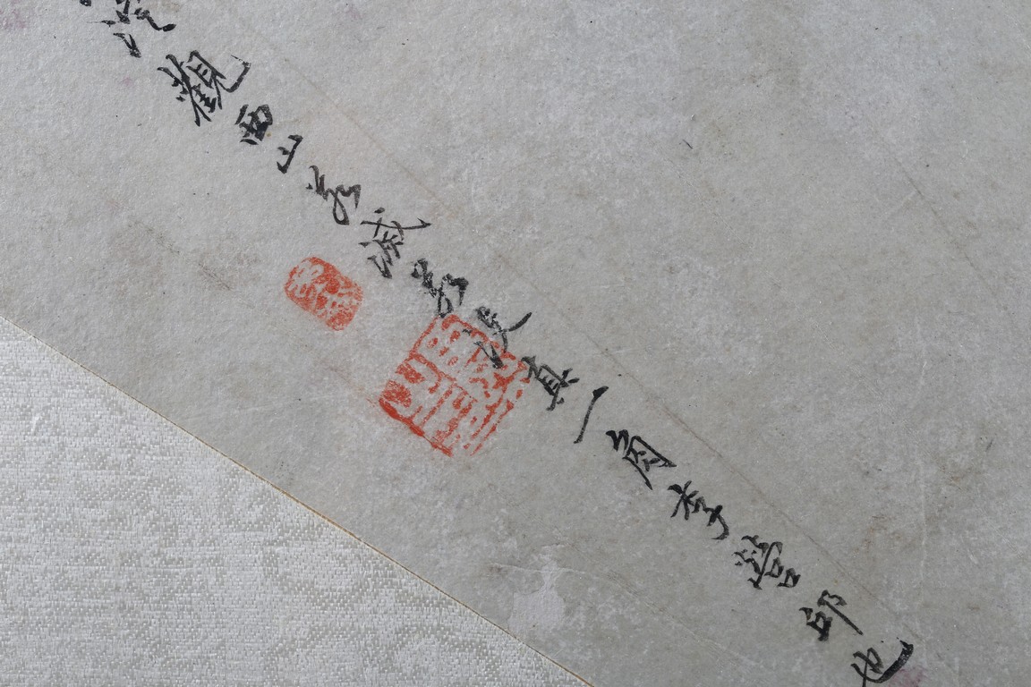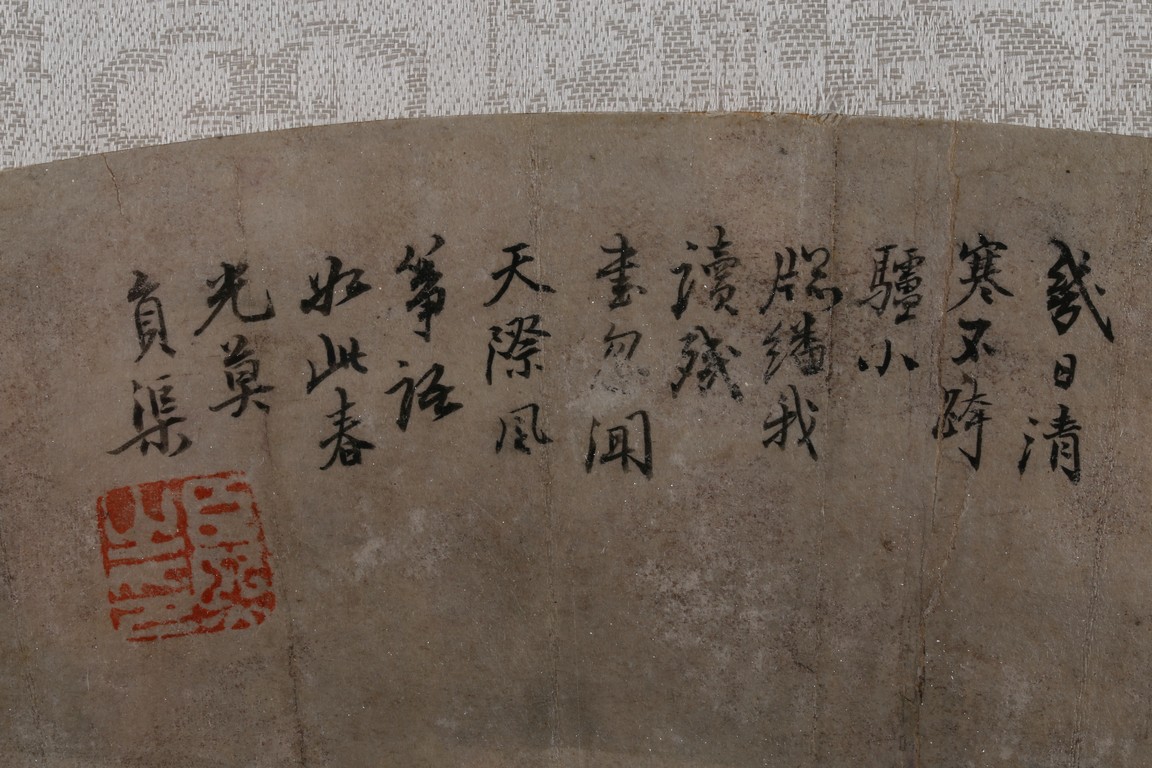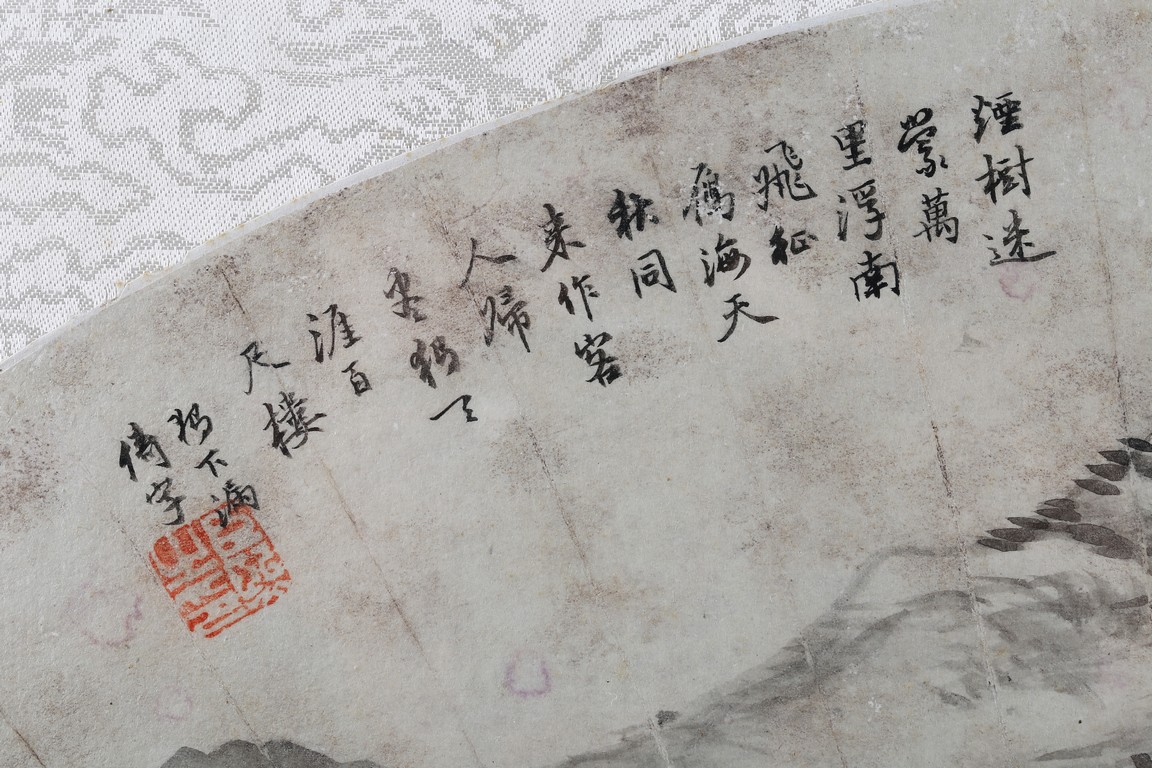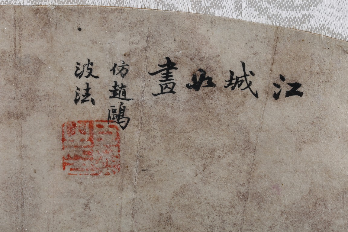 Ink and color on paper. Landscape. Fan leaf. Inscribed and each with seal mark.