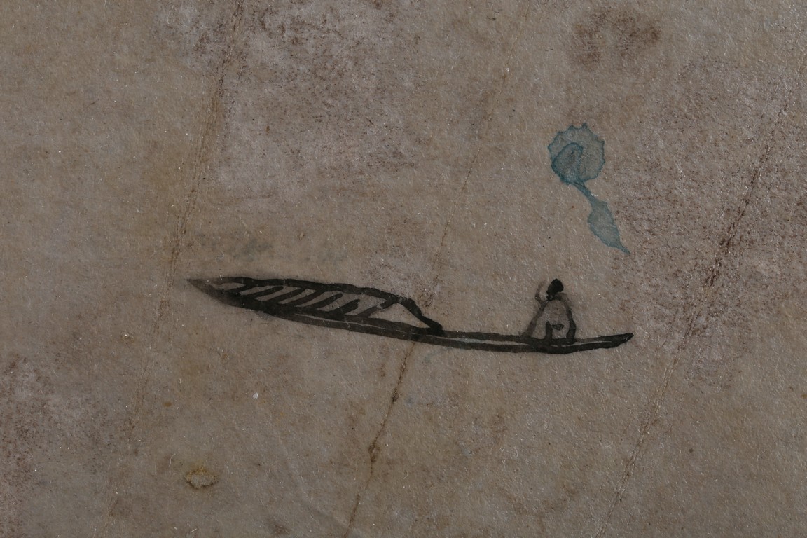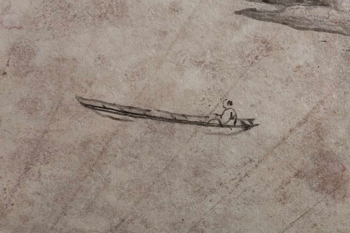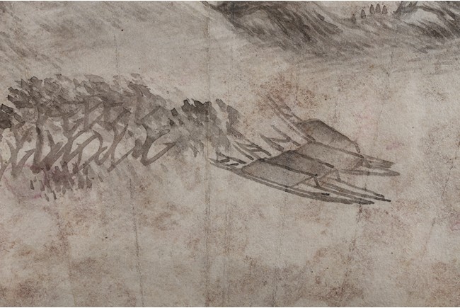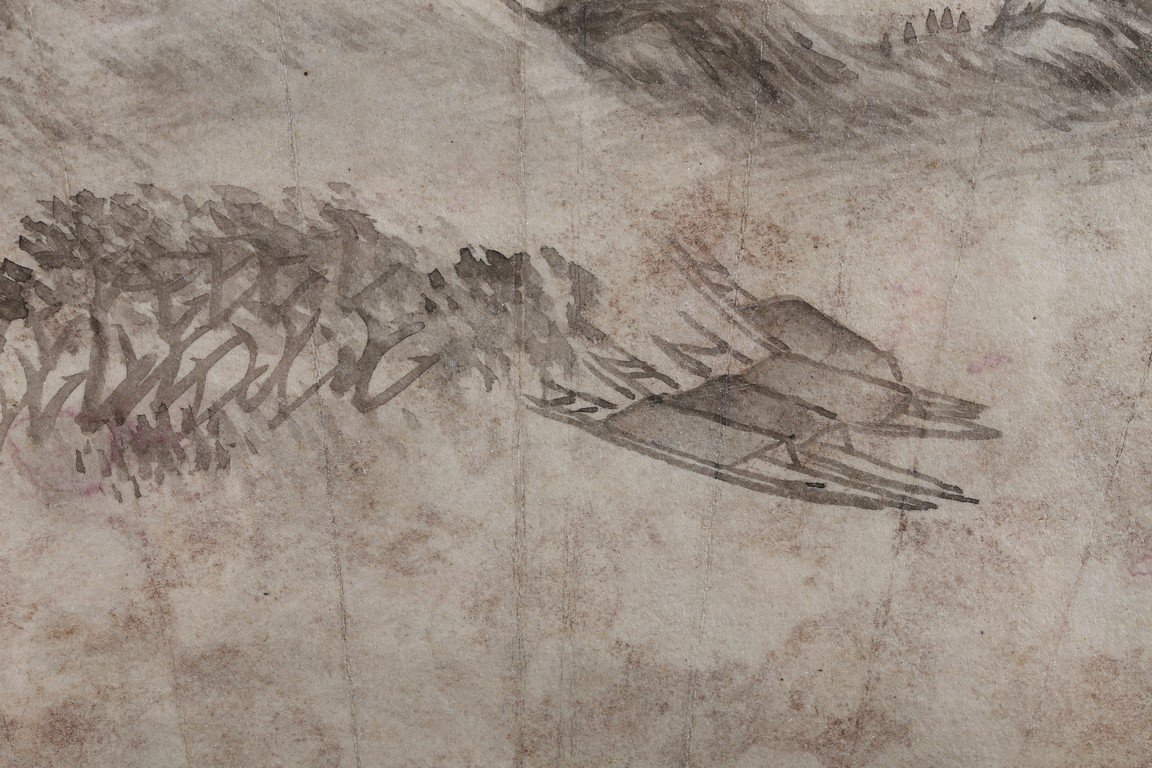 Ink and color on paper. Landscape. Fan leaf. Inscribed and each with seal mark.