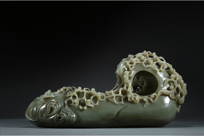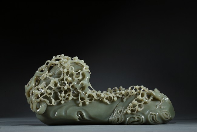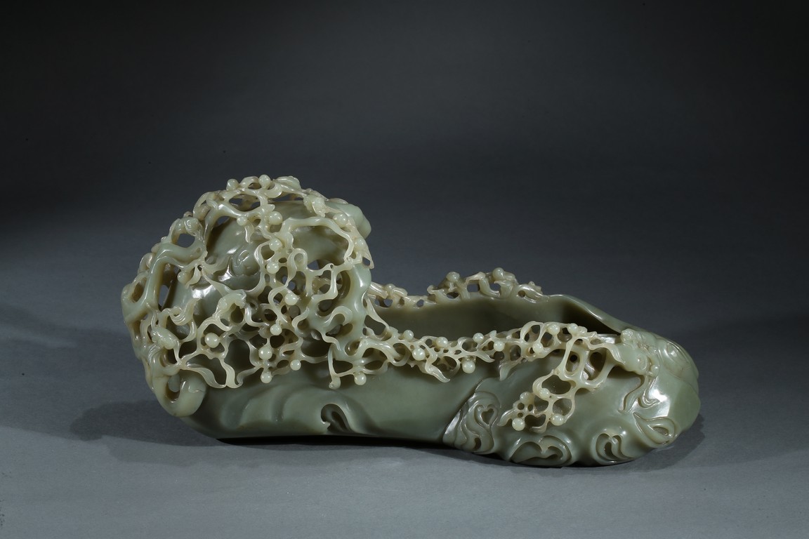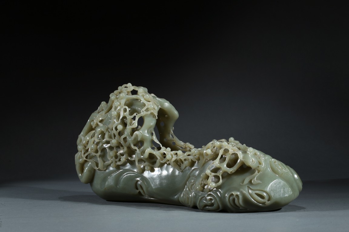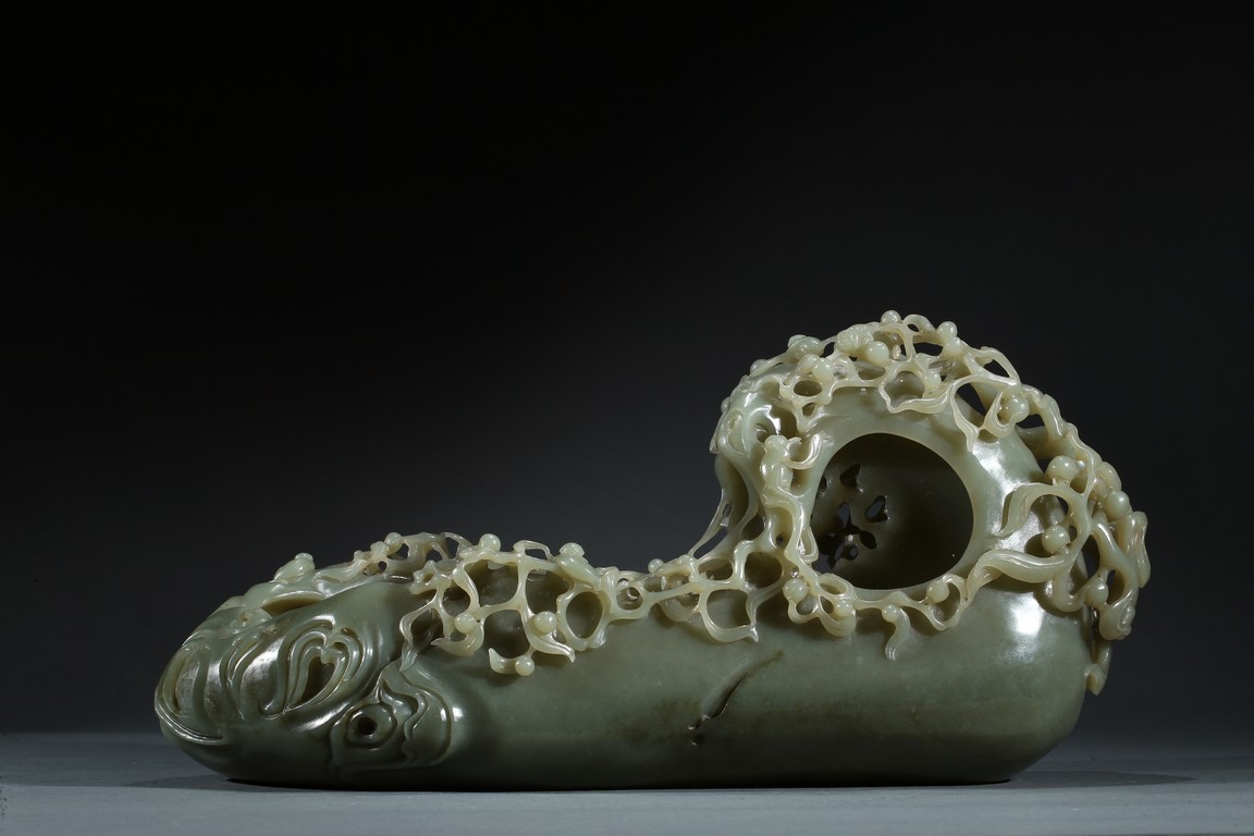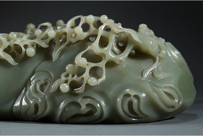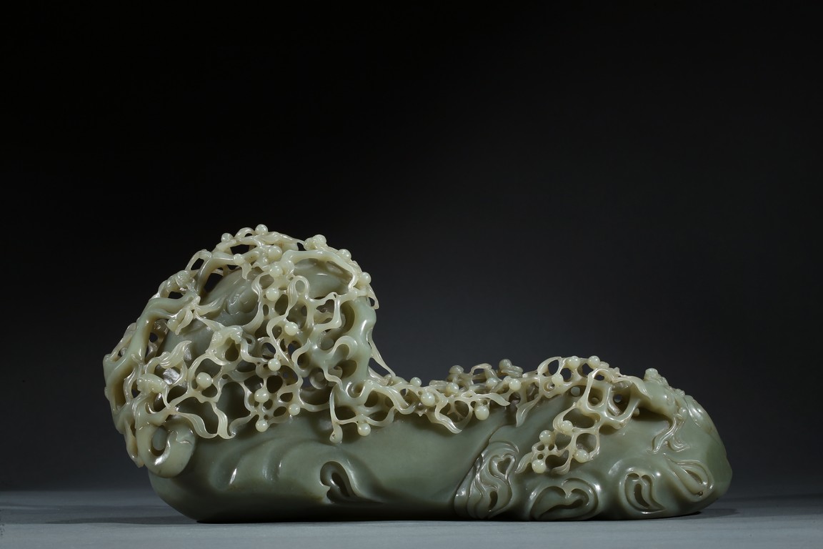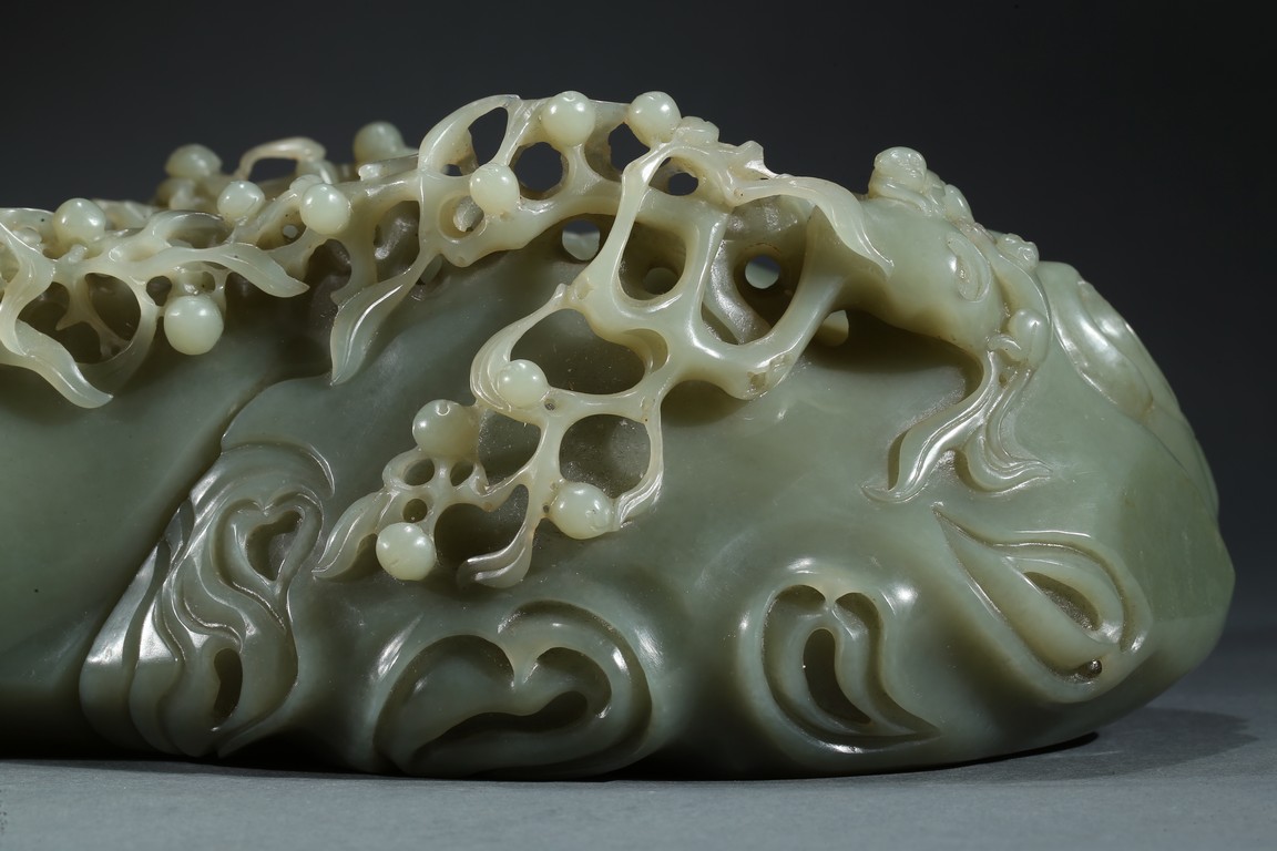 The celadon jade washer is modelled in the form of a large hollow rock with one end rising upward, the exterior exquisitely carved with meandering peach stems with leafy peaches and monkeys clambering on the branches. The stone is of greenish celadon tone.