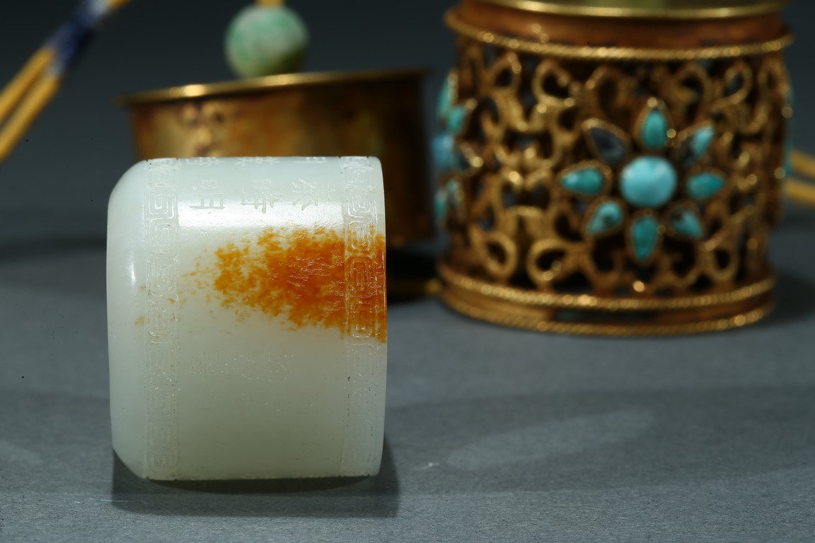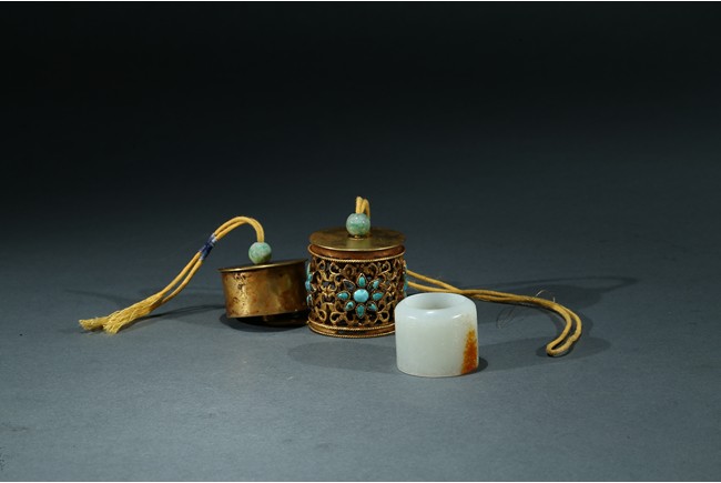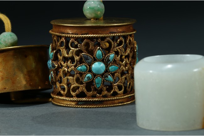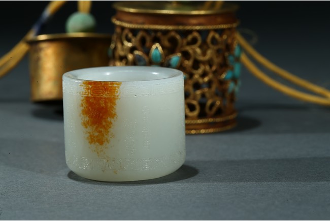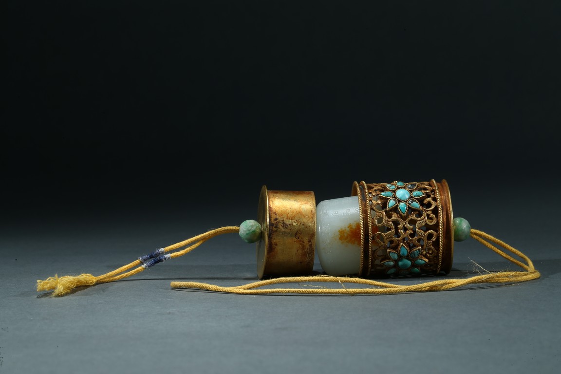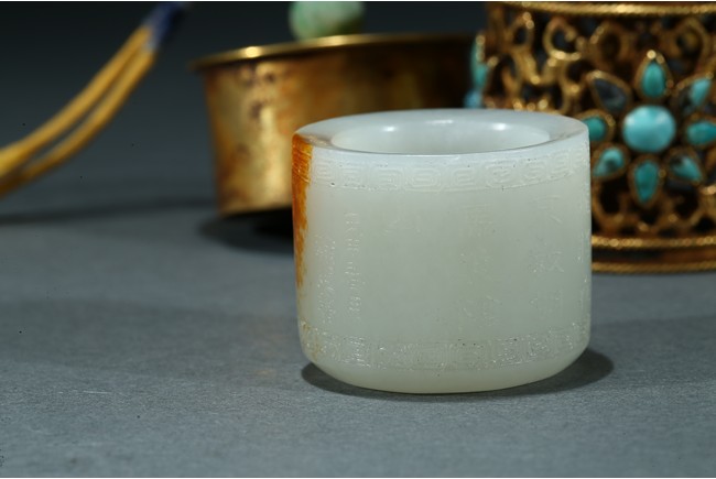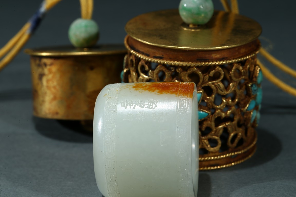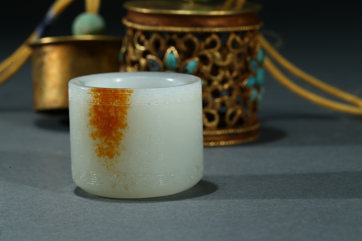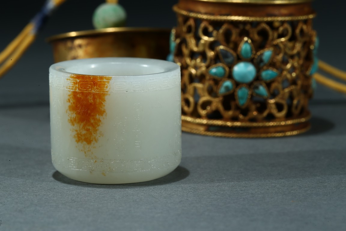The hollowed cylindrical white jade body finely carved around the exterior with inscriptions of imperial poem between two key-fret borders, the stone of white tone with patches of russet inclusions, the ring fitted with a finely reticulated and pierced gilt bronze case embellished with blossoming flowers in turquoise. Qing Dynasty period.