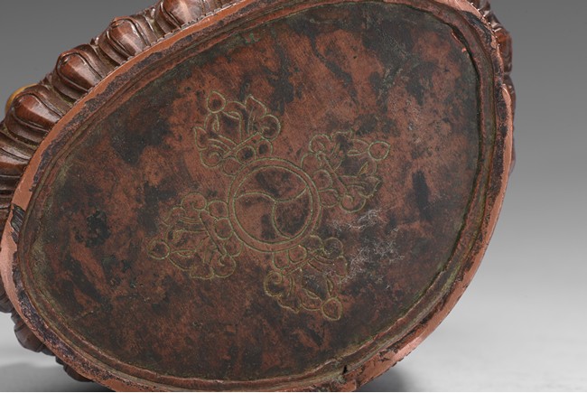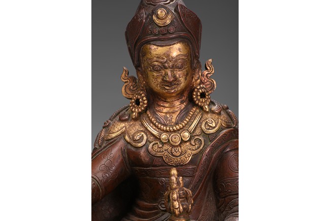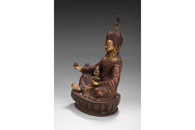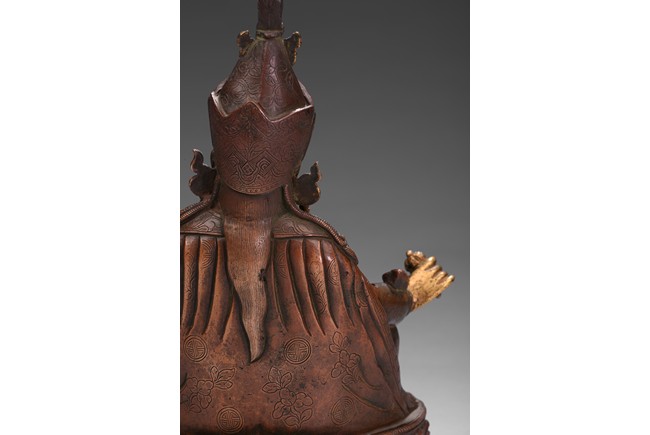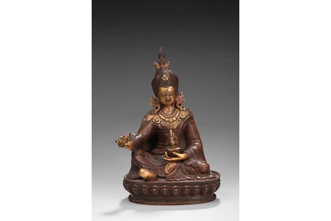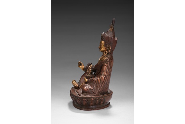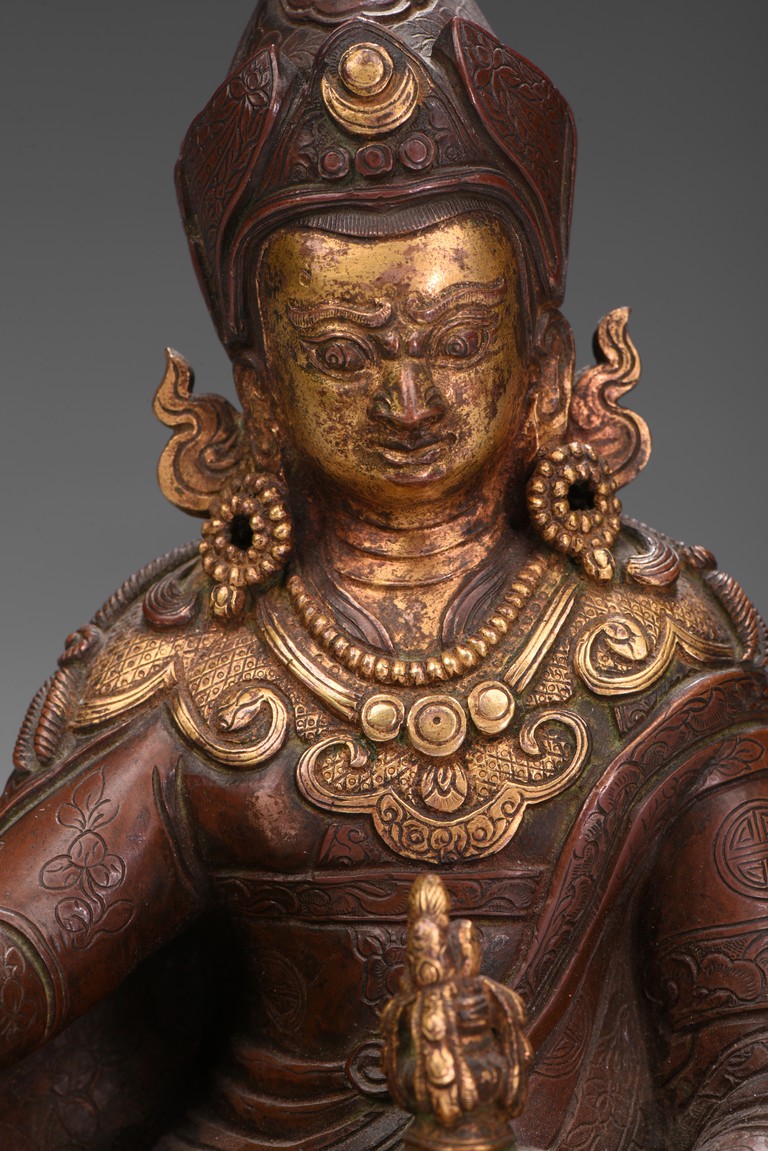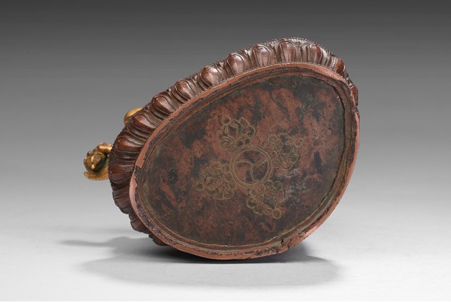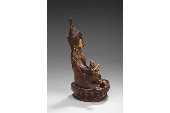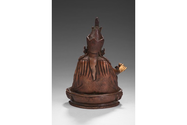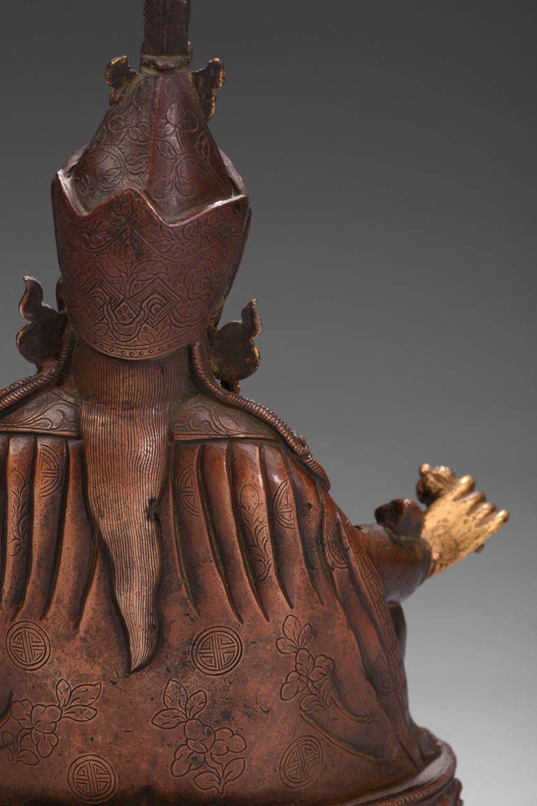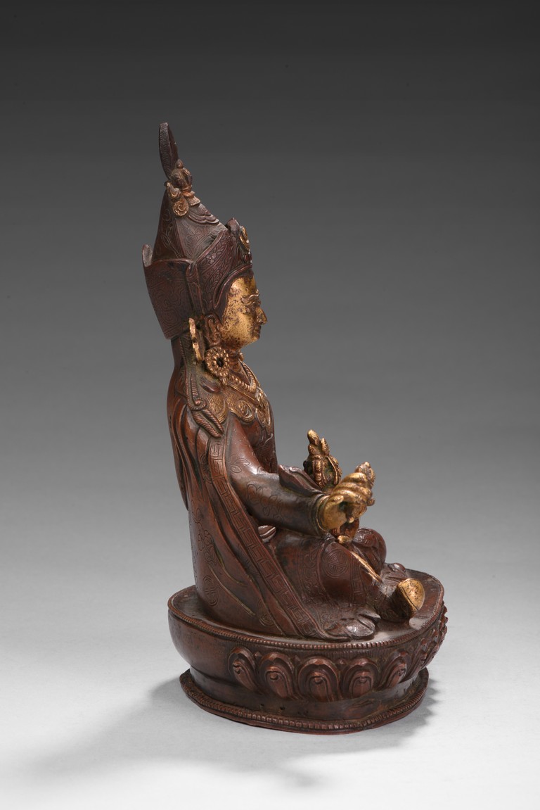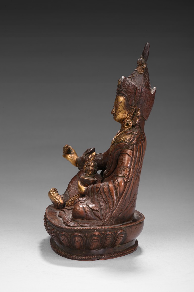 Seated on a lotus base, his hands holding a vajra and kapala, dressed in various garments and wearing his specific headdress, parcel-gilded, base sealed. Qing Dynasty period.