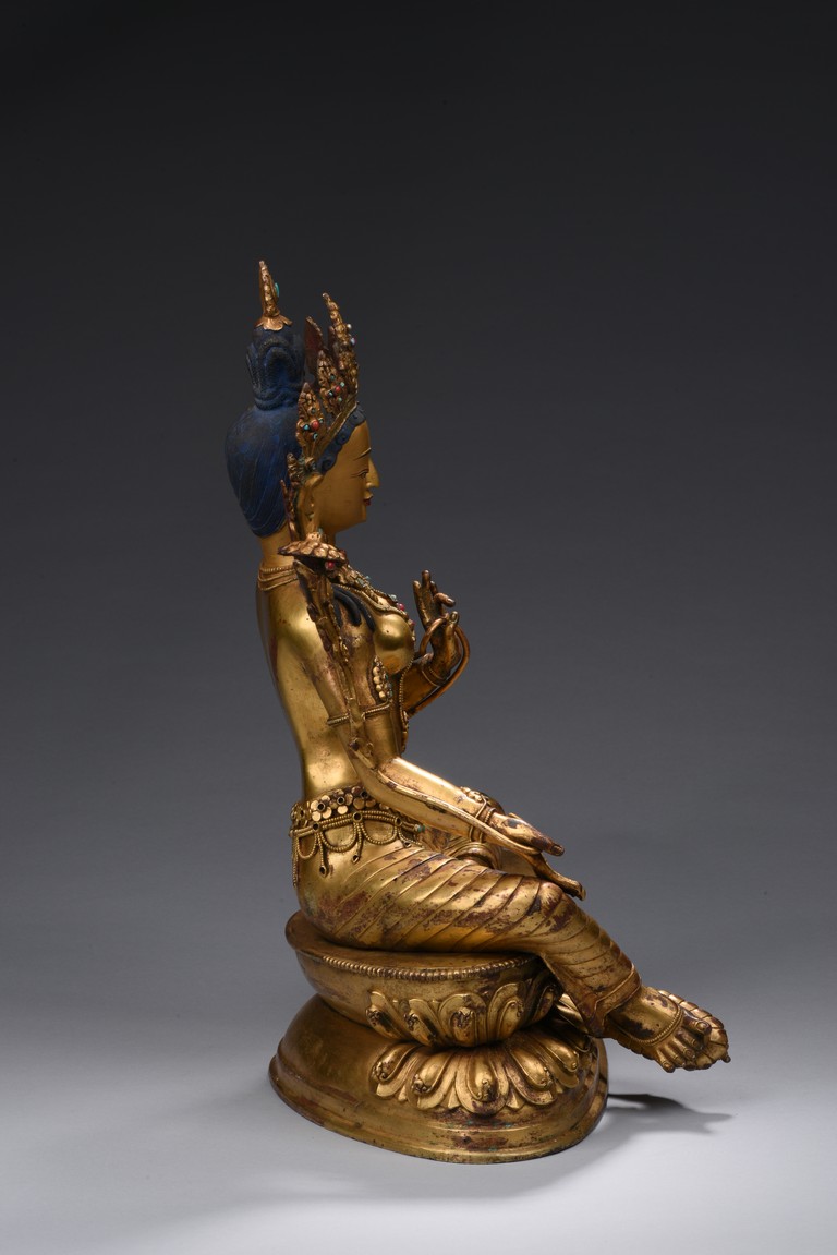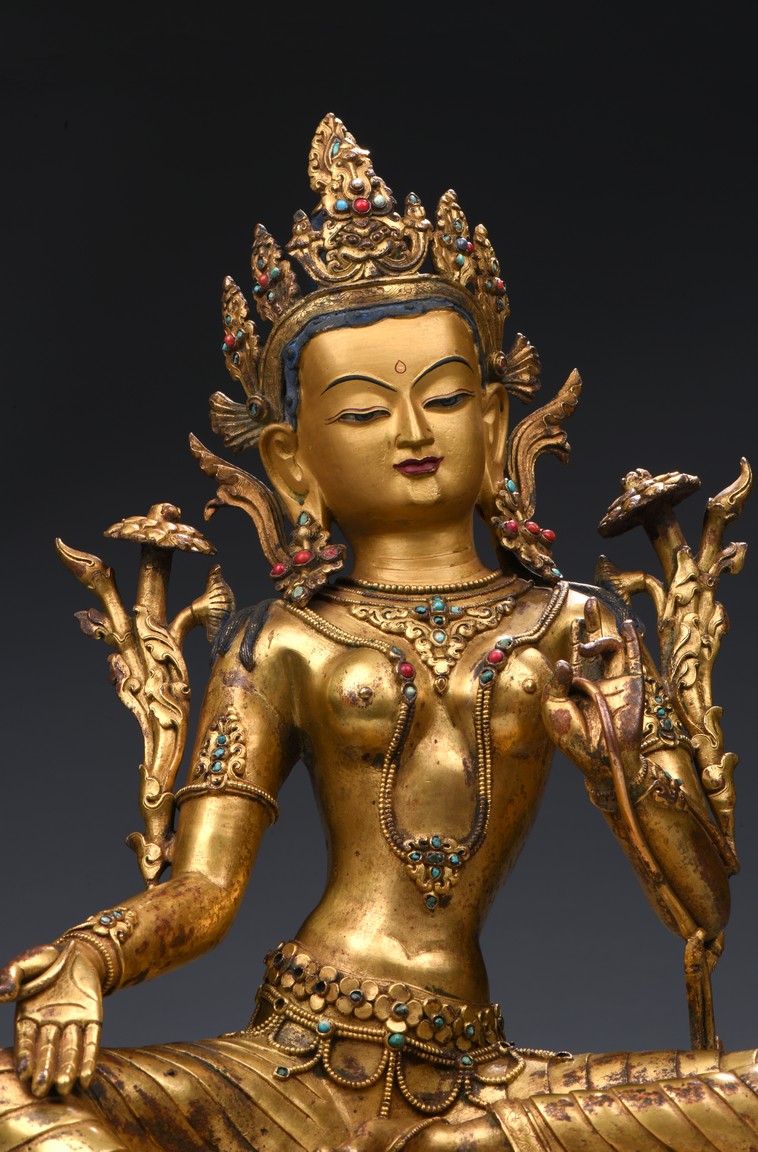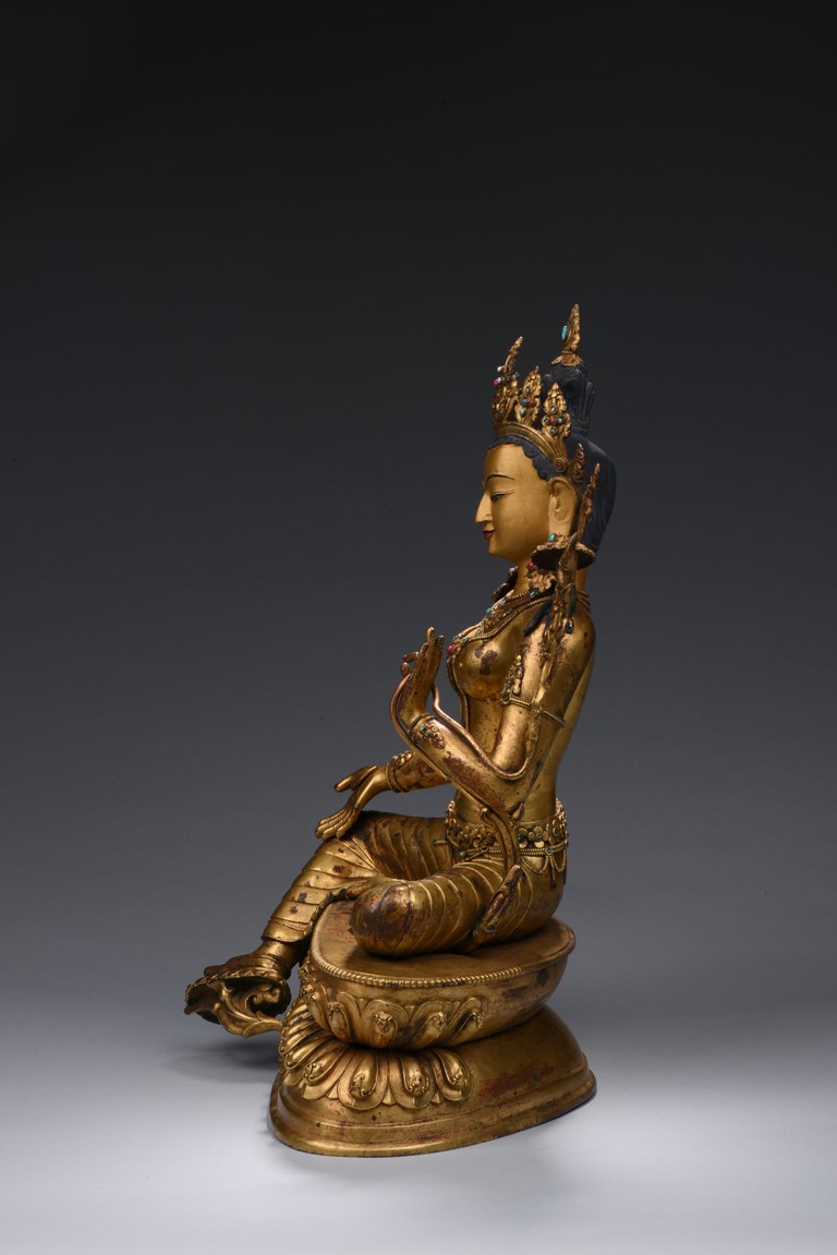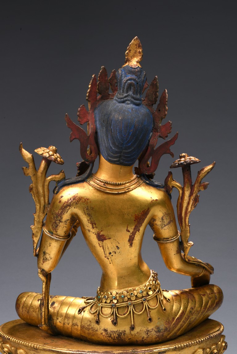 Seated in dhyanasana upon a double-lotus base with beaded rims, the hands in vitarka mudra and lotus stems blossoming at the shoulders, clad in a tight-fitting dhoti and adorned with beaded jewelry and pendant earrings, the face with downcast eyes surmounted by a tiara inlaid with gems, the hair pulled into a high chignon.