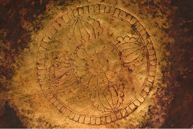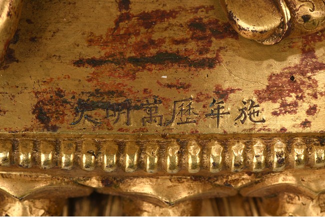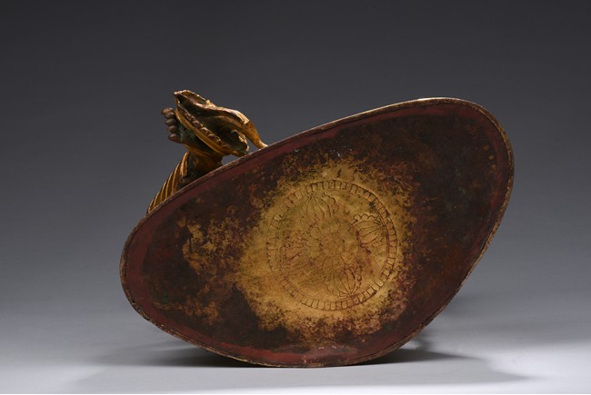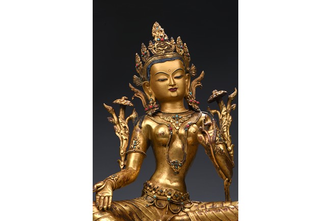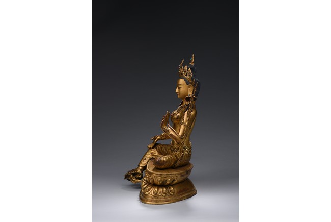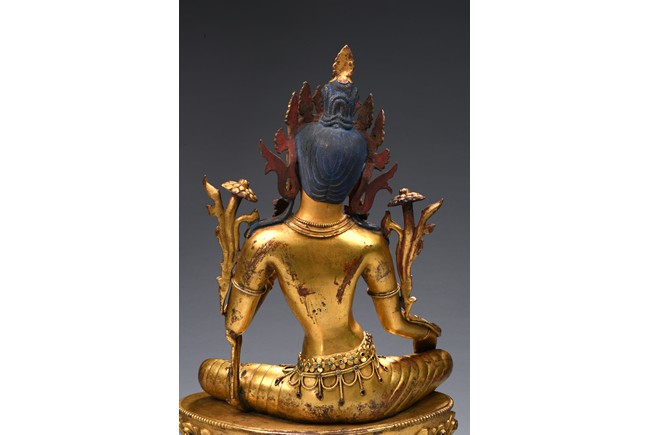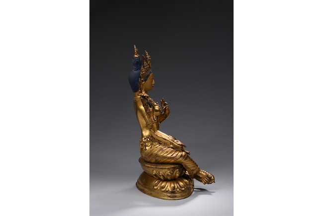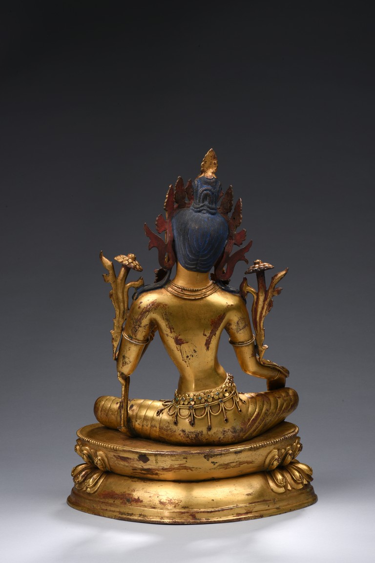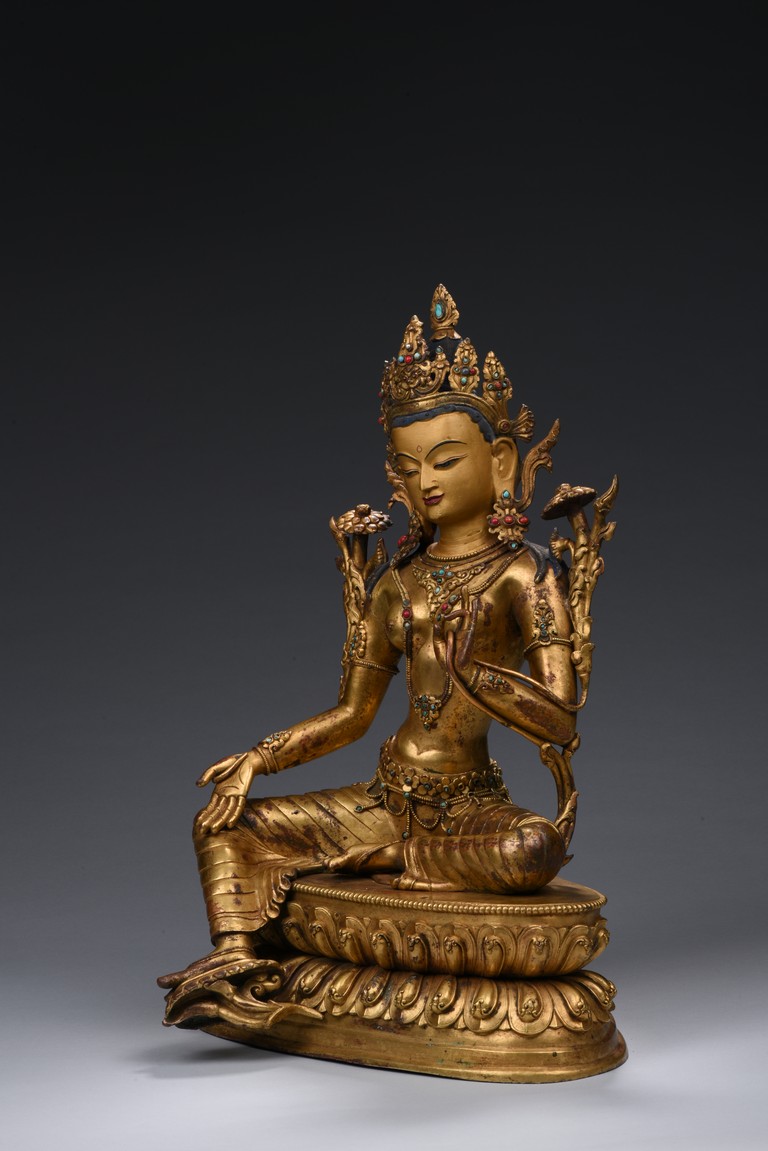 Seated in dhyanasana upon a double-lotus base with beaded rims, the hands in vitarka mudra and lotus stems blossoming at the shoulders, clad in a tight-fitting dhoti and adorned with beaded jewelry and pendant earrings, the face with downcast eyes surmounted by a tiara inlaid with gems, the hair pulled into a high chignon.