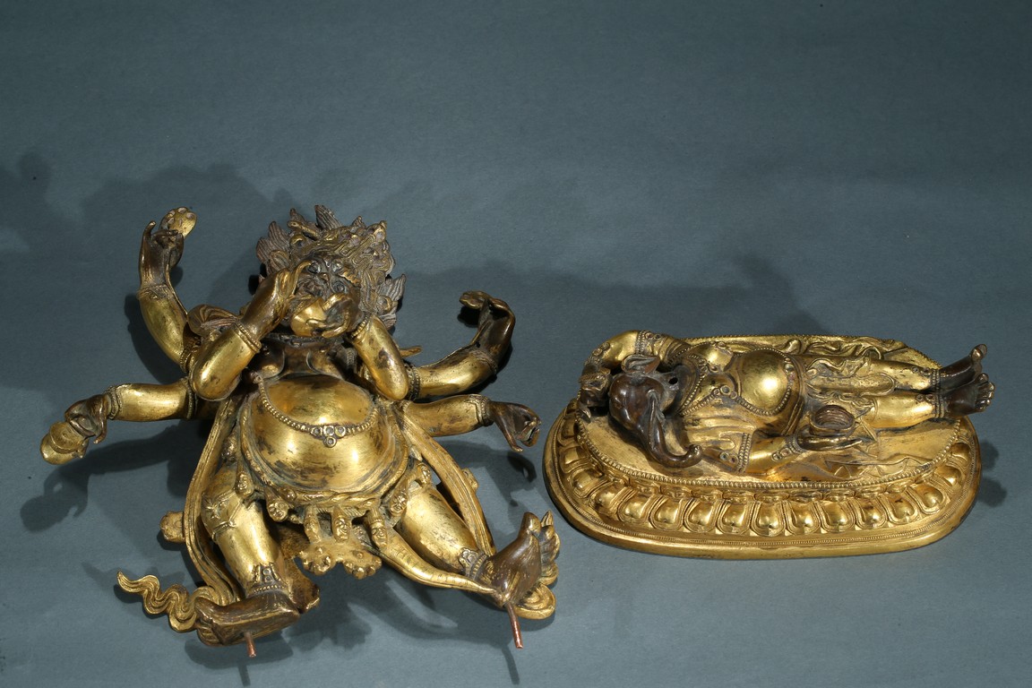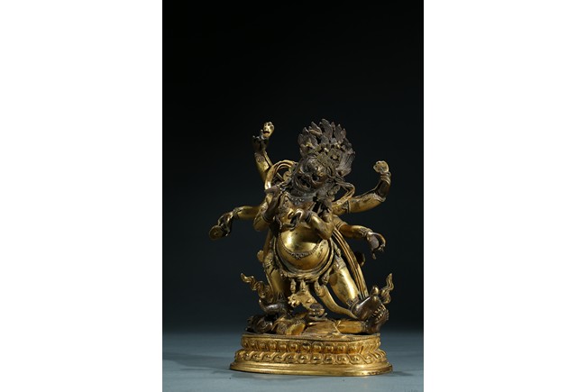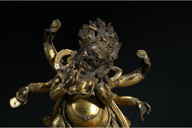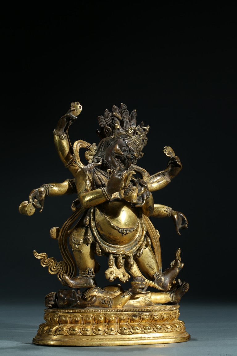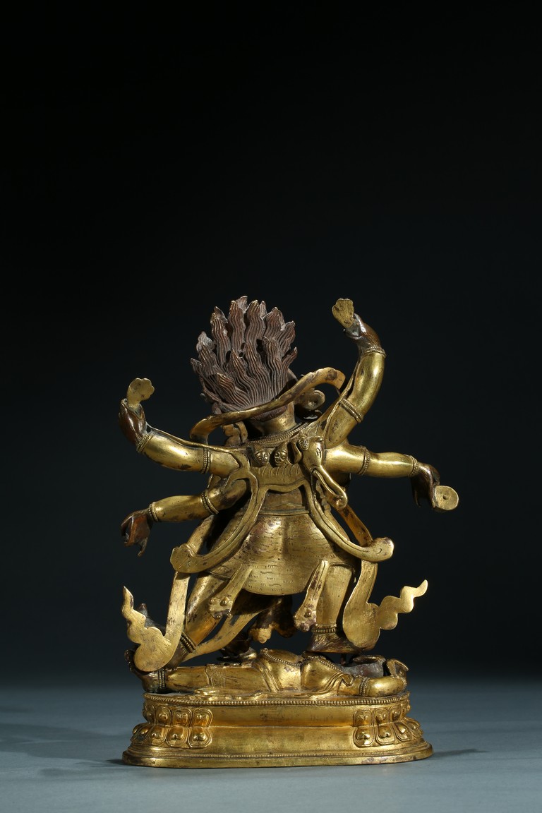 Please refer to a similar gilt-bronze figure of mahakala, sold in Sotheby's London on November 7, 2007, Lot 299. Provenance: Private collection, Boston. 可參考一類似銅鎏金瑪哈嘎拉立像,售於倫敦蘇富比2007年11月7日,拍品號299。 來源: 波士頓藏家提供